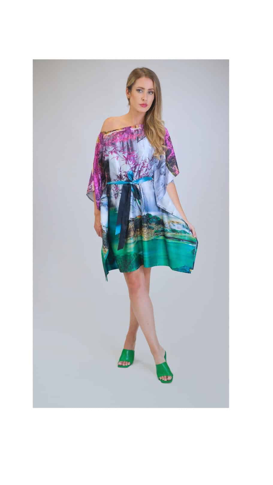Šaty sú navrhnuté v jednoduchom voľnom strihu ktorý sadne na každý typ postavy. Šaty sú vystrihnuté ako jeden štvorec látky ktorý je prepásaný opaskom, čo im dodáva ležérny nádych. Na prvý pohľad šaty pôsobia ako vystrihnuté z antického Grécka. Najvýraznejším na šatách je samozrejme vzor, kde vás upúta Nespútaný vodopád, ktorý hra všetkými farbami prírody. Šaty ľahko kombinujte so zelenými alebo modrými doplnkami.