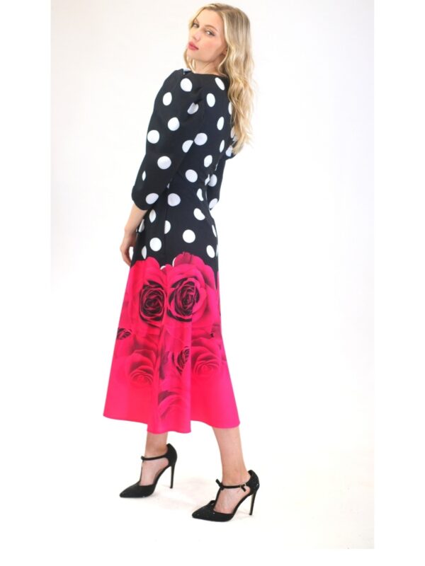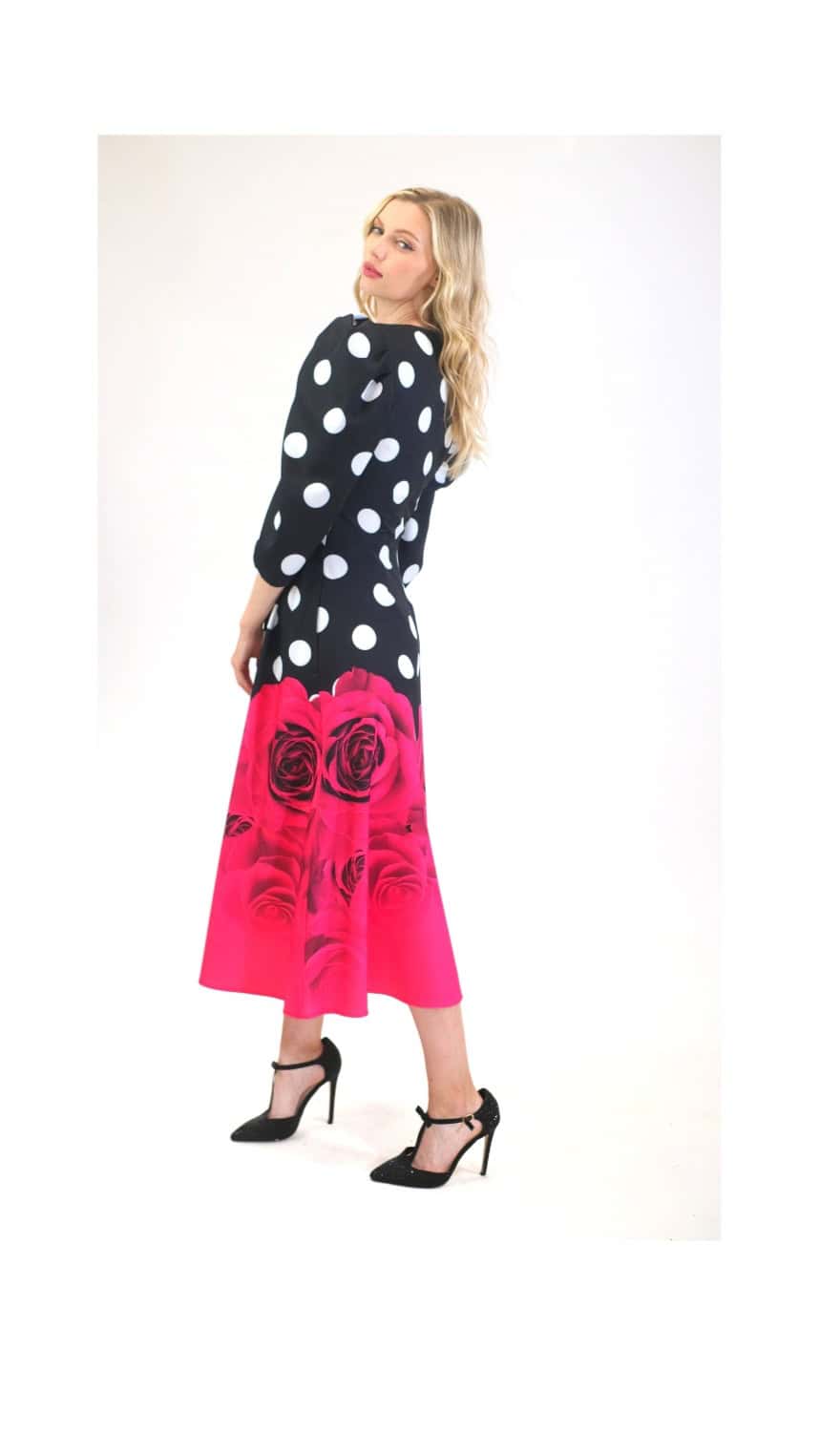 Šaty sú ušité z elastického kostýmového materiálu, ktorý sa prispôsobí vašej postave. Šaty sú prestrihnuté v páse, a nechavajú naplno vyniknúť vašej postave. Zaujímavým detailom na šatách je riasenie rukávov v oblasti pliec. Najvýraznejším prvkom šiat je však vzor, ktorý sa skladá z nesmrteľných bodiek v kombinácii s 3-D ružami vo výraznej cyklaménové tej farbe. Šaty sú navrhnuté v elegantnej midi dĺžke, ktorá vám optický predloží postavu. Šaty sa skvele hodia na všetky oslavy alebo párty, kde chcete vyniknúť a zažiariť.