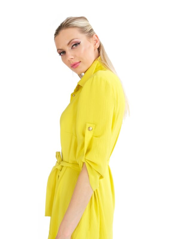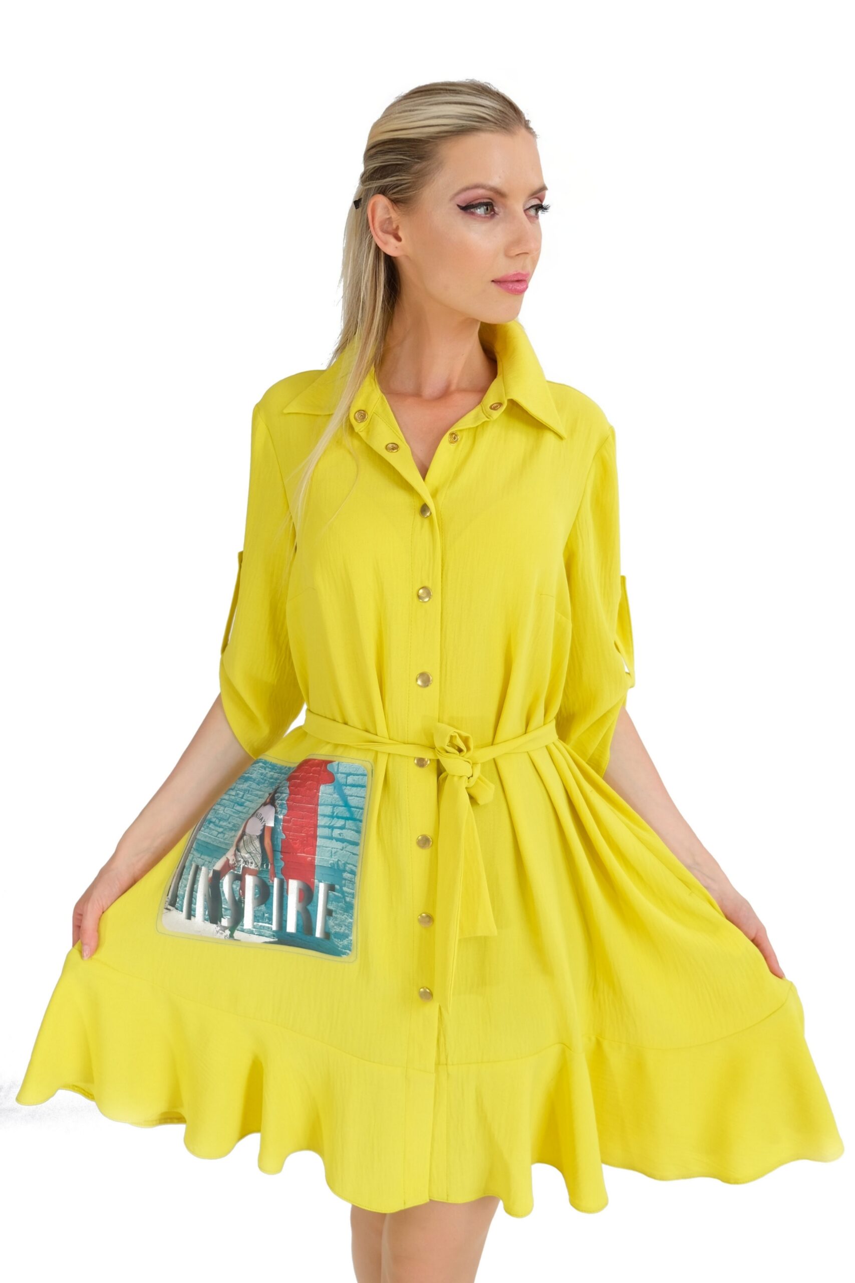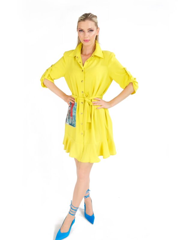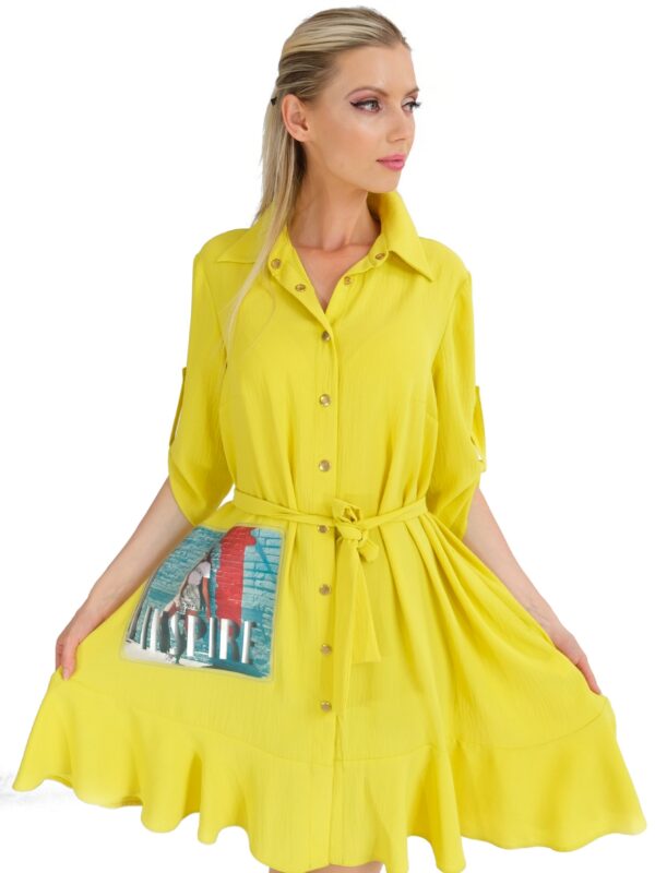 Šaty sú ušité v jednoduchom oversize strihu do áčka, ktorý výborne sadne na každú postavu. Šaty majú funkčné vrecká , čo im dodáva na ležérnosti a kombinujú to najlepšie z áčkových a košeľových strihov. Zaujímavým detailom je našitý volán ako lem na šatách čo im dodáva punc romantickosti. Šaty majú opasok z rovnakého materiálu. Šaty sú ušité v letnej slniečkovo-žltej farbe, ktorá skvele vynikne s tyrkysovými, modrými alebo červenými doplnkami. Šaty majú nášivku na prednom dieli.