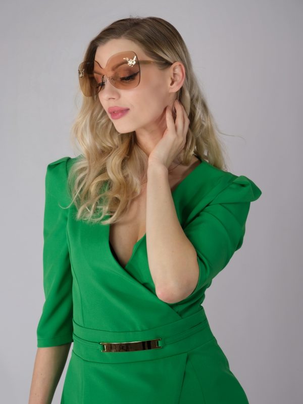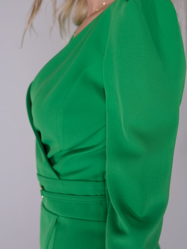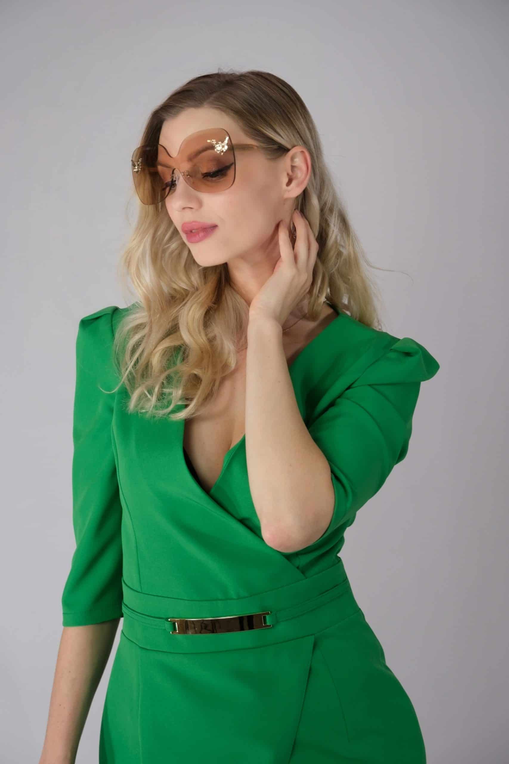 Šaty, ktoré boli navrhnuté s dôrazom na eleganciu, ktorá Vám nechá vyniknúť aj v kancelárii aj na oslave. Šaty majú puzdrový zvinovací strih prestrihnutý v páse, ktorý výborne sadne a vytvaruje postavu. Šaty sú ušité vo výraznej zelenej farbe, ktorá v kombinácii so zlatou sponou na opasku dodáva šatám punc elegancie. Šaty vynosíte do práce a so zlatými doplnkami aj do spoločnosti.