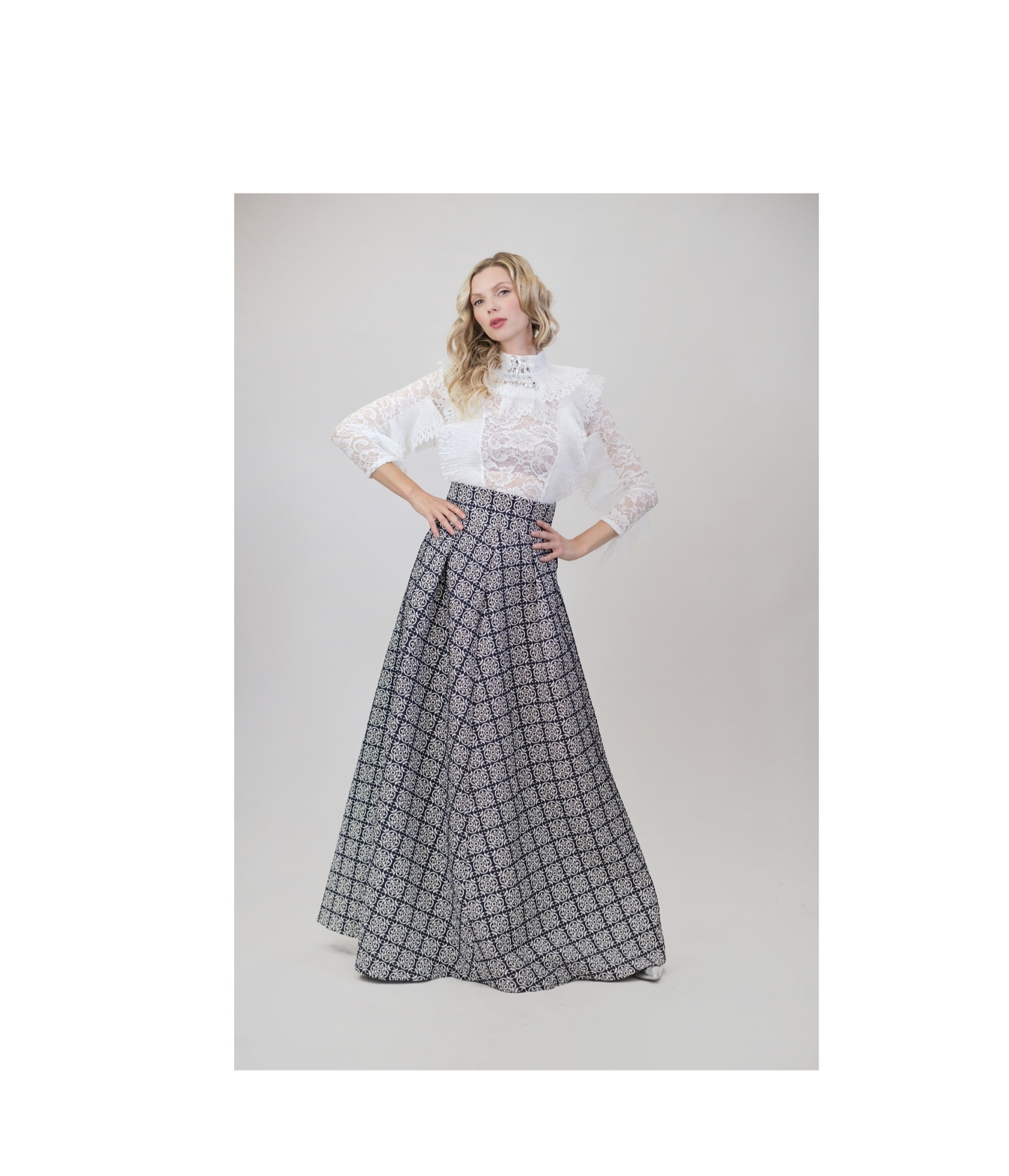 Sukňa je navrhnutá v jednoduchom áčkovom strihu. Sukňa má zvýšený pas, ktorý pevne obomkne vašu postavu a zdôrazní pás. Čo je vyšívaná zlatými nitkami a výborne sa hodí na spoločenské udalosti. Sukňa má zaujímavý barokový motív, v ktorom dominuje tmavomodrý podklad so striebornými prvkami. Sukňu kombinujte s úzkym topom ako naša aranžérka pre wow efekt.