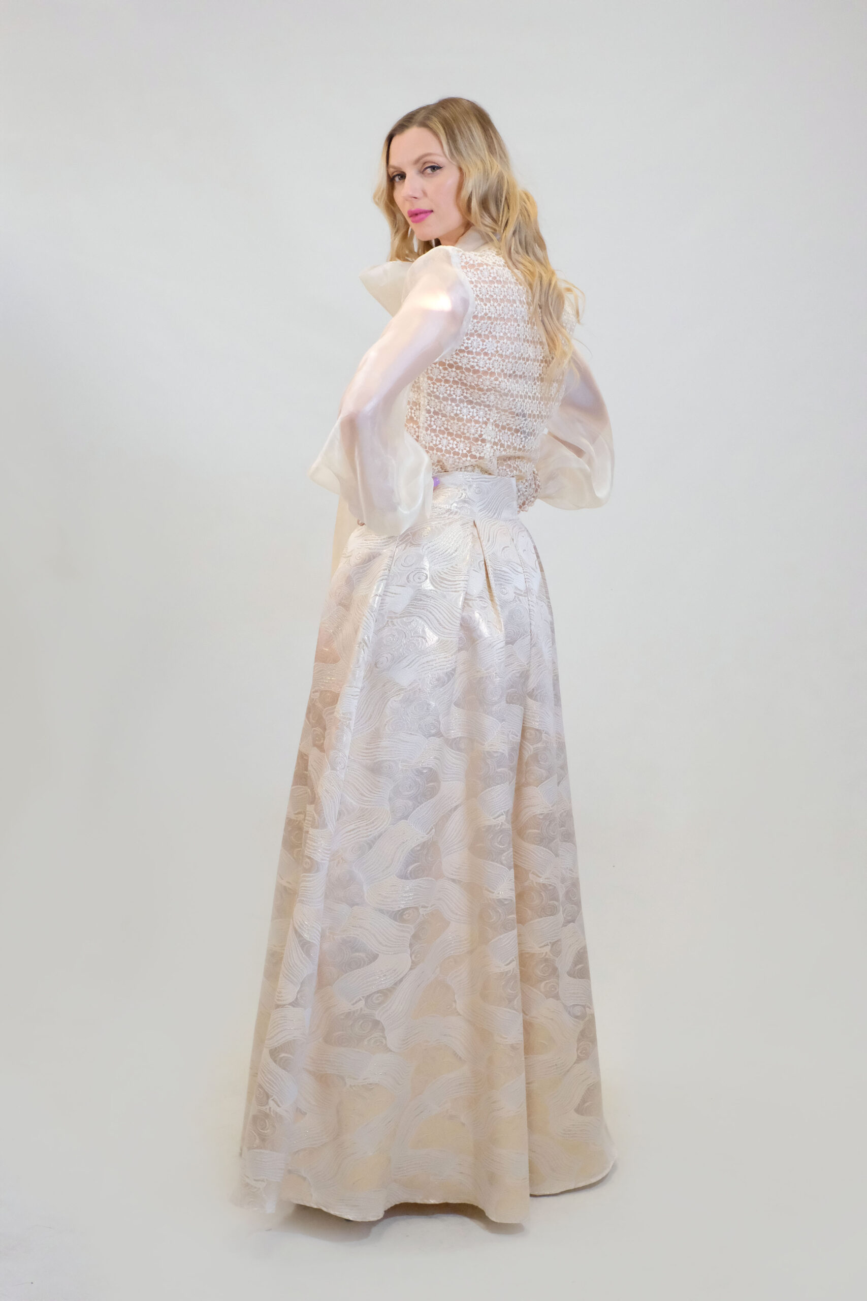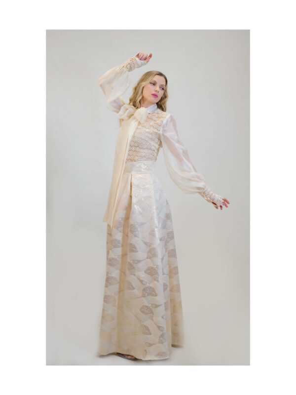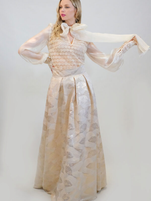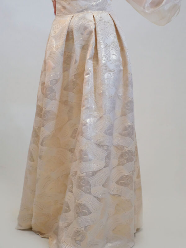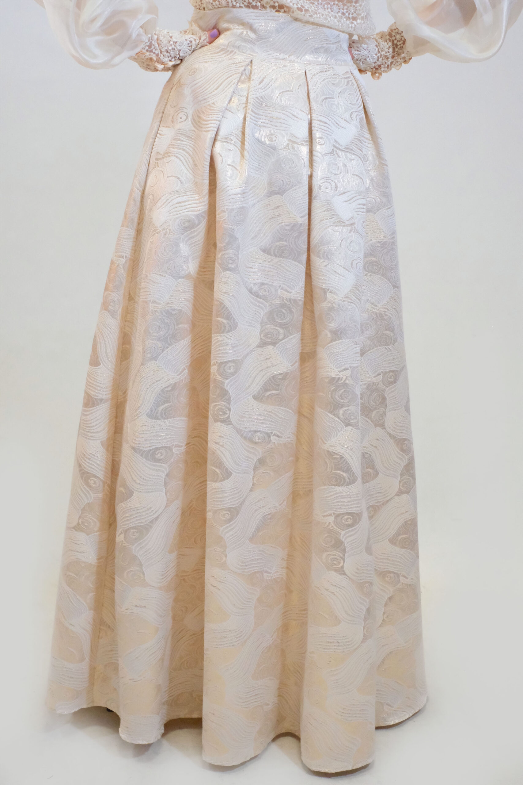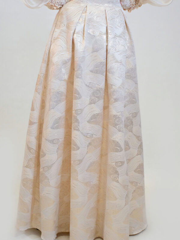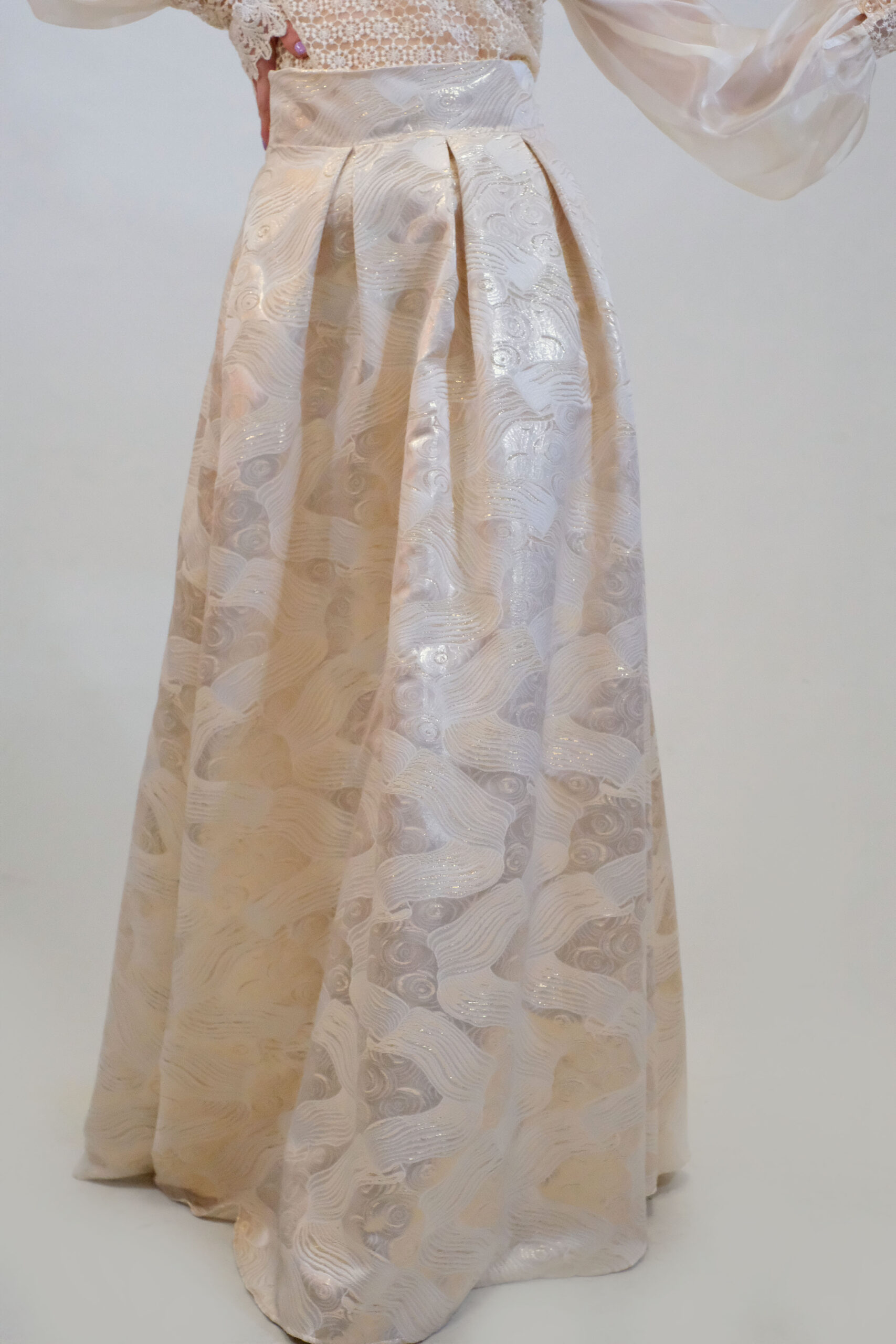 Sukňa je navrhnutá v jednoduchom áčkovom strihu so zvýraznením pásom. Sukňa má protizáhyby, ktoré jej dodávajú šmrnc a nechajú vyniknúť pevný, stojatý materiál. Sukňa je ušitá z nádhernej smotanovo-zlatej látky, ktorá sa leskne na svetle. V látke je skrytý jemný vzor listová a vĺn, ktorý podčiarkuje eleganciu sukňe. Sukňu kombinujte s topmi rôznych farieb pre vytvorenie nádherných spoločenských outfitov.