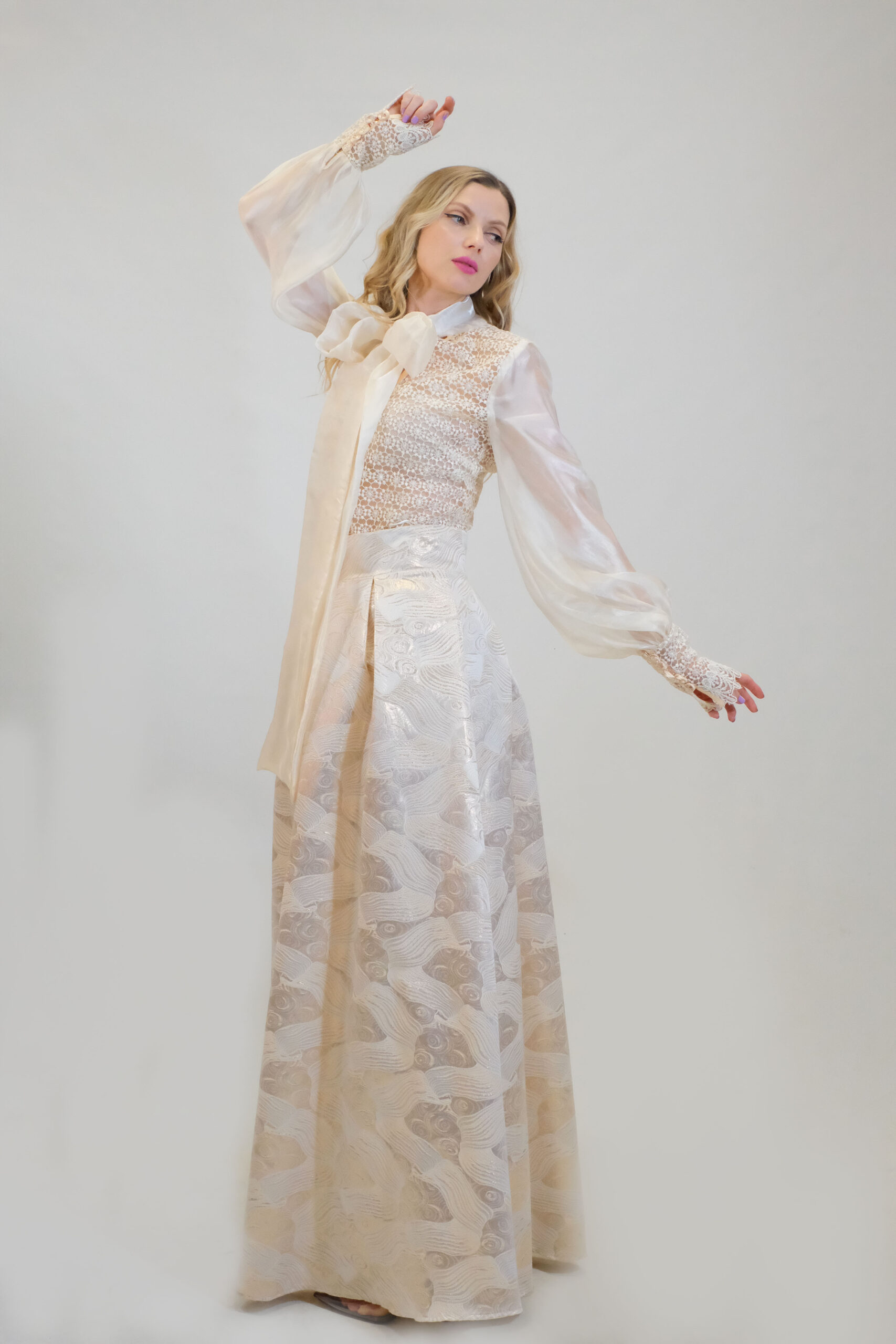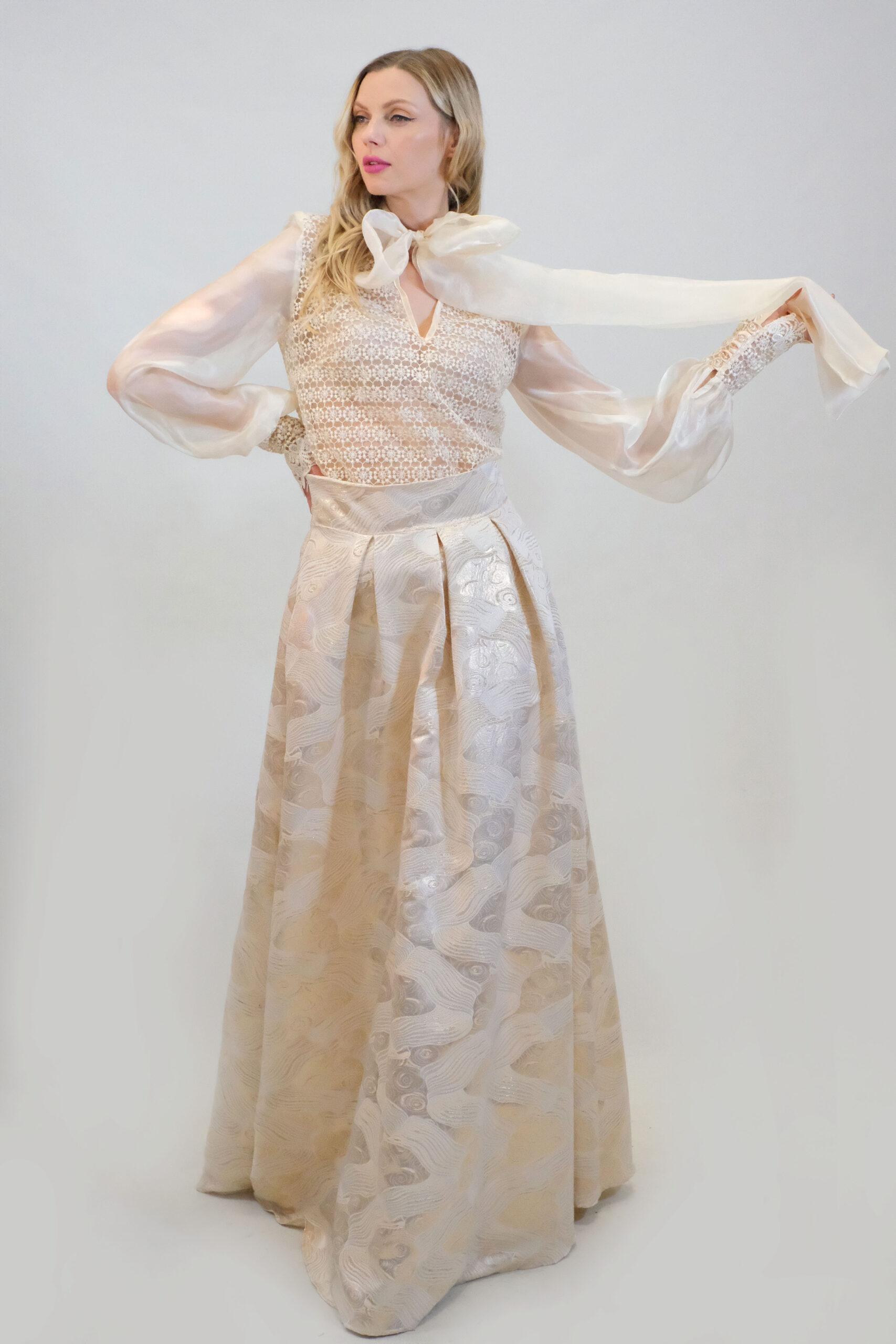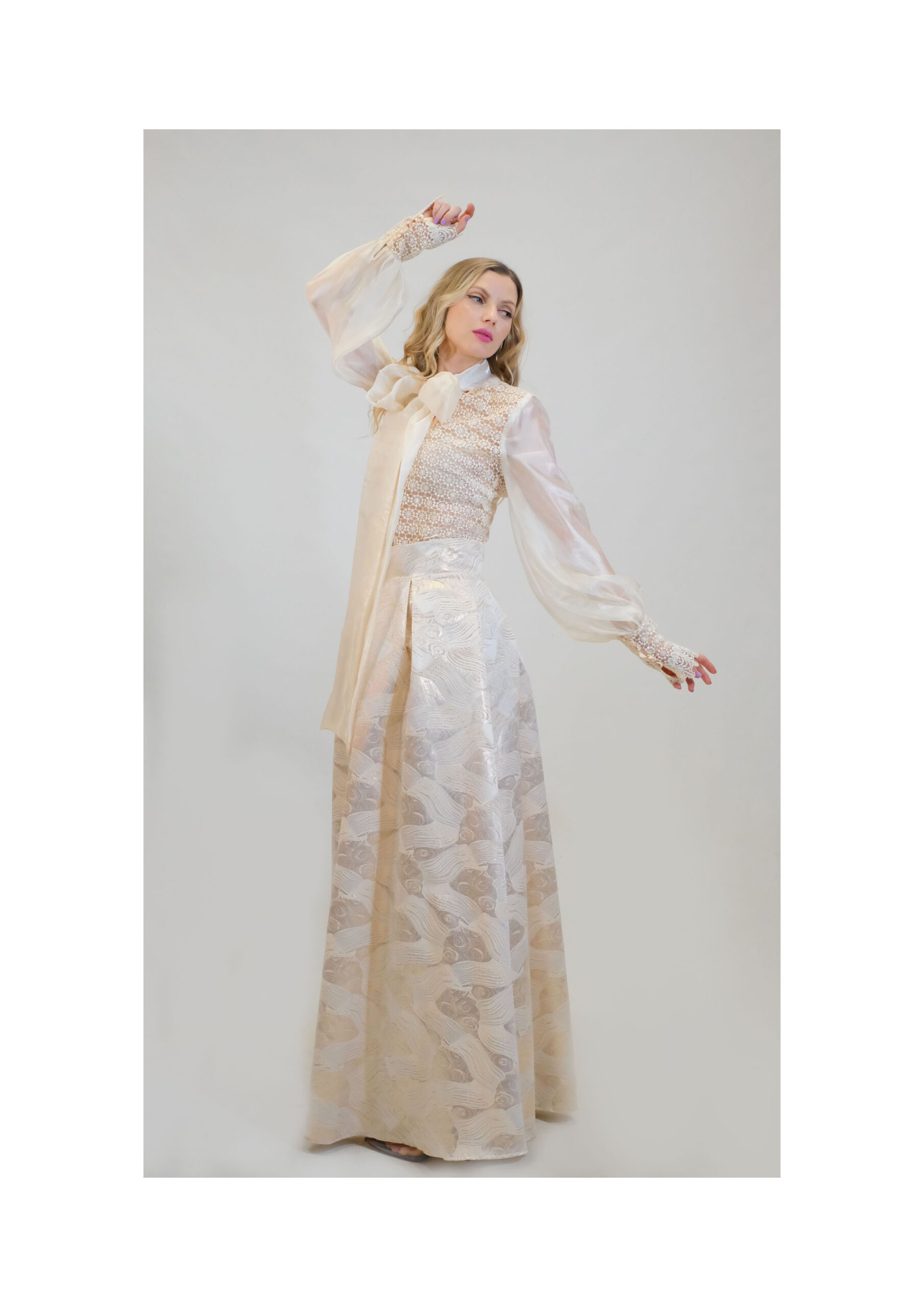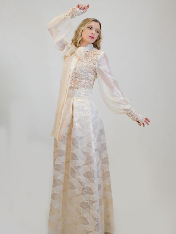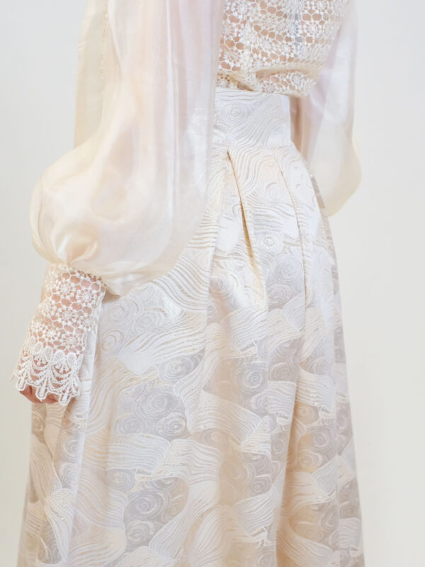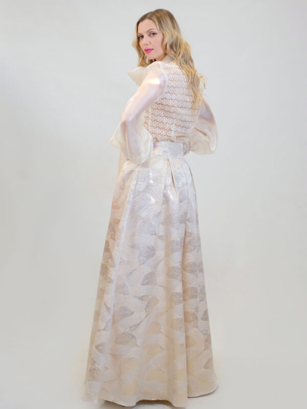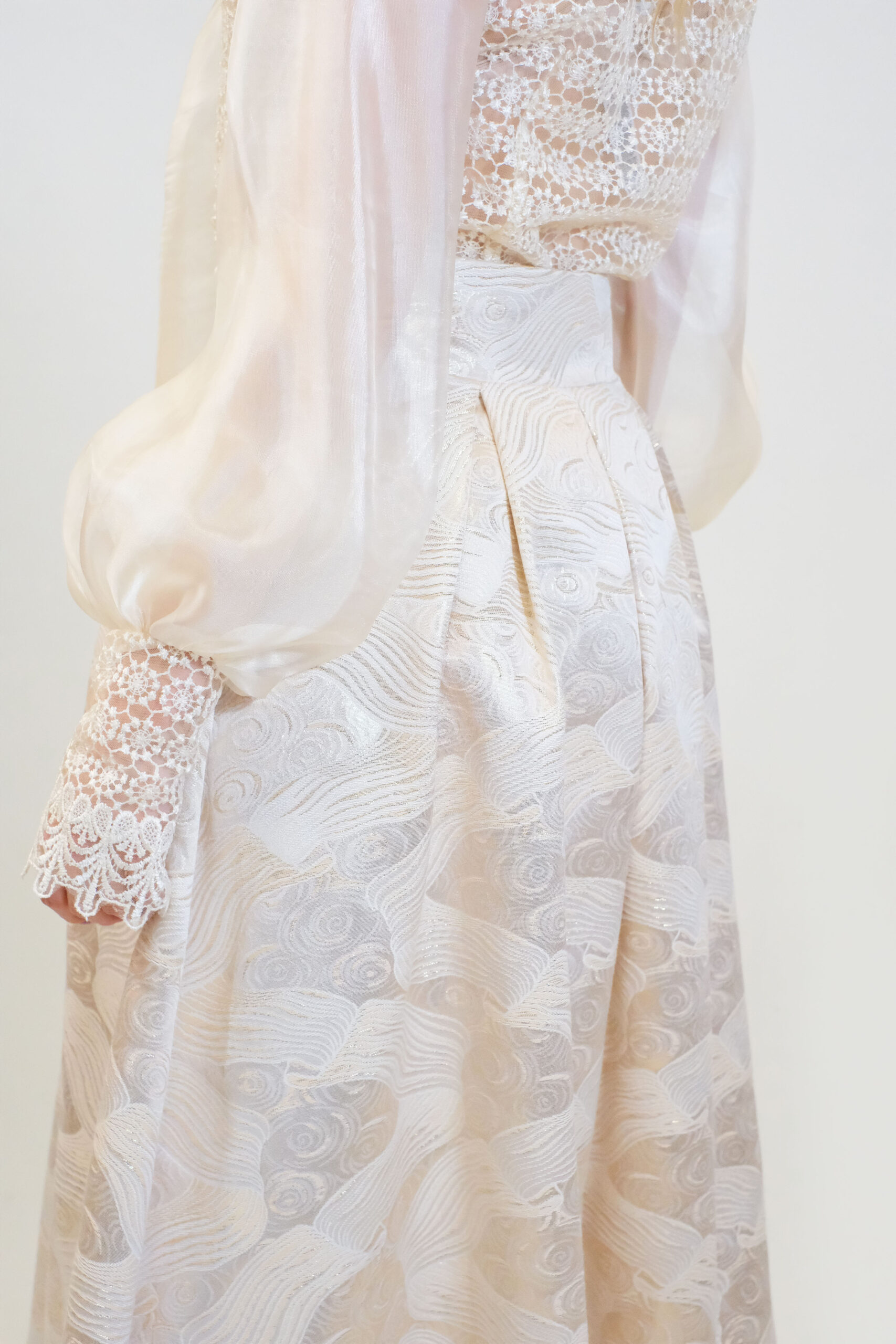 Sukňa je navrhnutá v jednoduchom áčkovom strihu so zvýraznením pásom. Sukňa má protizáhyby, ktoré jej dodávajú šmrnc a nechajú vyniknúť pevný, stojatý materiál. Sukňa je ušitá z nádhernej smotanovo-zlatej látky, ktorá sa leskne na svetle. V látke je skrytý jemný vzor listová a vĺn, ktorý podčiarkuje eleganciu sukňe. Sukňu kombinujte s topmi rôznych farieb pre vytvorenie nádherných spoločenských outfitov.