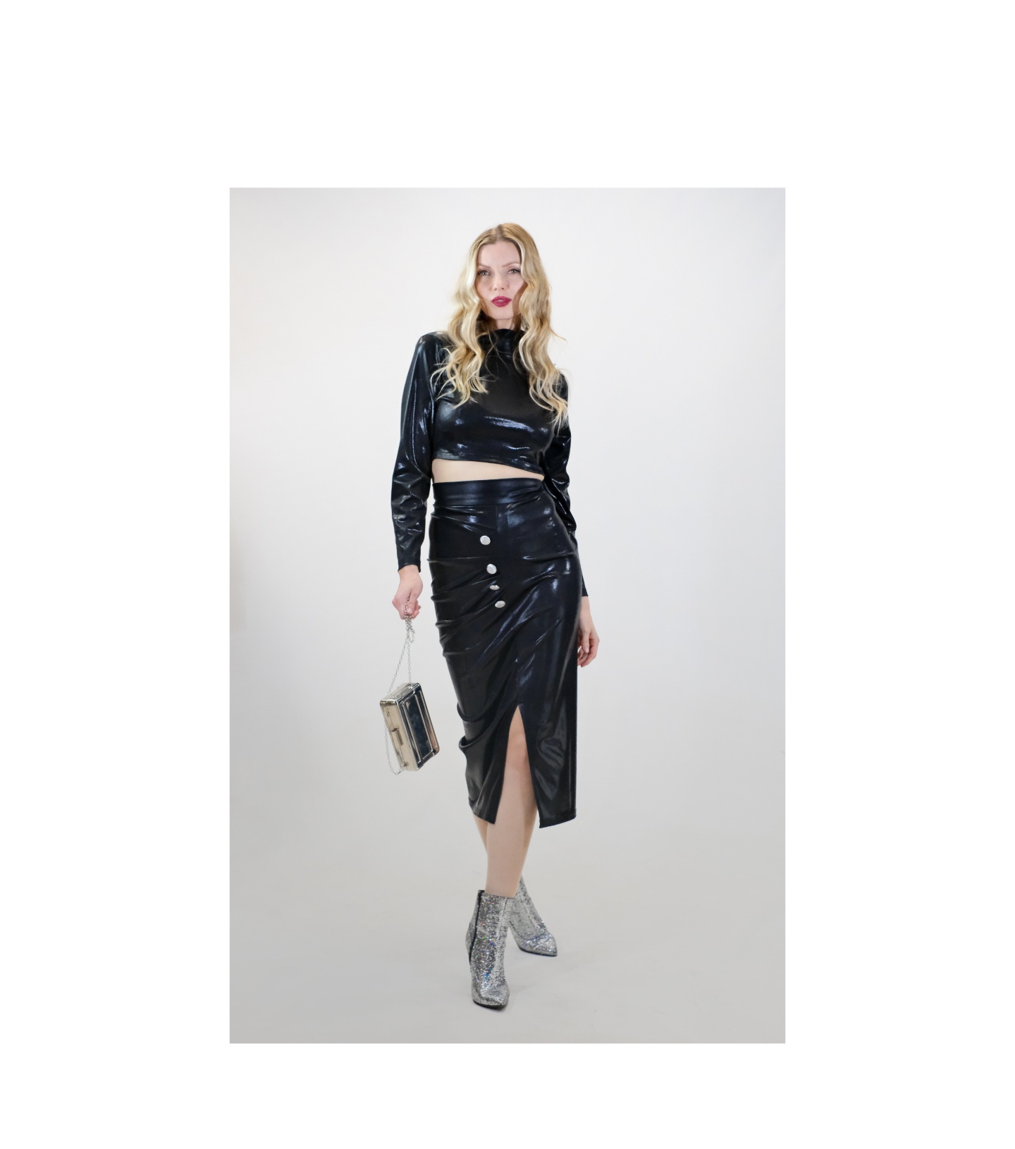 Sukňa je navrhnutá s výnimočného čierneho lesklého materiálu, ktorý sa výborne prispôsobí vašej postave. Sukňa je ušitá v úzkom dubovom strihu, ktorý zdôrazní vaše krivky. Sukňa má rozparok na prednom diely. Zaujímavým detailom na sukni sú ozdobné gombíky a zdôraznený pás. Kombinujte s bielou blúzkou, košeľou alebo ako naša aranžérka s topom Natalie.