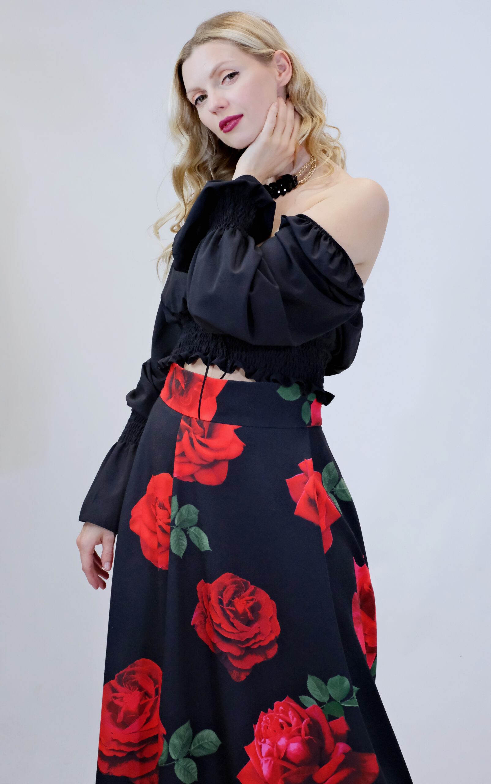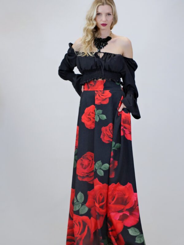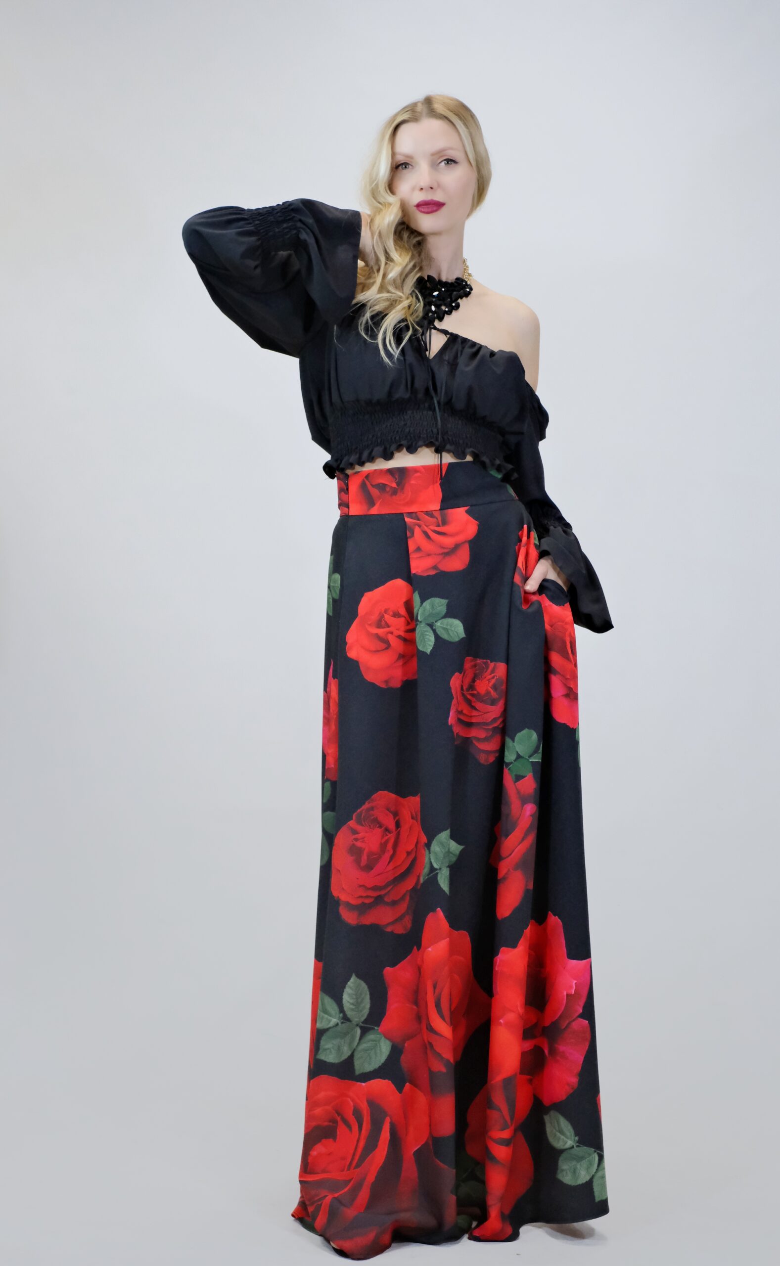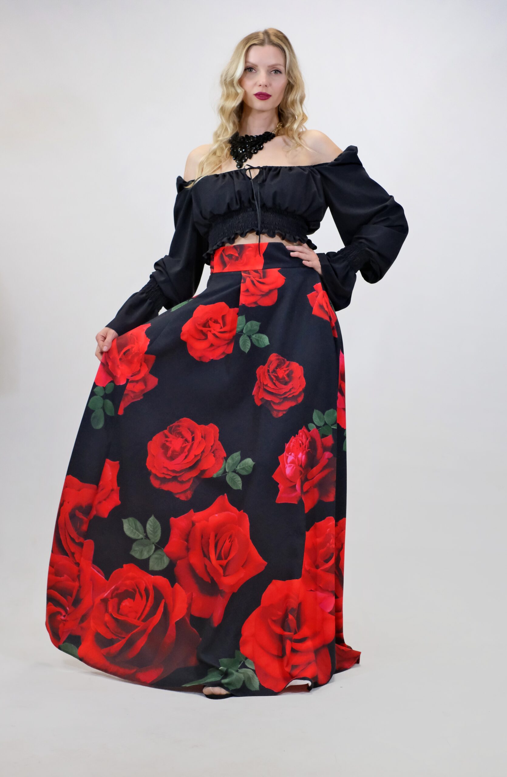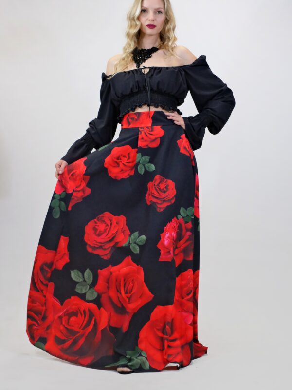 Sukňa je ušitá v jednoduchom strihu, ktorý necháva naplno vyniknúť nádhernému kvetinovému vzoru. Sukňa má zvýšený pás, ktorý vás opticky zoštíhli a zdôrazní kontrast medzi topom a sukňou. Sukňa je ušitá z ľahkého padavé ho materiálu, v ktorom sa budete cítiť ako keby na sebe nič nemáte. Najvýraznejším na sukni je práve Kvetinový vzor ruží. Sukňa sa hodí do spoločnosti a rovnako aj na letnú párty. Kombinujte s červeným alebo čiernymi doplnkami ako naša aranžérka.