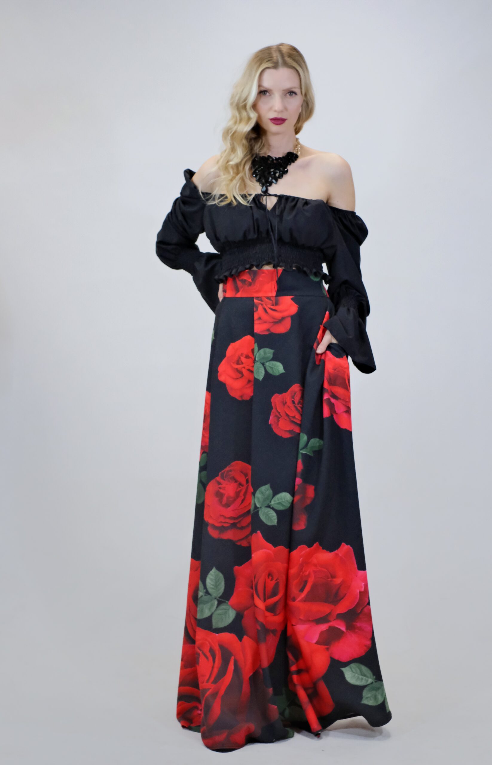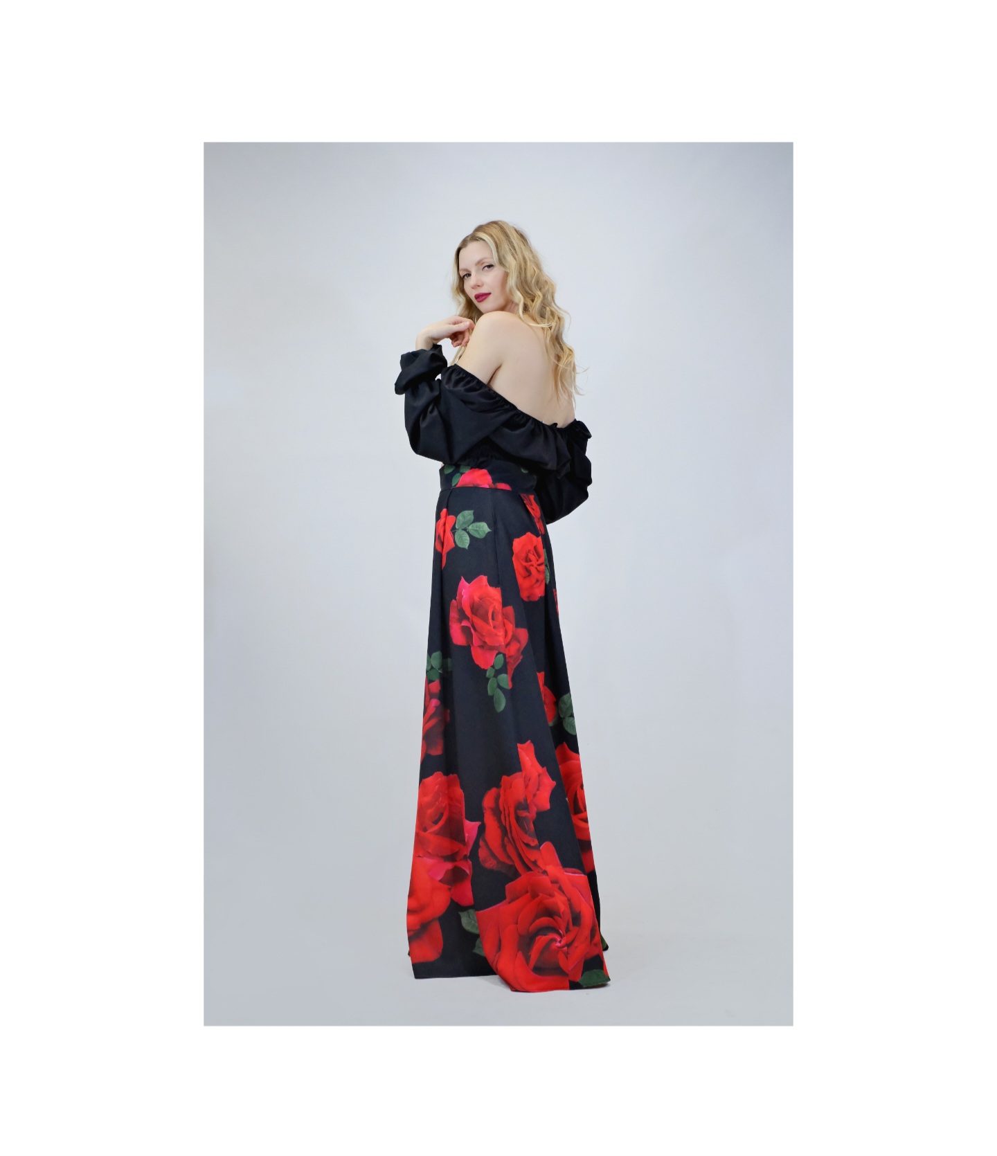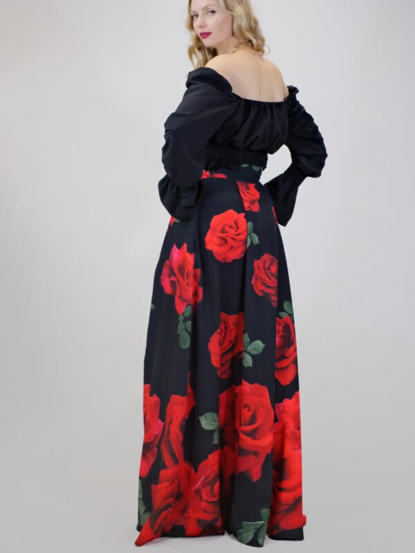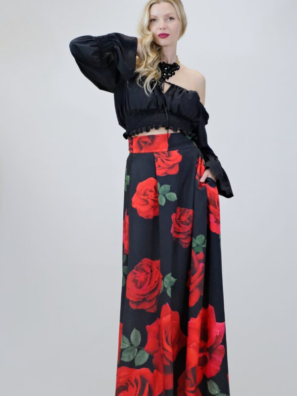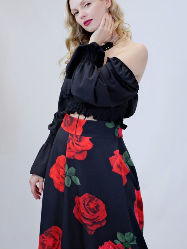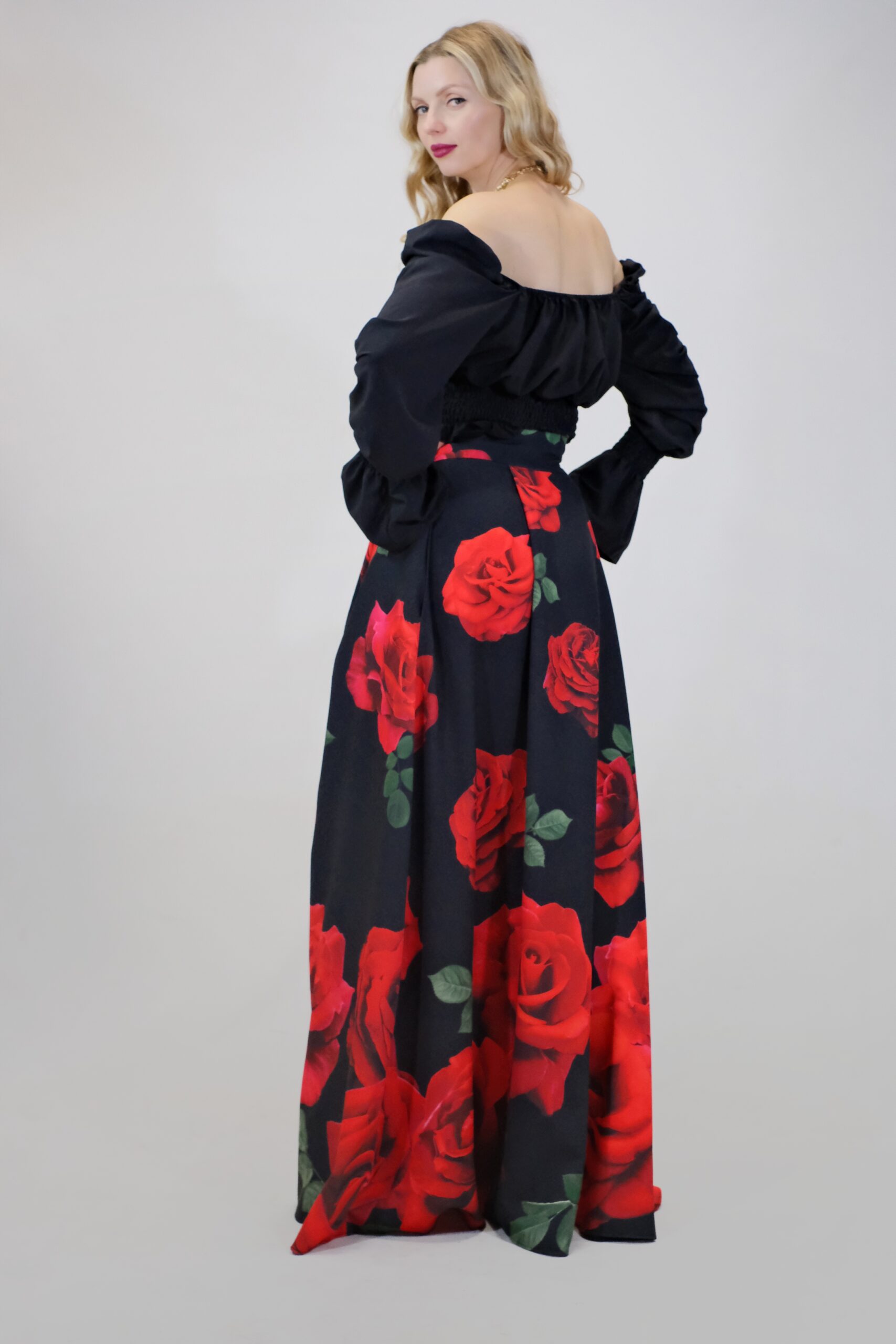 Sukňa je ušitá v jednoduchom strihu, ktorý necháva naplno vyniknúť nádhernému kvetinovému vzoru. Sukňa má zvýšený pás, ktorý vás opticky zoštíhli a zdôrazní kontrast medzi topom a sukňou. Sukňa je ušitá z ľahkého padavé ho materiálu, v ktorom sa budete cítiť ako keby na sebe nič nemáte. Najvýraznejším na sukni je práve Kvetinový vzor ruží. Sukňa sa hodí do spoločnosti a rovnako aj na letnú párty. Kombinujte s červeným alebo čiernymi doplnkami ako naša aranžérka.