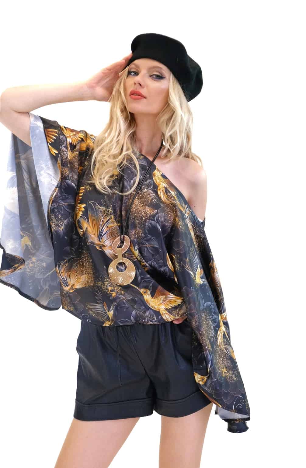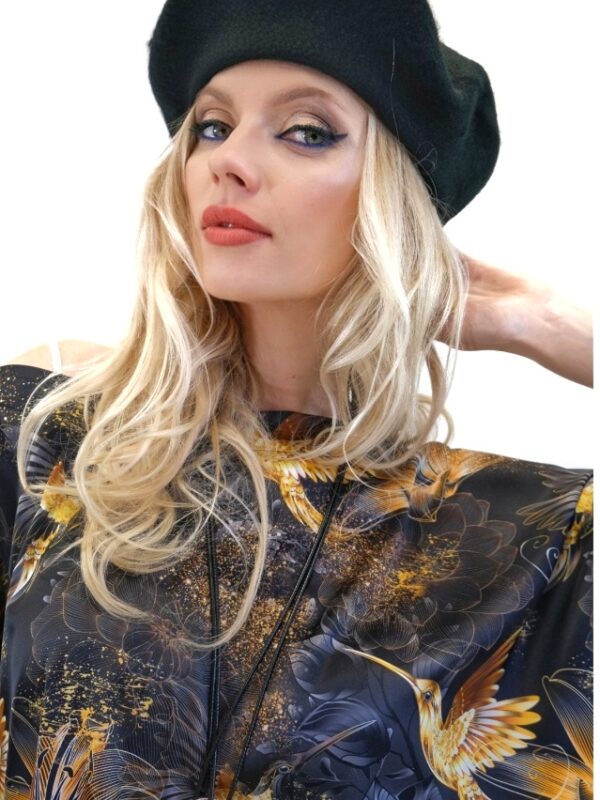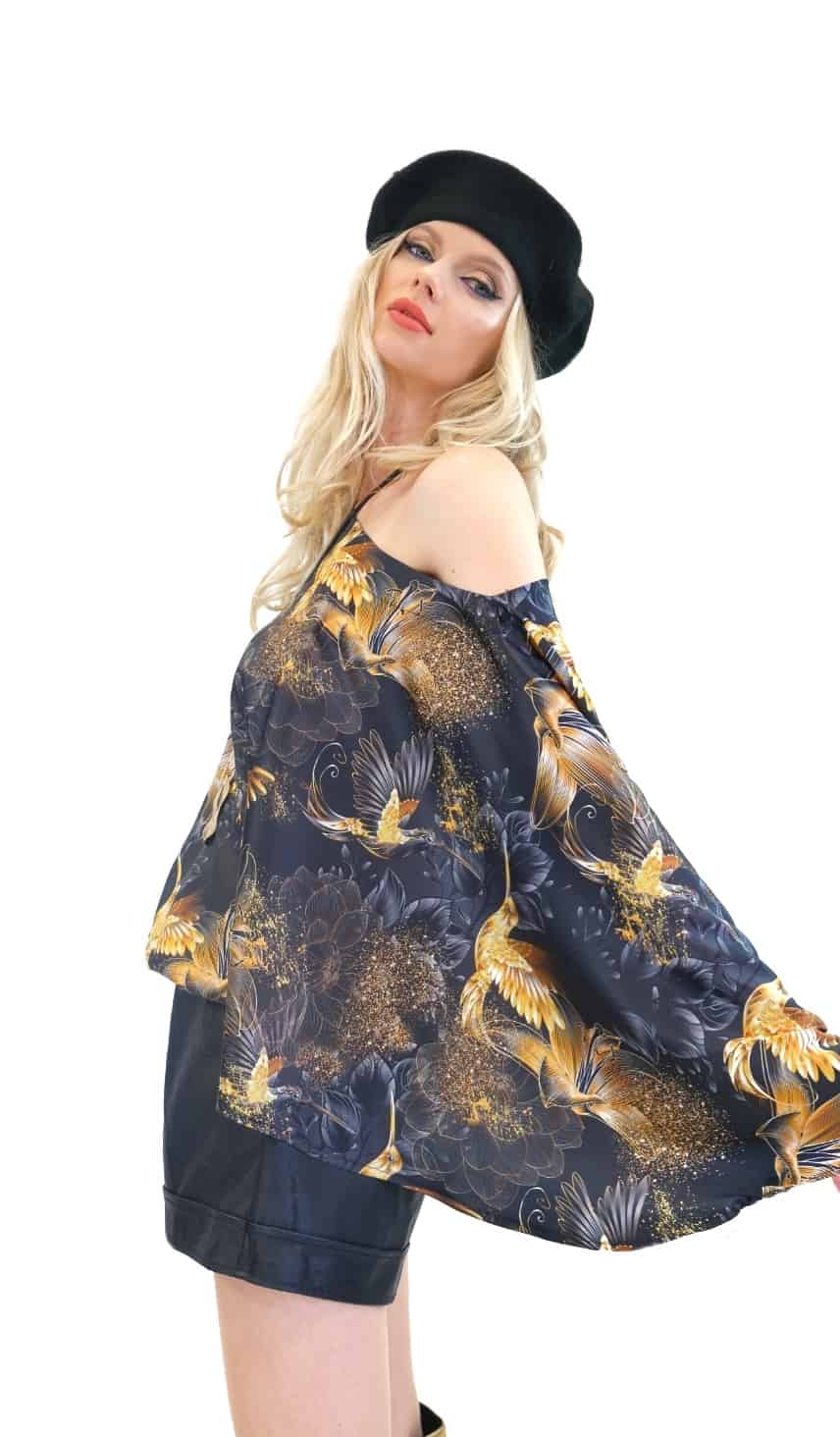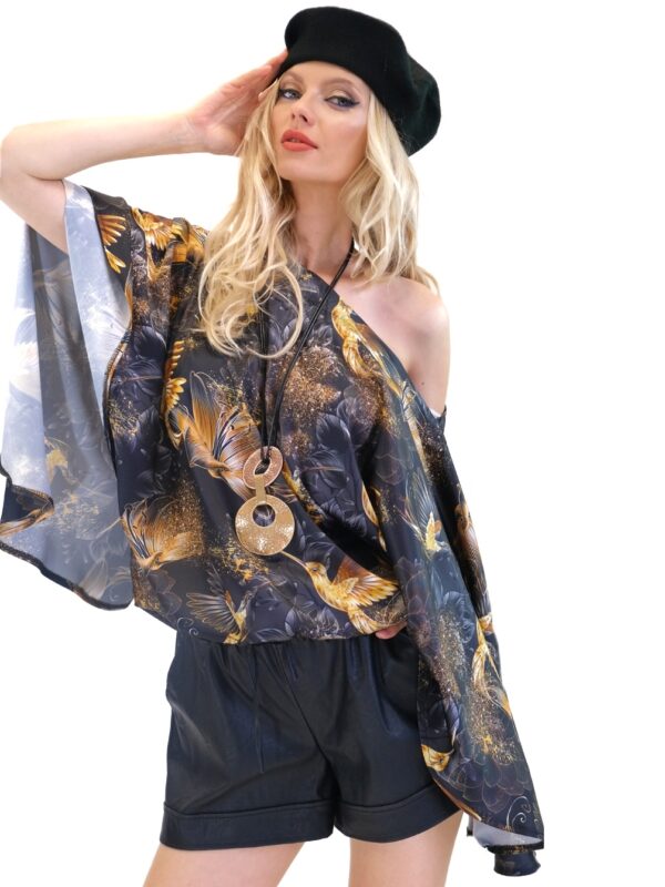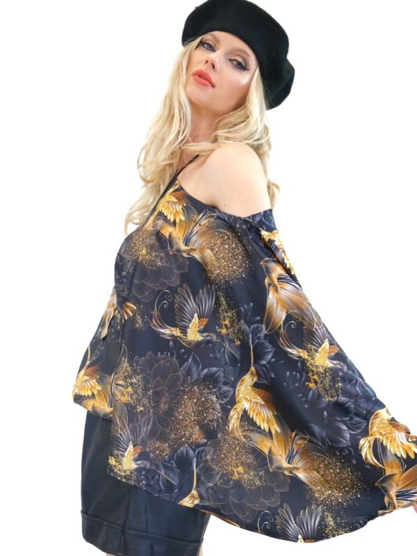 Tunika je navrhnutá v jednoduchom a pohodlnom strihu so širokými volánovými rukávmi a výborne sadne na každý typ postavy. Tunika má bohémske široké rukávy, ktoré jej dodávajú na výnimočnosti a komforte. Tunika ma našitý čierny patent vďaka ktorému výborne sadne na postavu a opticky Vás zúži. Jednoduchý strih necháva naplno vyniknúť nádhernému vzoru zlatých kolibríkov na tmavom pozadí. Tunika ideálna na spoločenské udalosti. Skombinujte ju s úzkymi nohavicami ako naša stylistka.