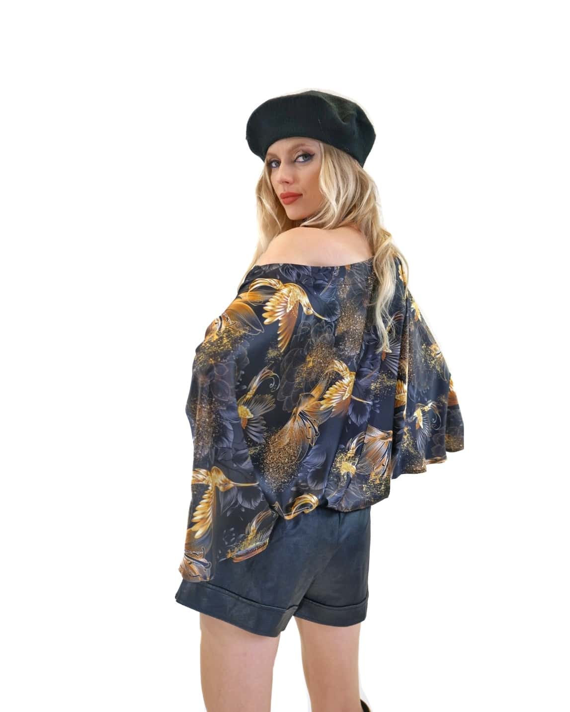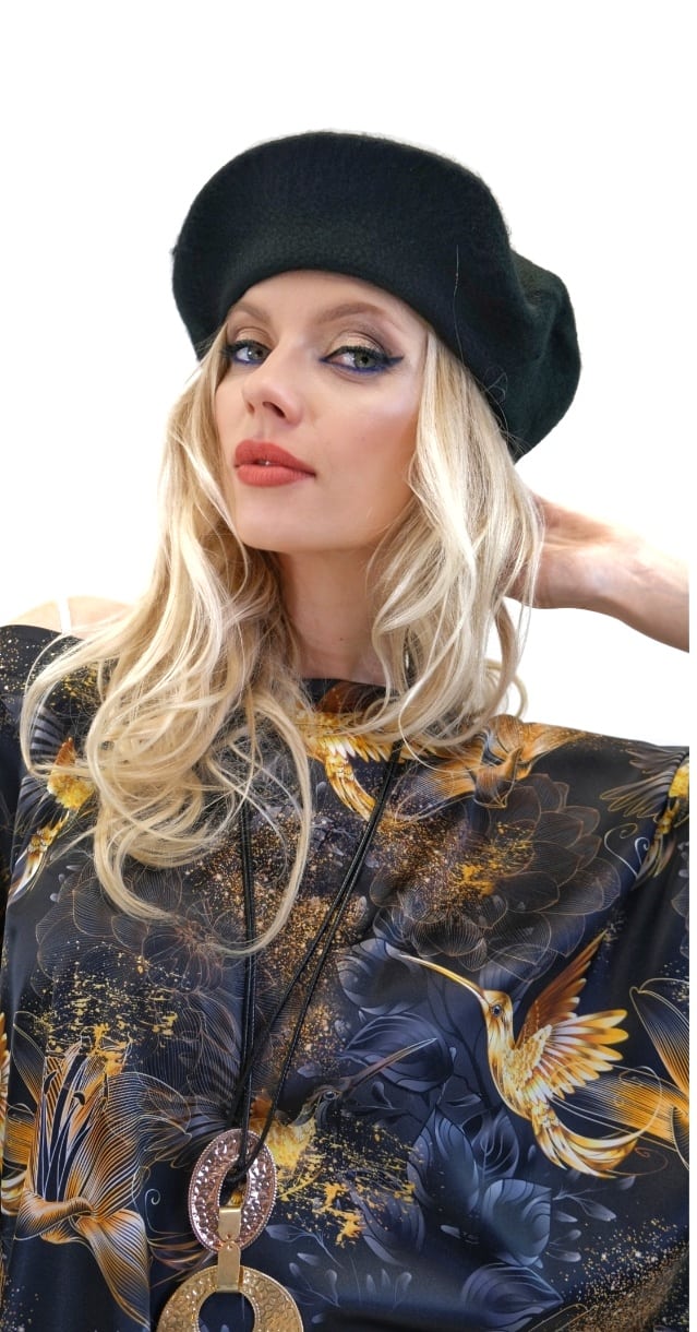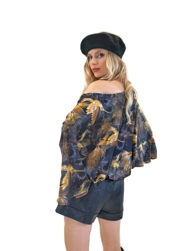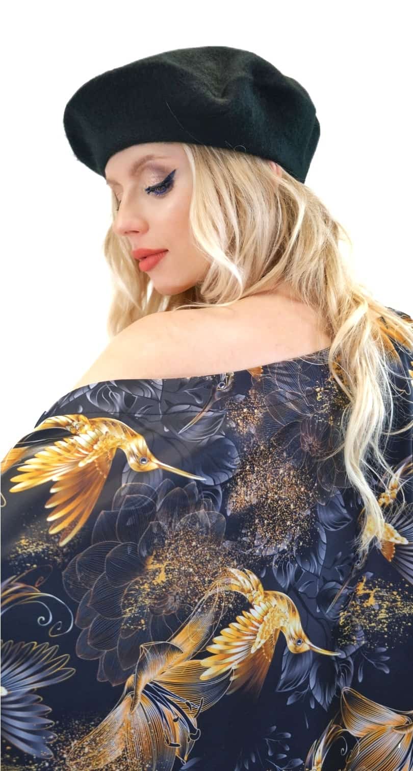 Tunika je navrhnutá v jednoduchom a pohodlnom strihu so širokými volánovými rukávmi a výborne sadne na každý typ postavy. Tunika má bohémske široké rukávy, ktoré jej dodávajú na výnimočnosti a komforte. Tunika ma našitý čierny patent vďaka ktorému výborne sadne na postavu a opticky Vás zúži. Jednoduchý strih necháva naplno vyniknúť nádhernému vzoru zlatých kolibríkov na tmavom pozadí. Tunika ideálna na spoločenské udalosti. Skombinujte ju s úzkymi nohavicami ako naša stylistka.