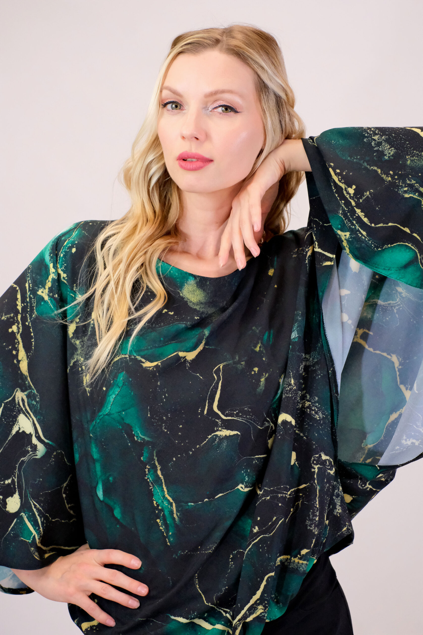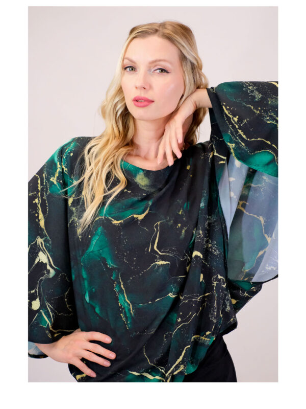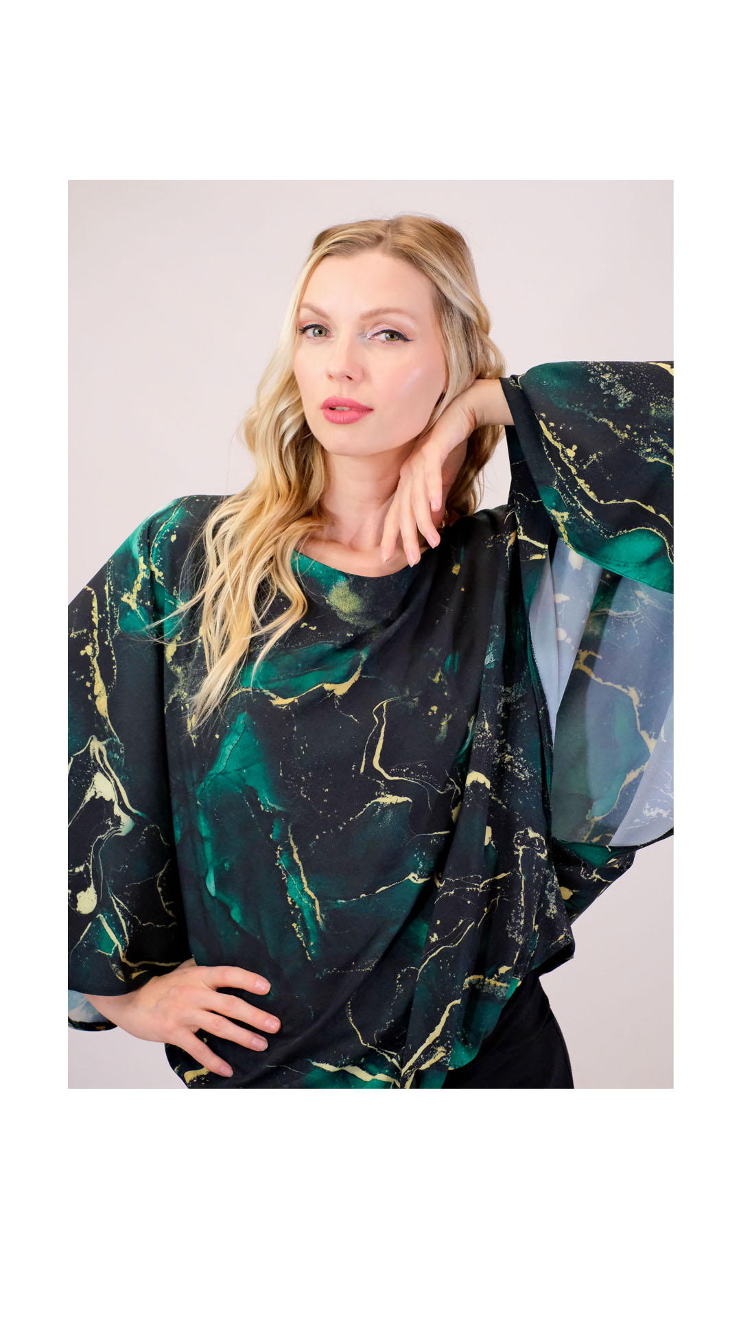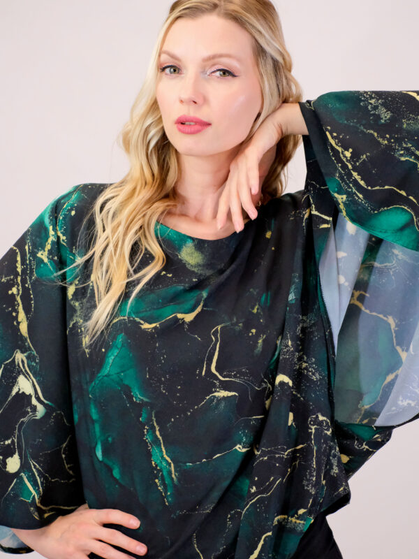 Tunika má v spodnej časti našitý patent, ktorý Vám dodá na komforte. Tunika má nádherný vzor, ktorý pripomína intarzie na mramorovej doske. Tunika hra farbami čiernej, zelenej a zlatej. Kombinujte ju so zlatými alebo čiernymi doplnkami ako naša aranžérka. Ak chcete nechať tuniku skutočne vyniknúť oblečte si k nej úzke čierne nohavice.