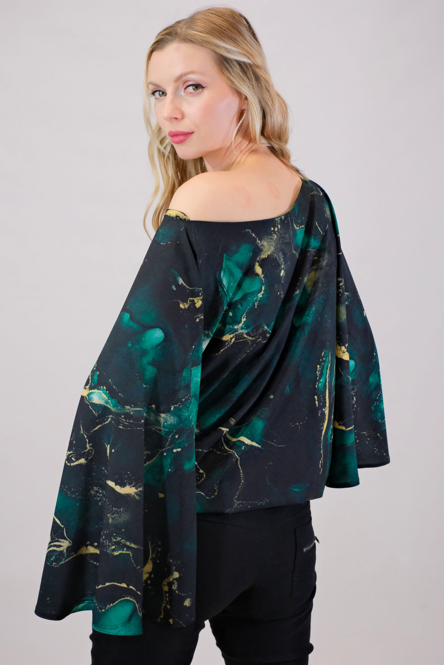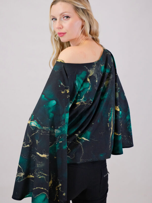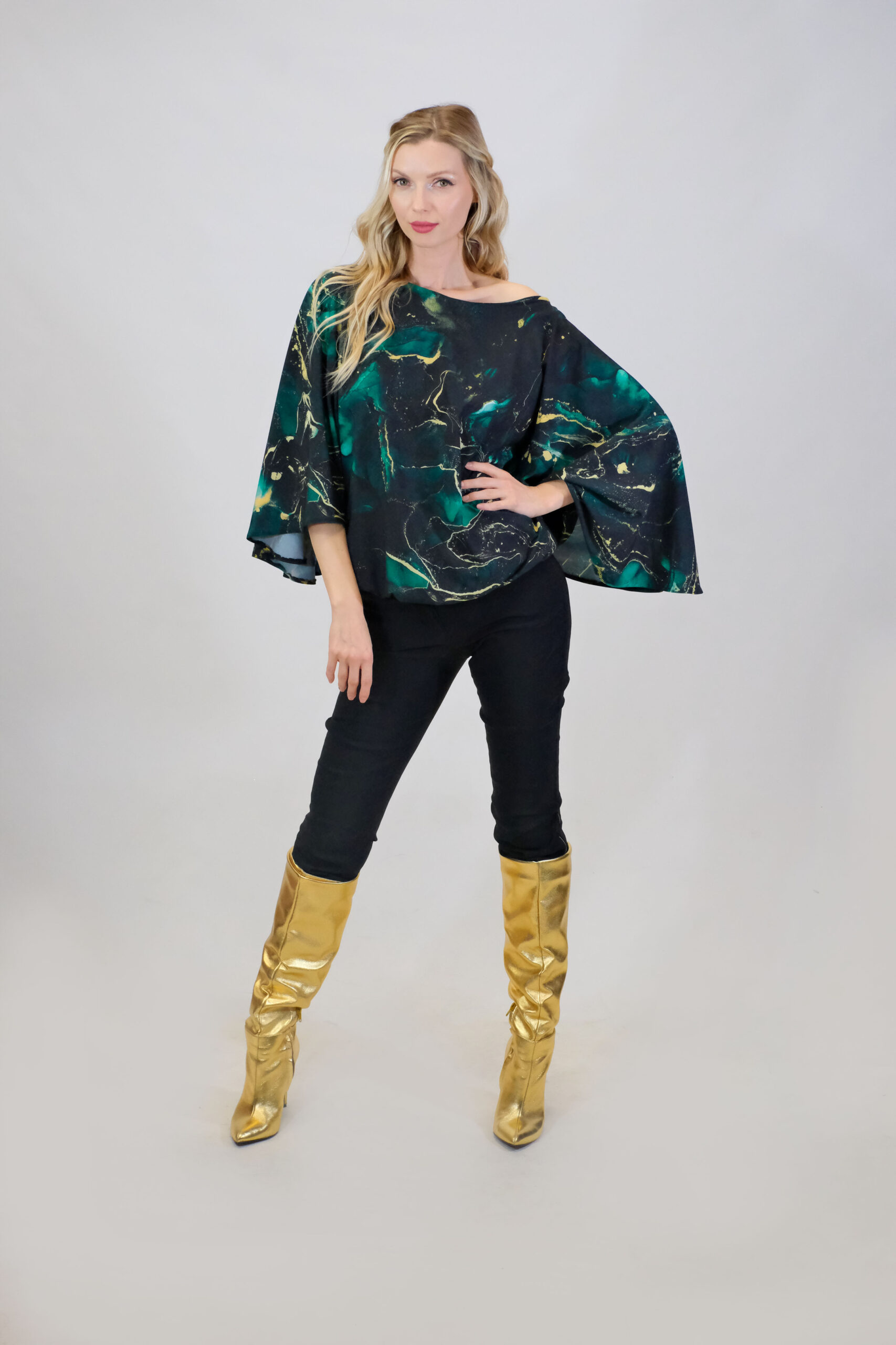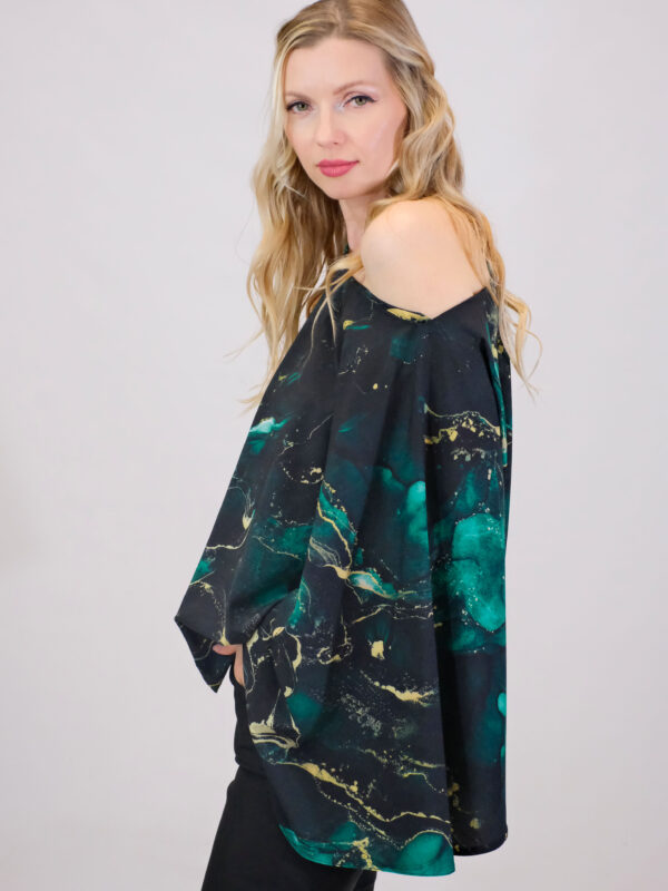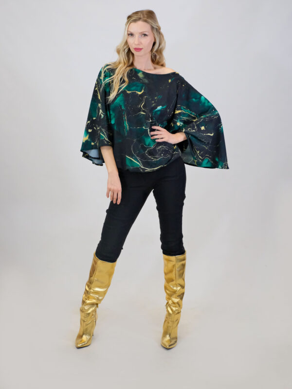 Tunika má v spodnej časti našitý patent, ktorý Vám dodá na komforte. Tunika má nádherný vzor, ktorý pripomína intarzie na mramorovej doske. Tunika hra farbami čiernej, zelenej a zlatej. Kombinujte ju so zlatými alebo čiernymi doplnkami ako naša aranžérka. Ak chcete nechať tuniku skutočne vyniknúť oblečte si k nej úzke čierne nohavice.