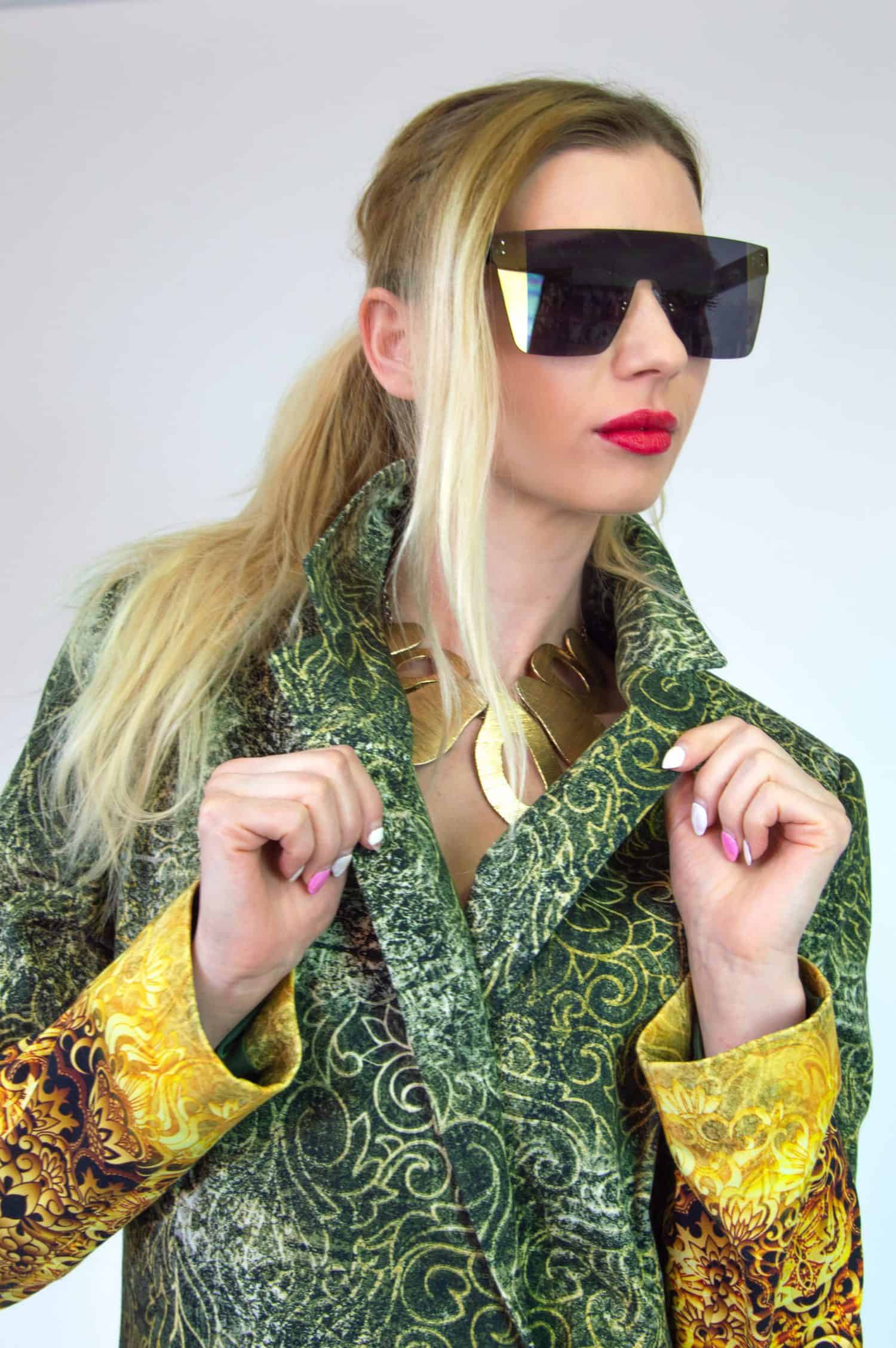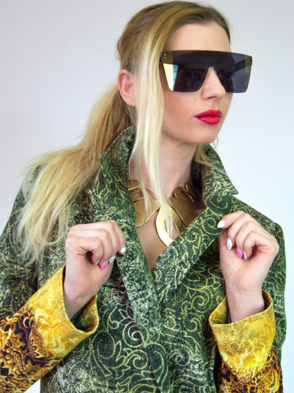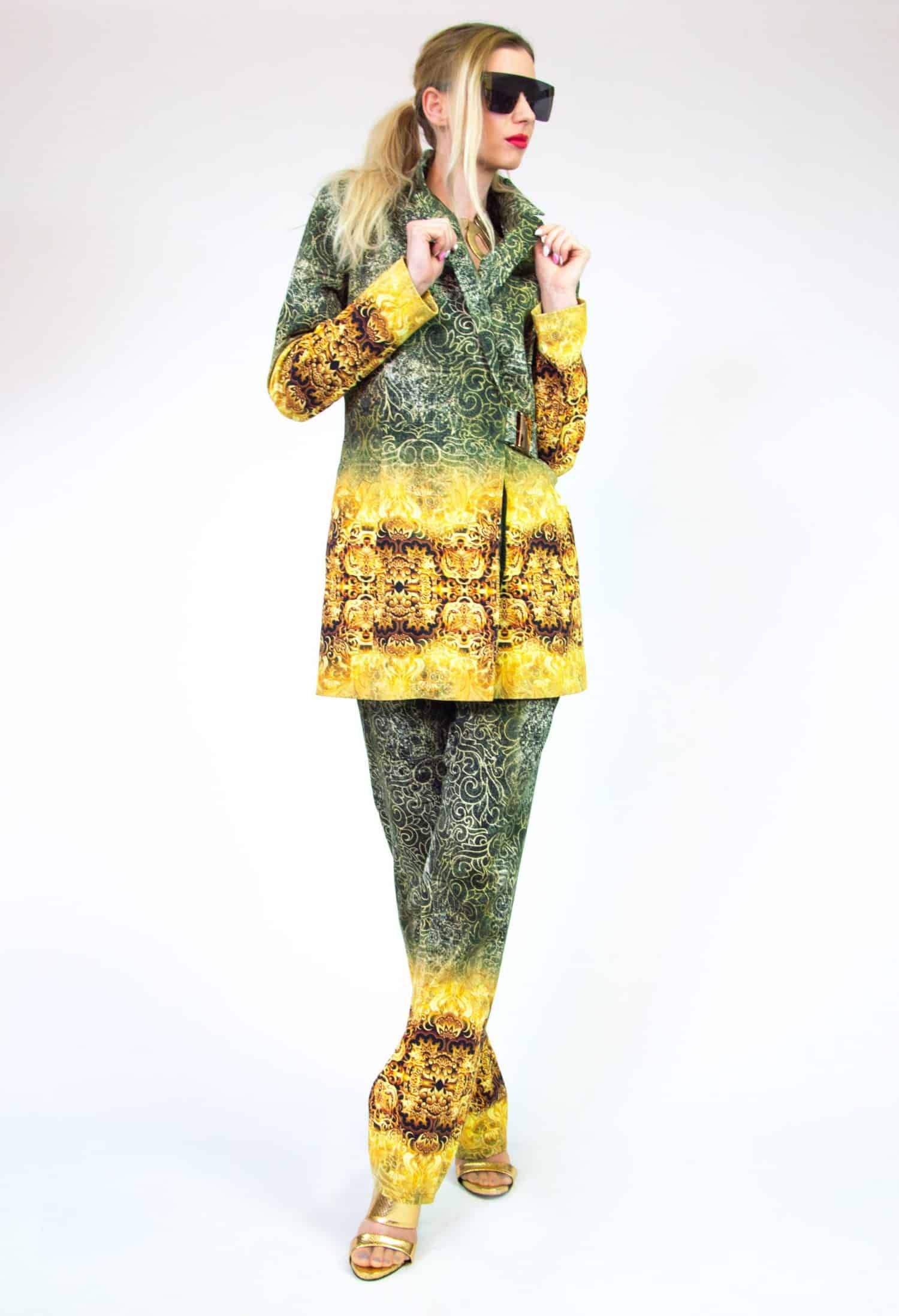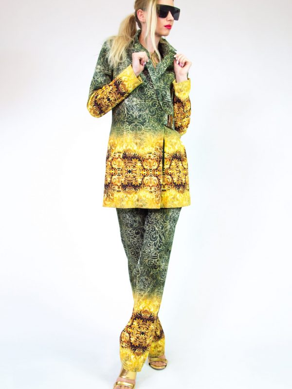 Materiál na zákazku priamo z talianských dielni v Prate. Sako je podľa najnovších trendov oversize a predlžené so skrytým zapínaním a ozdobené zlatou sponou. Pre ženy , ktoré radi vyniknú netradičným dizajnom s barokovými motívmi v podklade olivovo zelenej. V kombinácii s nohavicami dokonalý pár.