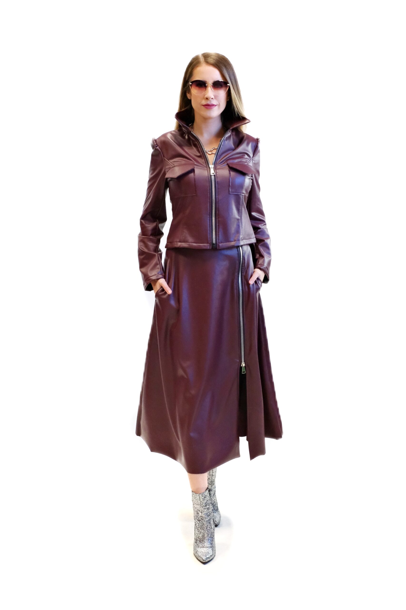 Sako je navrhnuté v prepracovanom strihu, ktorý výborne sadne na postavu a vďaka elastickosti sa jej prispôsobí. Sako je ušité z futuristického materiálu, ktorý sa na svetle matne leskne a na dotyk pripomína kožu. Sako sa dá nosiť otvorené, keď necháte vyniknúť jeho fazónku, alebo zatvorené keď sa zdôrazní golier. Sako je v trendy farbe burgundy, ktorá je vnímaná ako elegantná a luxusná farba. Pre dokonalý look skombinujte tento krásny kúsok so sukňou Burgundy a budete vyzerať štýlovo či v bežný deň do prace alebo aj na rande.