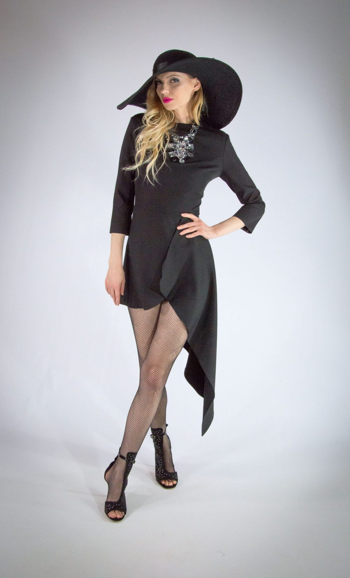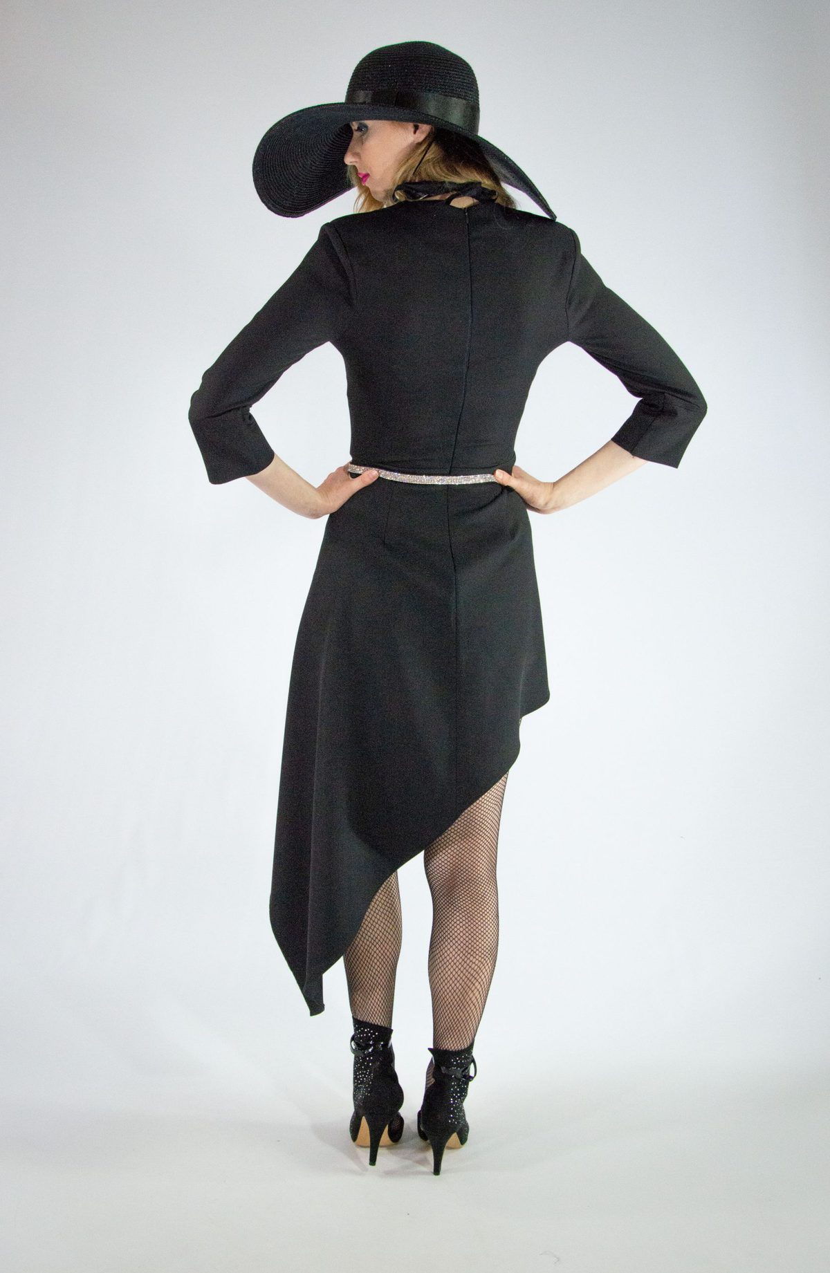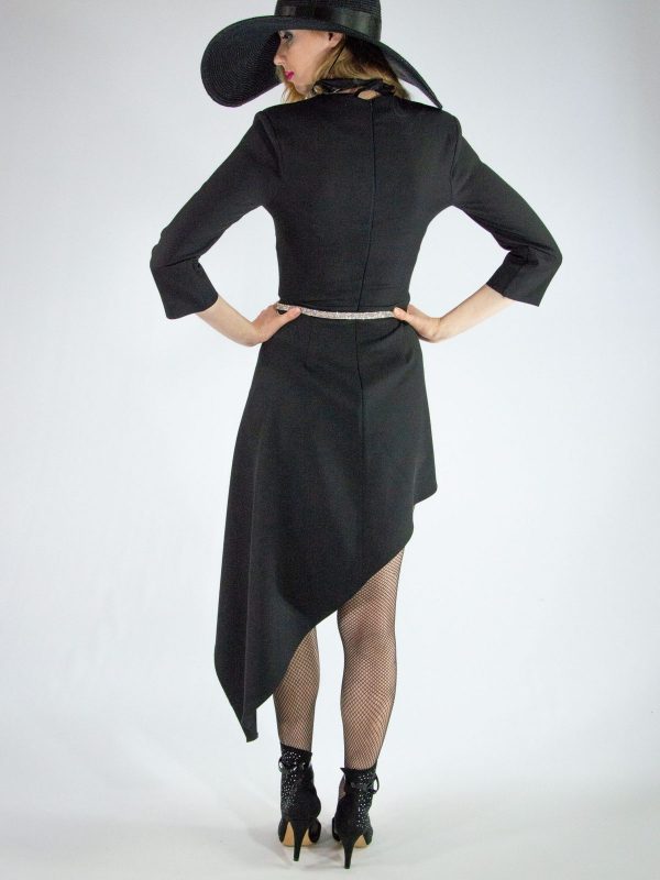 Sako z strihu kopírujúci pánsky frak. Sako je asymetricky strihané a predlžujúc sa do strany. Na prvý pohľad vyzerá ako šaty, ktorým chýba pár centimetrov ale skombinujte ich s úzkymi nohavicami čiernej alebo bielej farby a zaujmite okolie netradičným poňatím tradičného kúsku odevu.