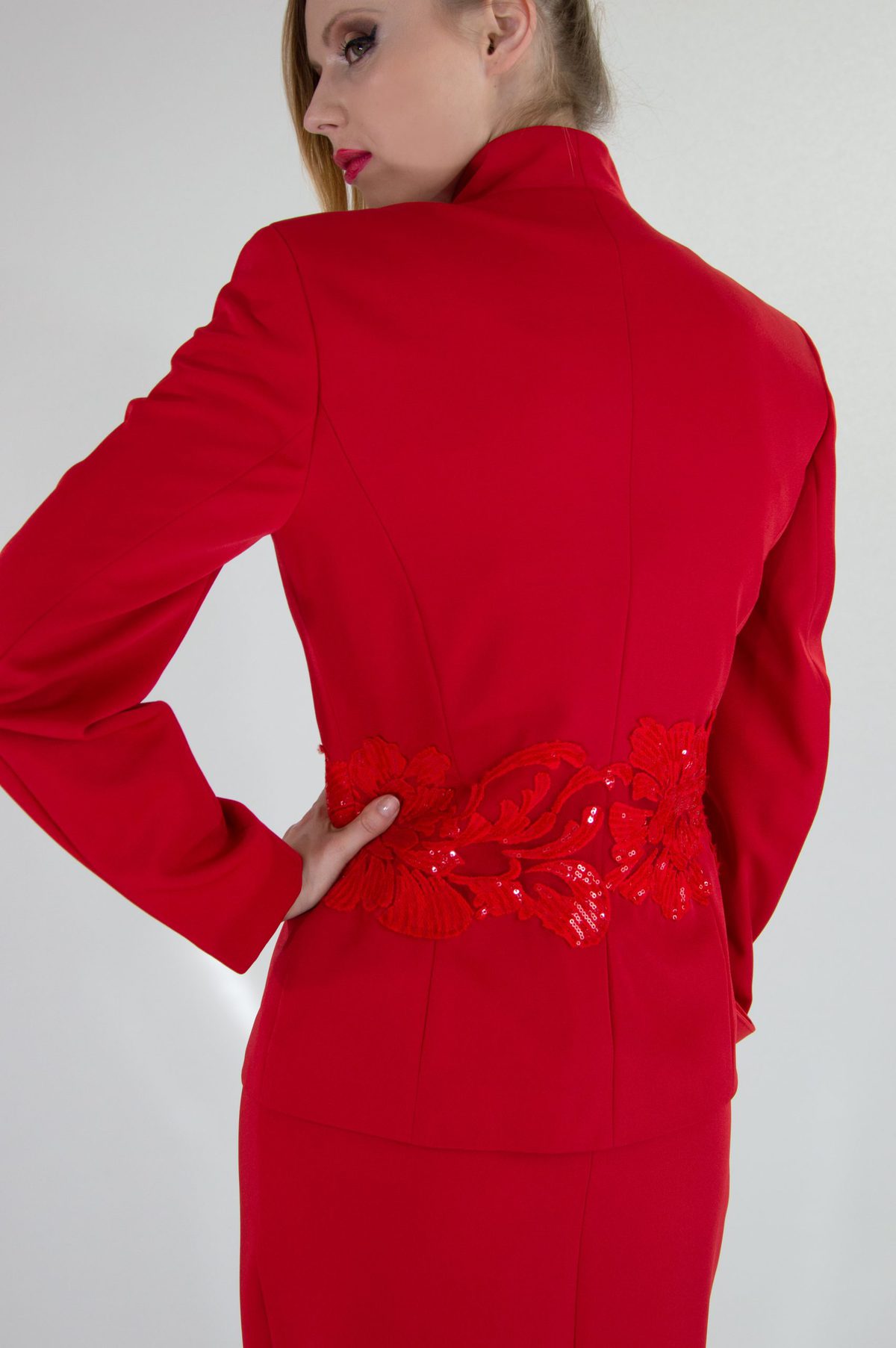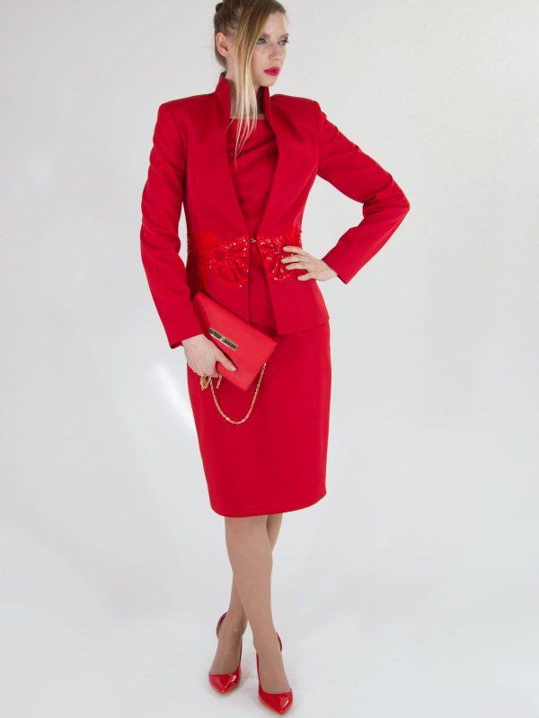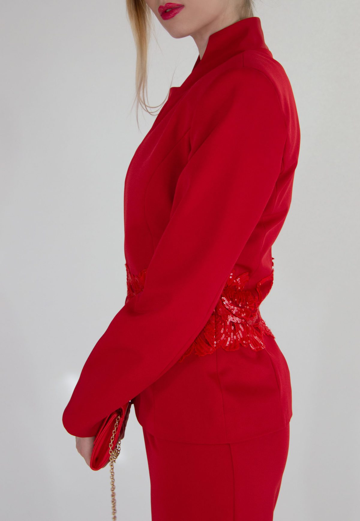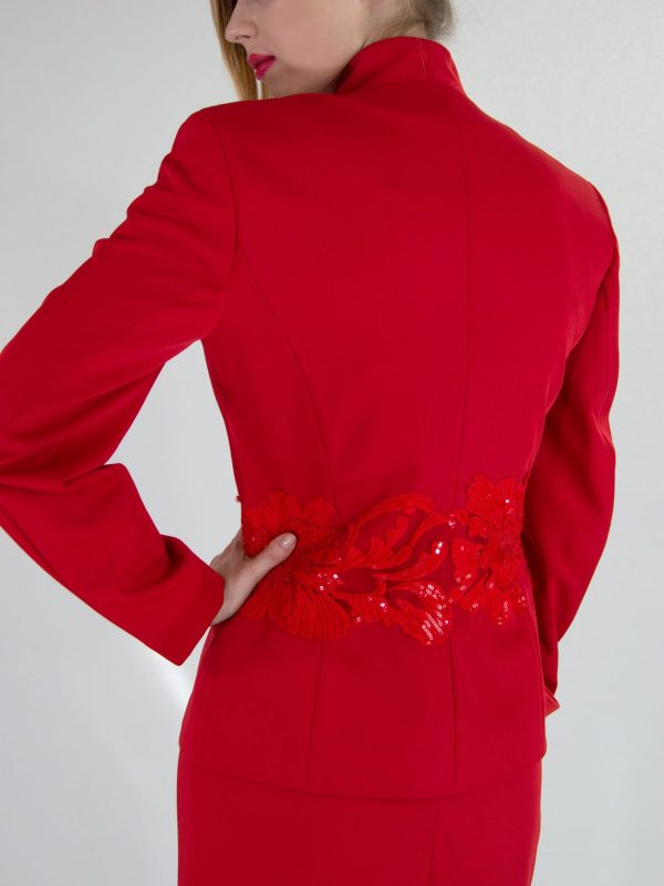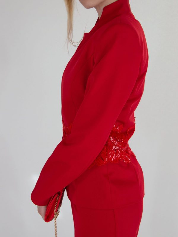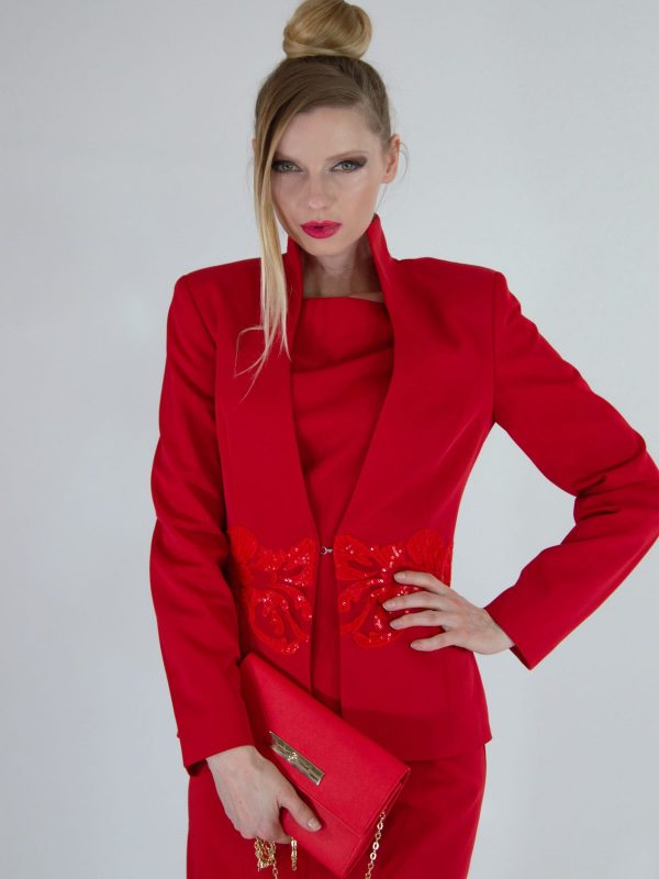 Sako šité v užšom strihu skvele zdôrazní postavu. Sako je ušité v minimalistickom duchu s jednoduchým zapínaním. Zaujímavým detailom je krajka v rovnako výraznom odtieni umiestnená cez pás.