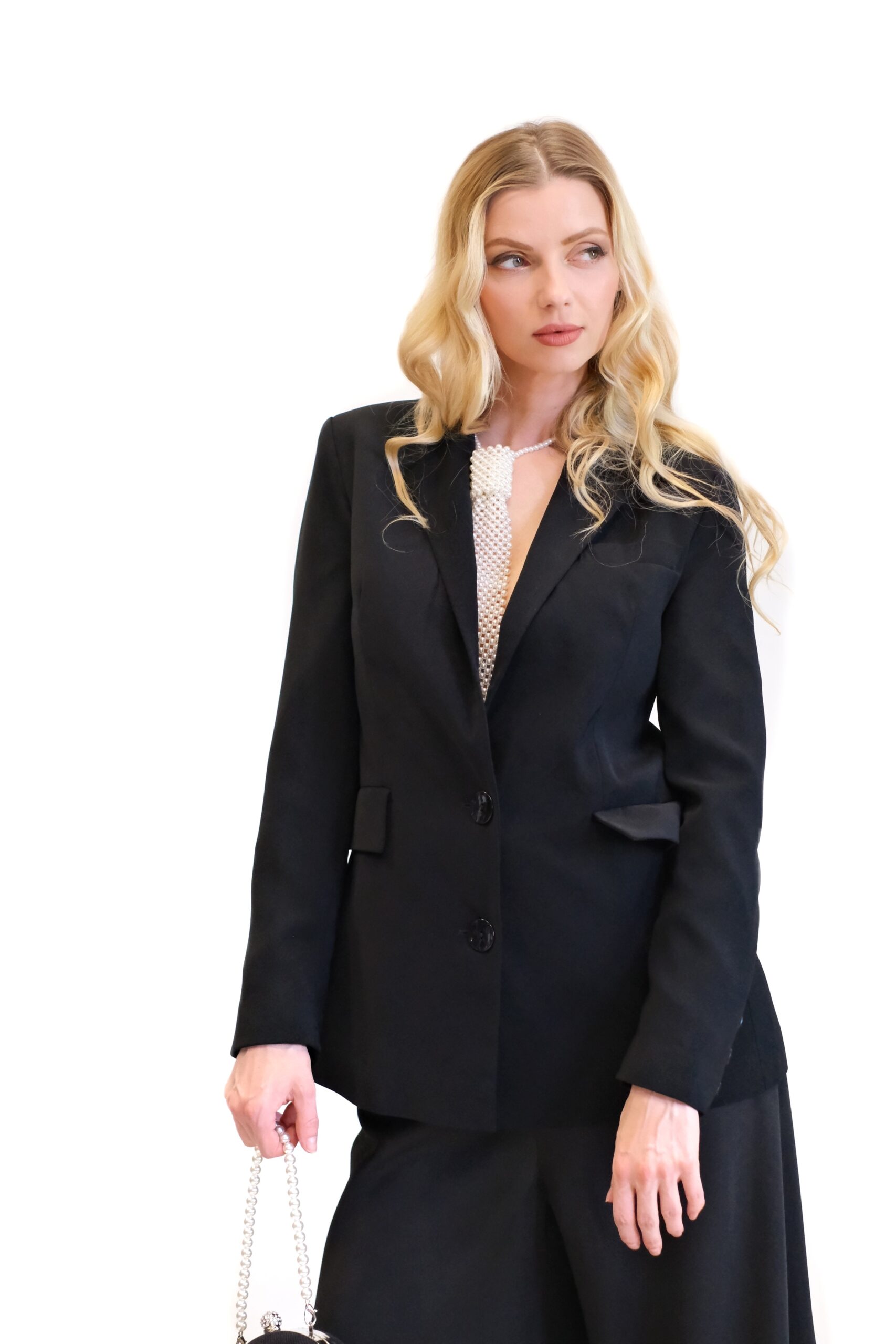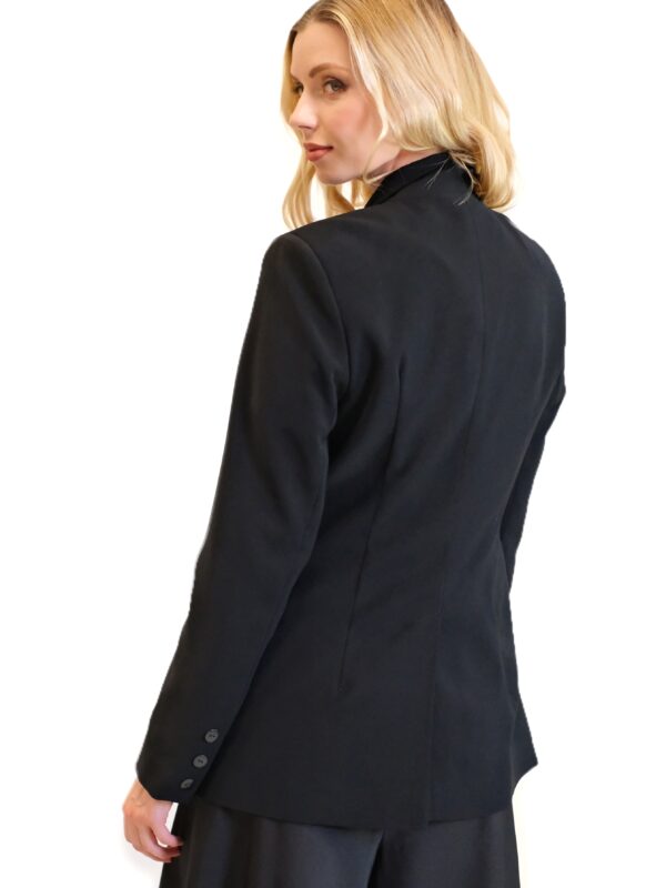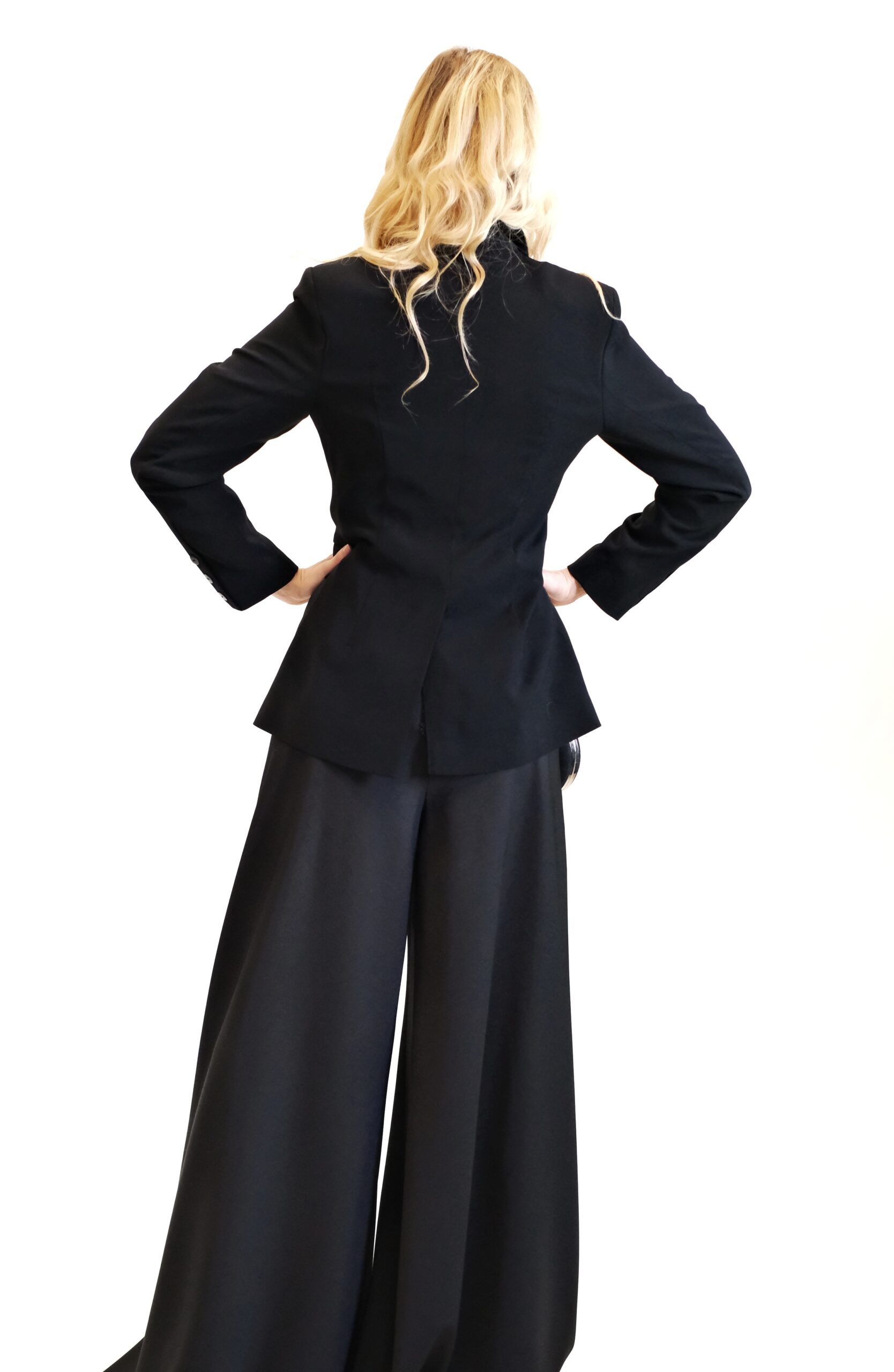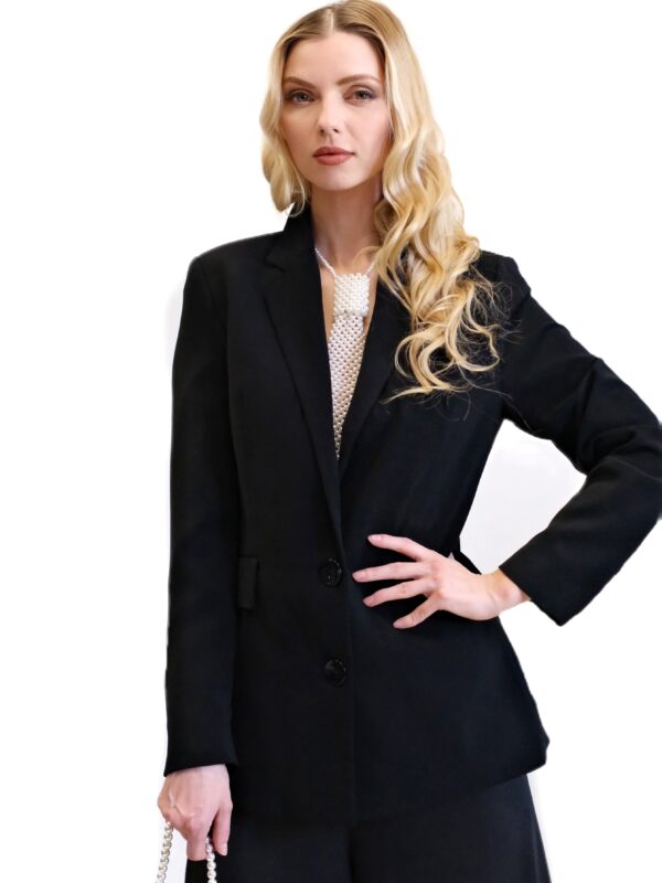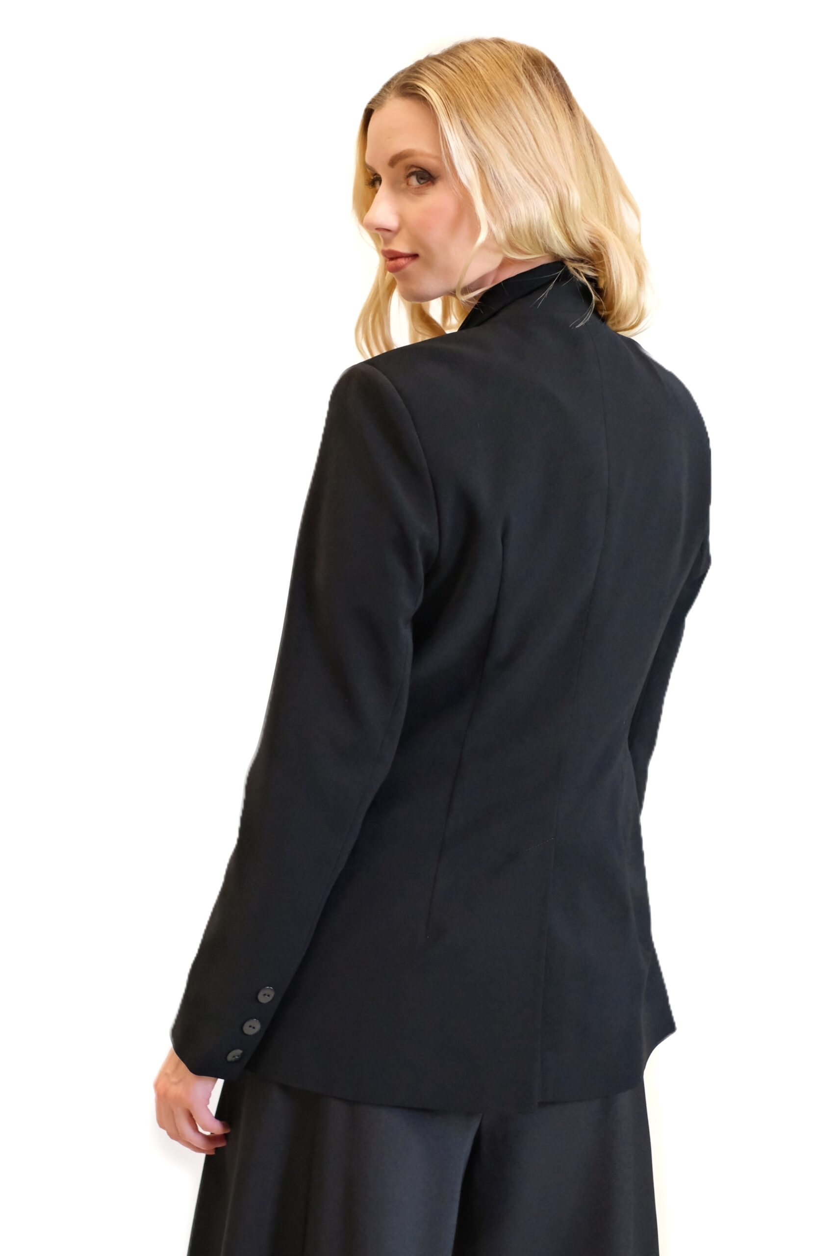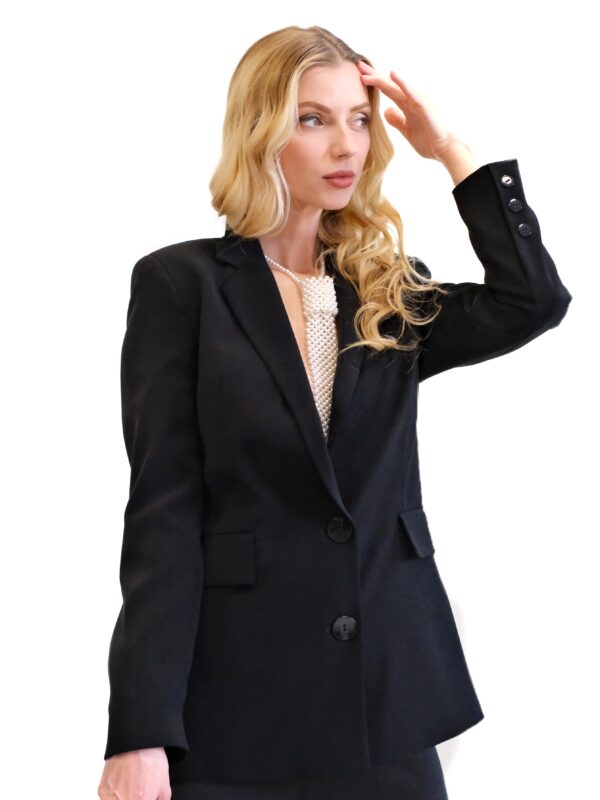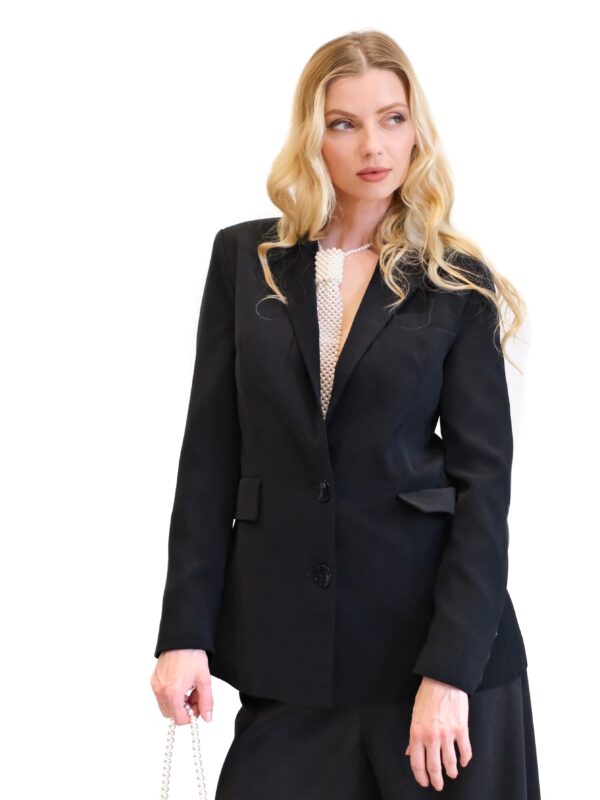 Sako je navrhnuté v jednoduchom úzkom strihu, ktorý dobre sadne na postavu. Sako má úzke rukávy a snaží sa zdôrazniť prirodzenú líniu tela. Ležérny štýl saka je podčiarknutý predĺženými kĺopami a zapínaním, ktoré je nižšie položené. Dodáva tak saku uvoľnený vzhľad. Sako je ušité v nesmrteľnej čiernej farbe, ktorú dokážete kombinovať s celým vašim šatníkom.