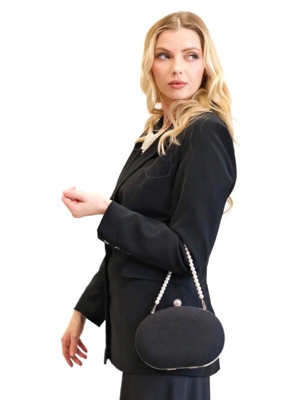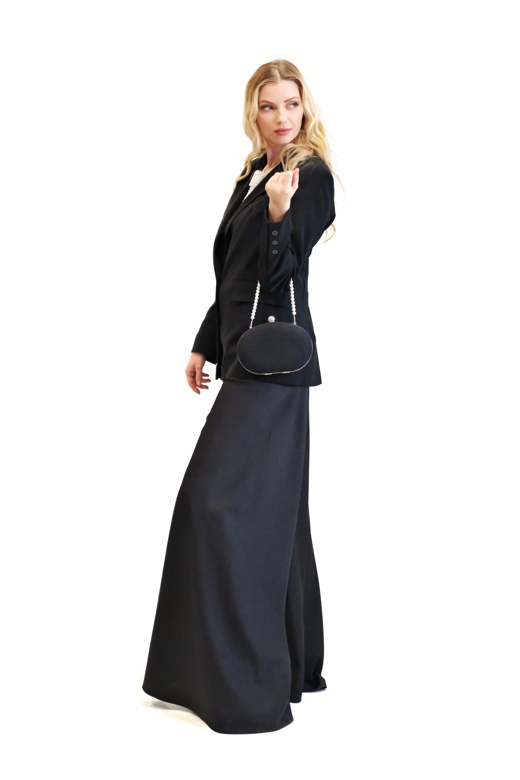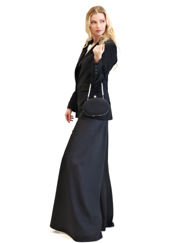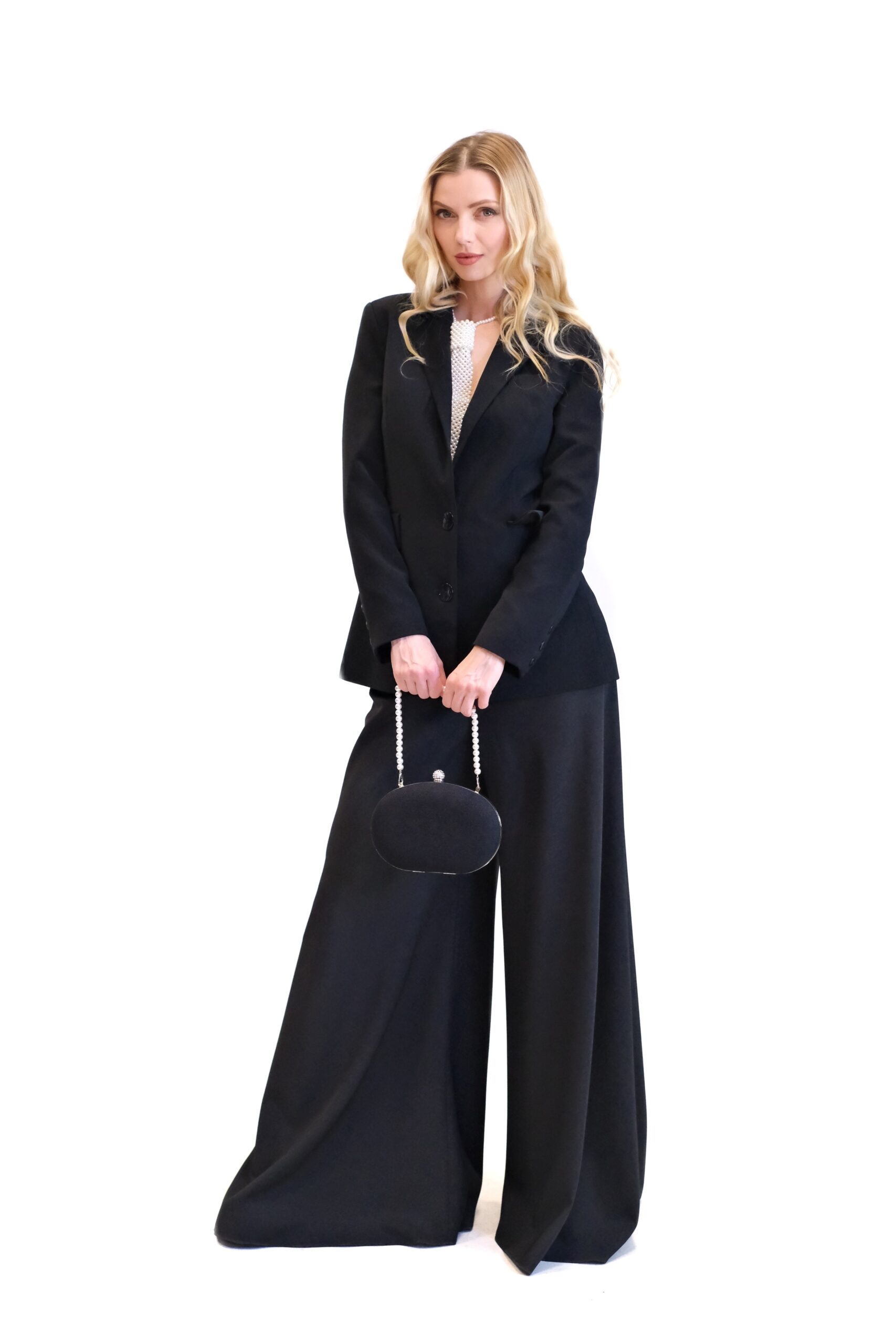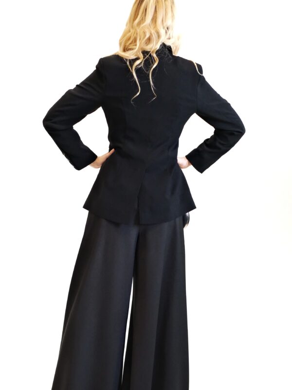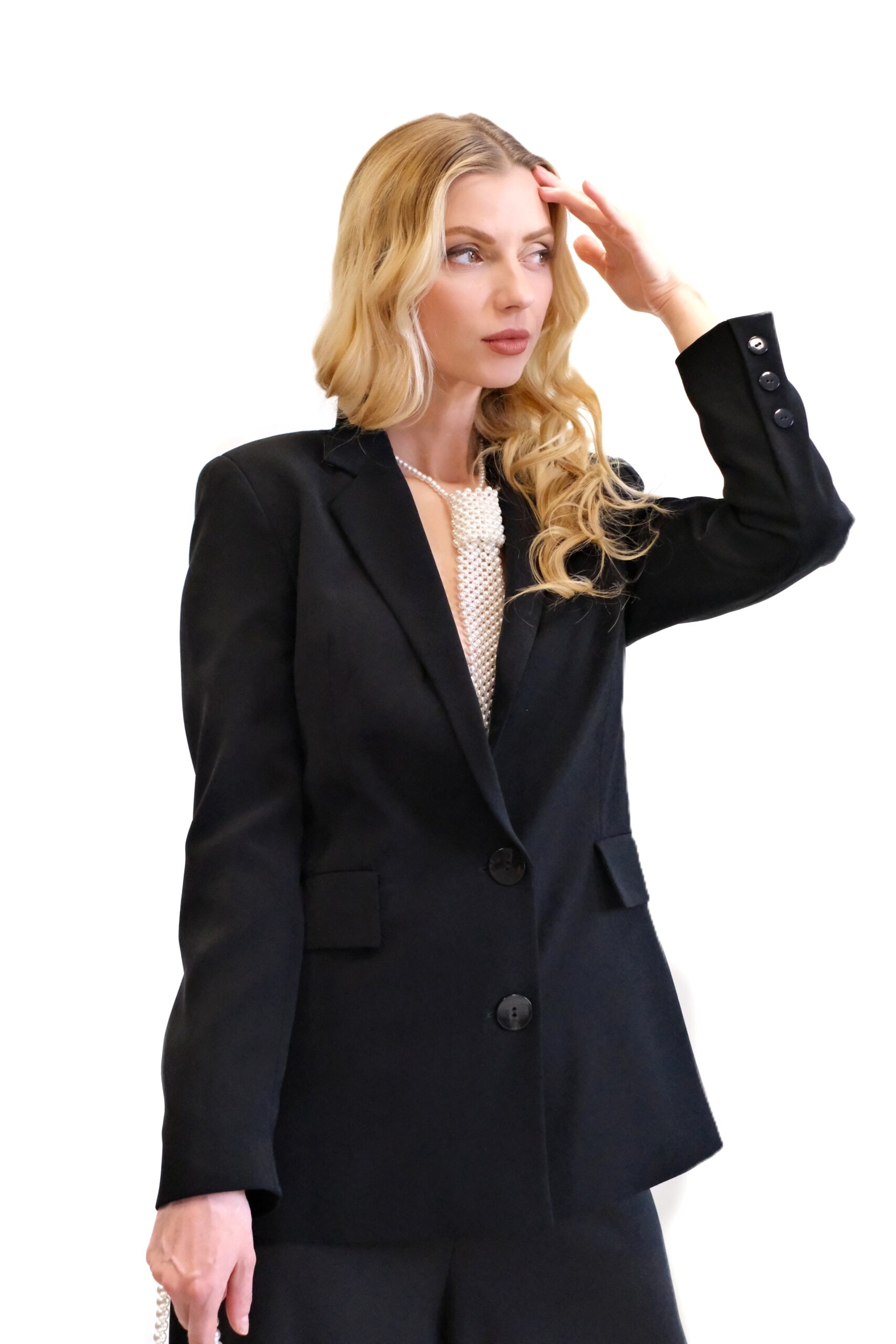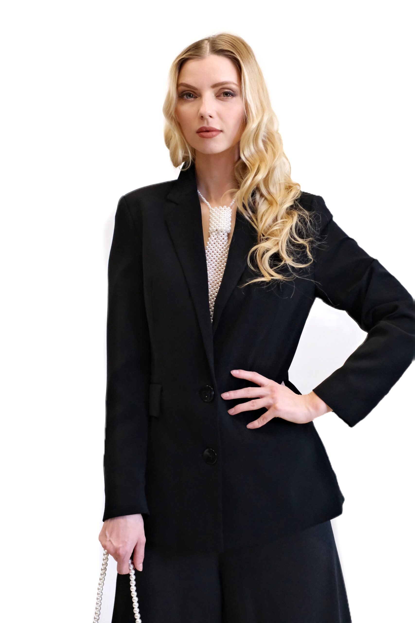 Sako je navrhnuté v jednoduchom úzkom strihu, ktorý dobre sadne na postavu. Sako má úzke rukávy a snaží sa zdôrazniť prirodzenú líniu tela. Ležérny štýl saka je podčiarknutý predĺženými kĺopami a zapínaním, ktoré je nižšie položené. Dodáva tak saku uvoľnený vzhľad. Sako je ušité v nesmrteľnej čiernej farbe, ktorú dokážete kombinovať s celým vašim šatníkom.