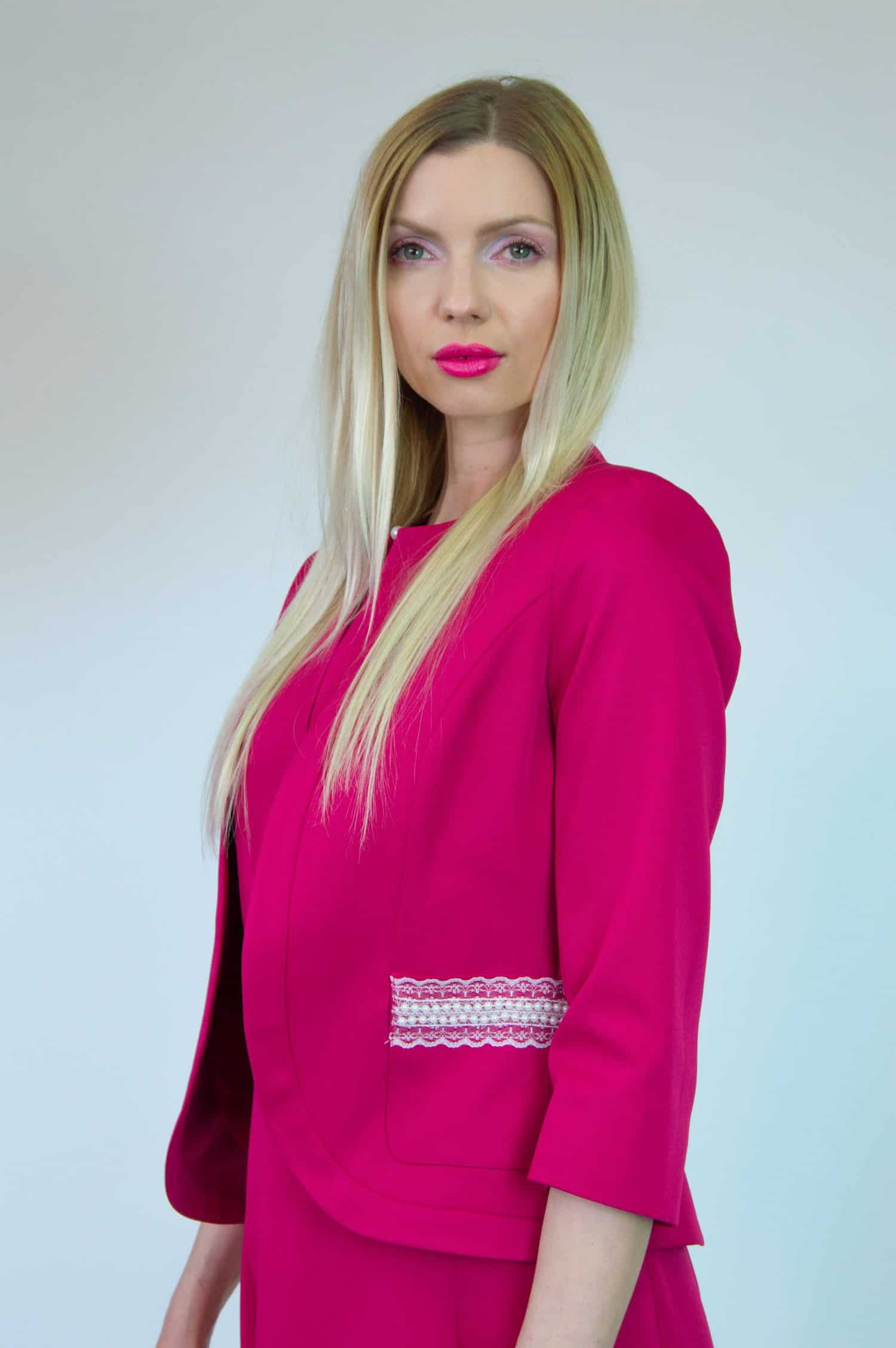 Sako výnimočné svojou jednoduchosťou. Pri jednofarebnom prevedení sú výborne viditeľné práve detaily ako štepovanie alebo našitá krajka na funkčnom vrecku. Skvele padne tón v tóne so šatami Pipa. V inom prípade cyklámenová krásne oživí čierne alebo biele šaty.