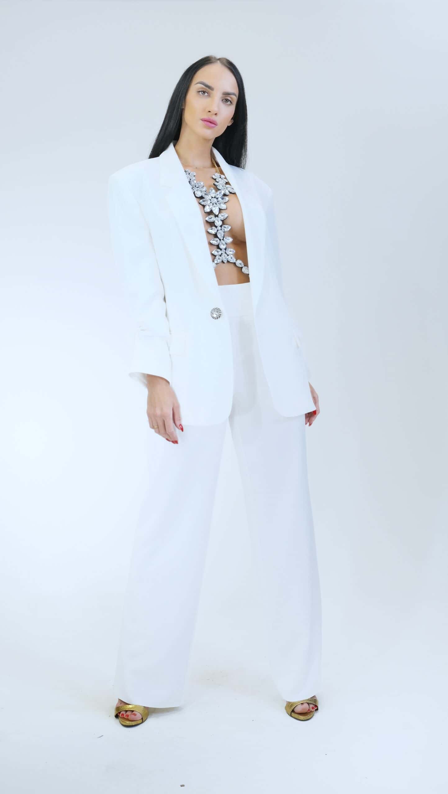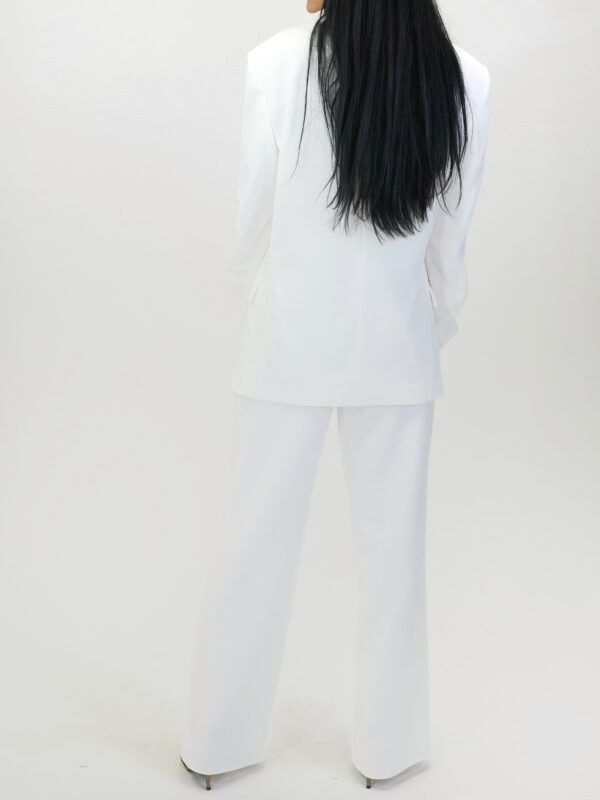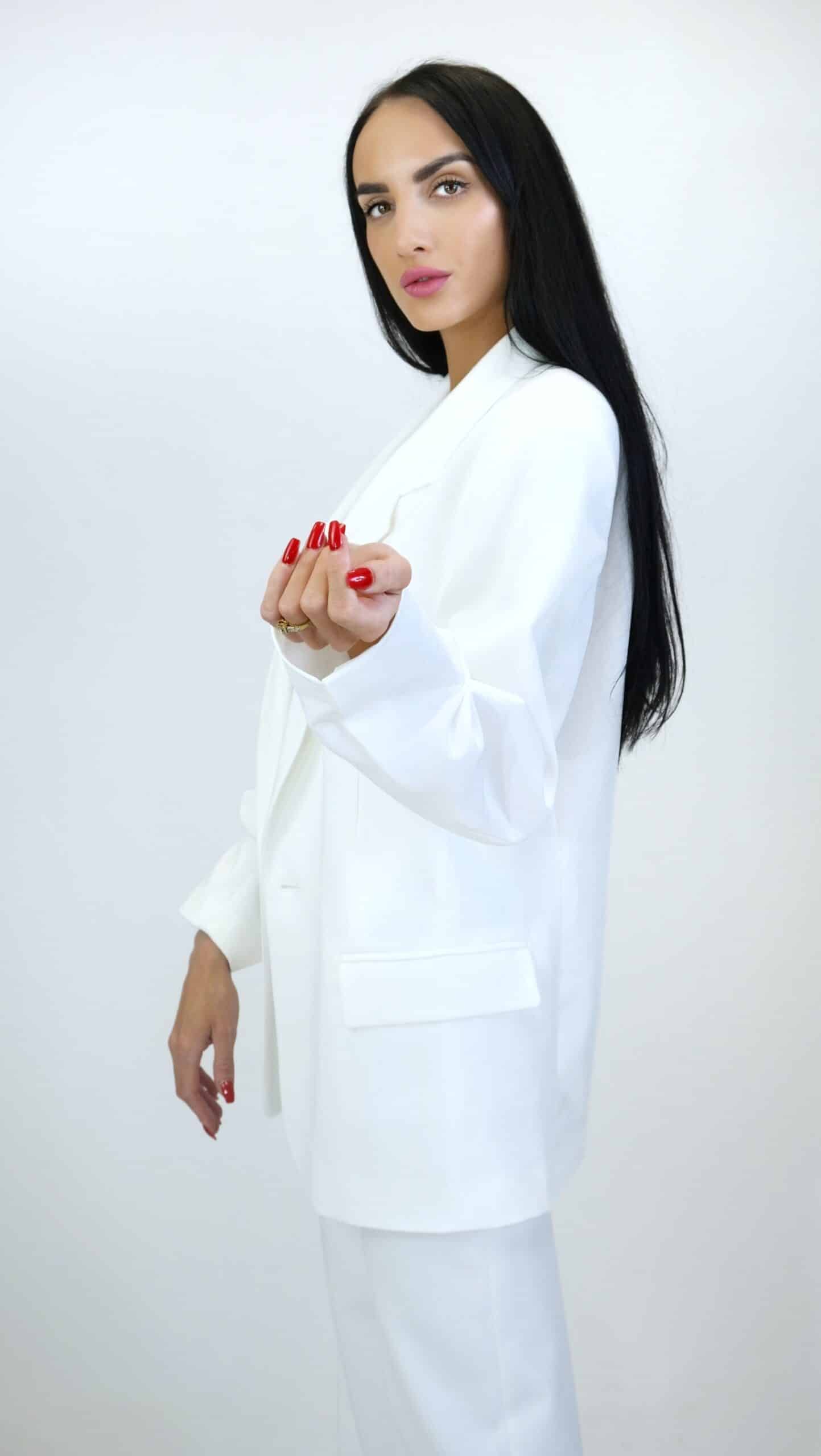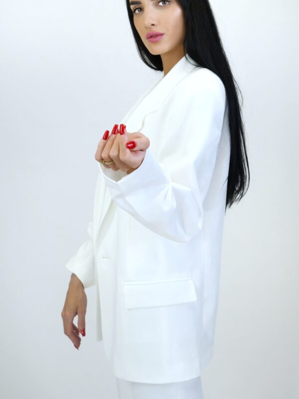 Sako je navrhnuté v pohodlnom oversize strihu, v ktorom sa budete cítiť skvele počas celého dňa. Sako je ušité so zdôraznenými ramenami, čo v kombinácii s oversize strihom podčiarkne ležérnosť každého Vášho outfitu. Sako má funkčné vrecká a zaujímavým detailom je zriasenie rukávu miesto manžety. Skúste oversize sako skombinovať s úzkymi nohavicami pre dokonalý look. Sako je navrhnuté v snehovo bielej farbe a ľahko ho skombinujete s každým kúskom vo Vašom šatníku či už nohavicami alebo úzkymi šatami.