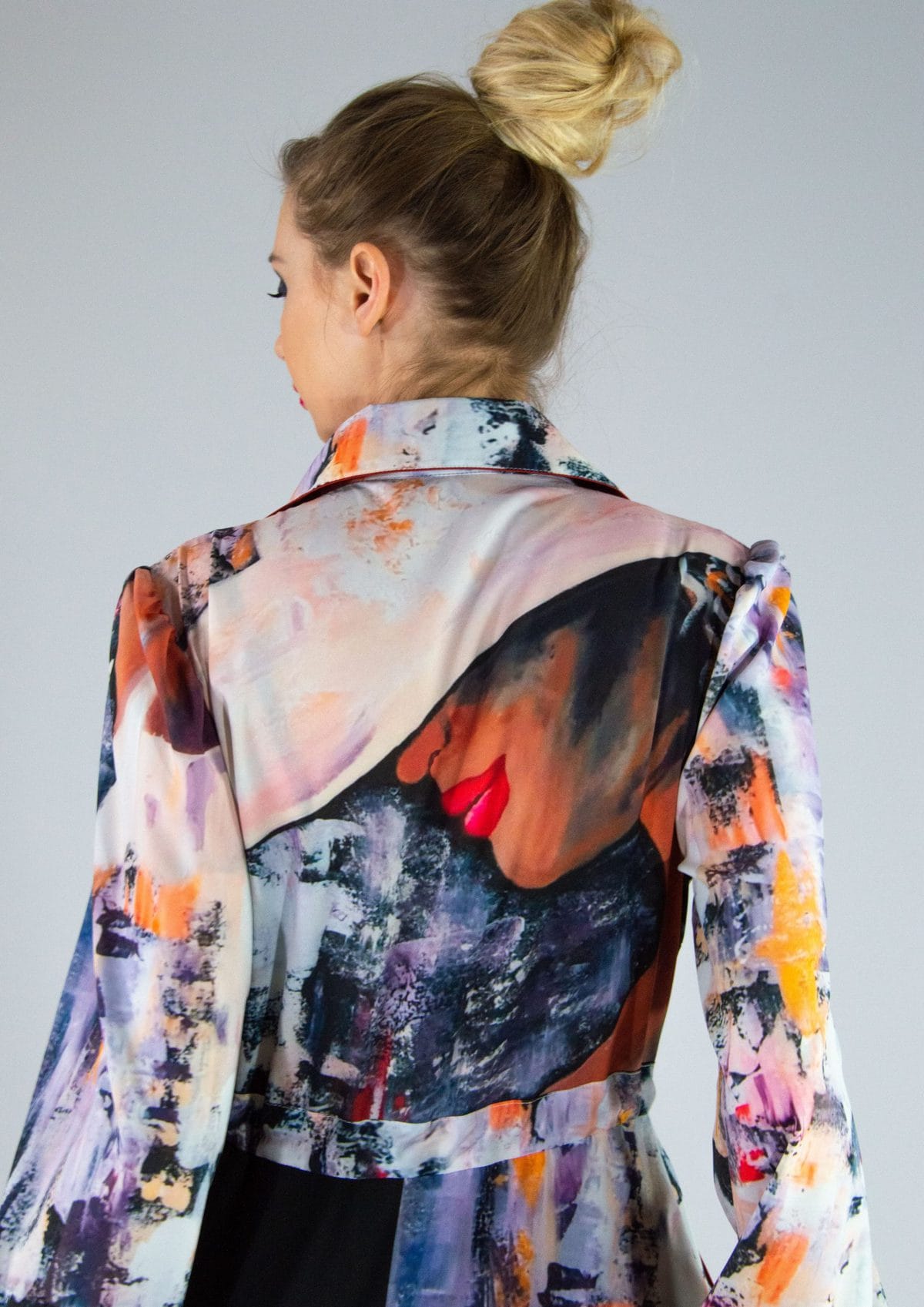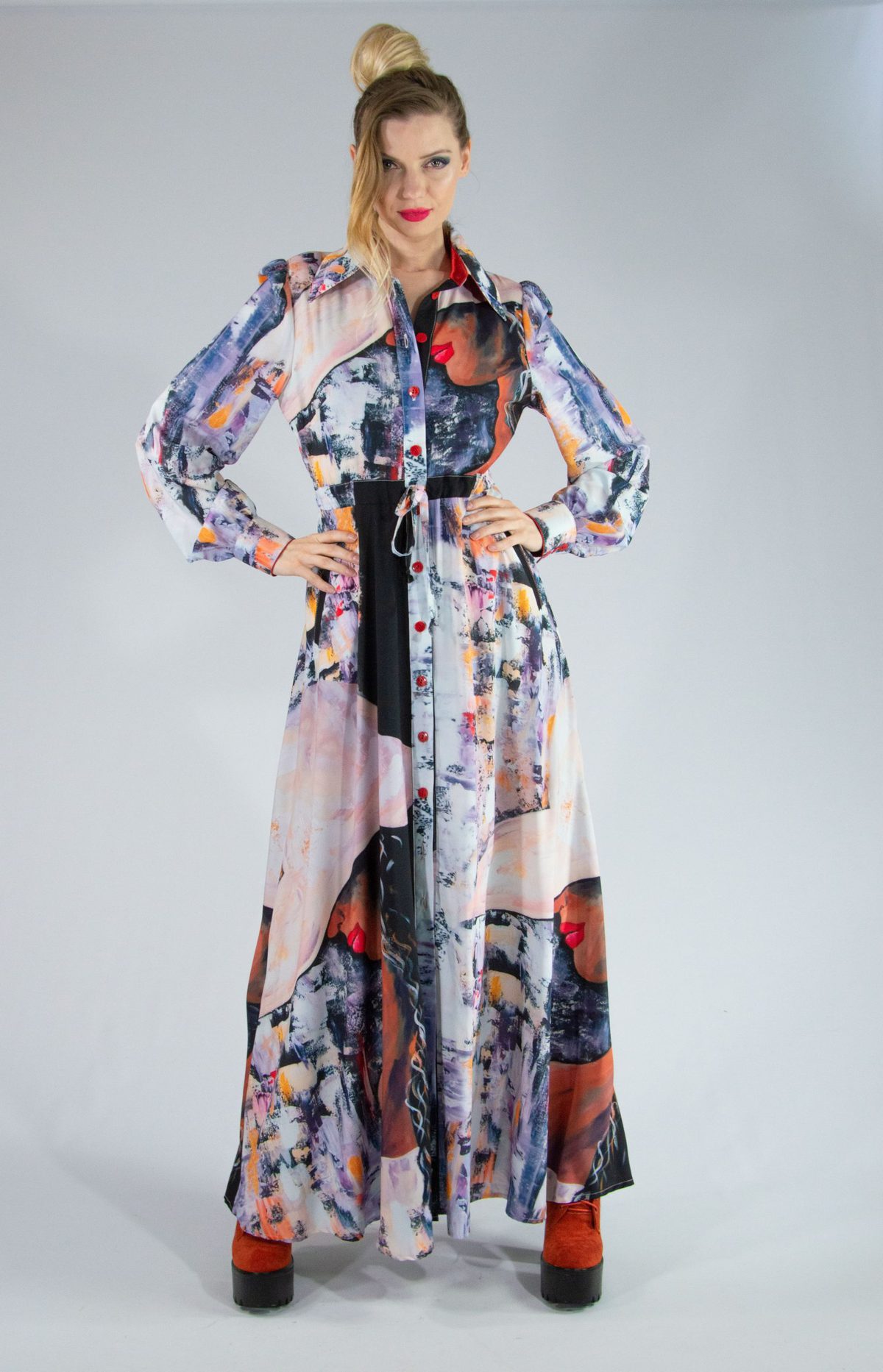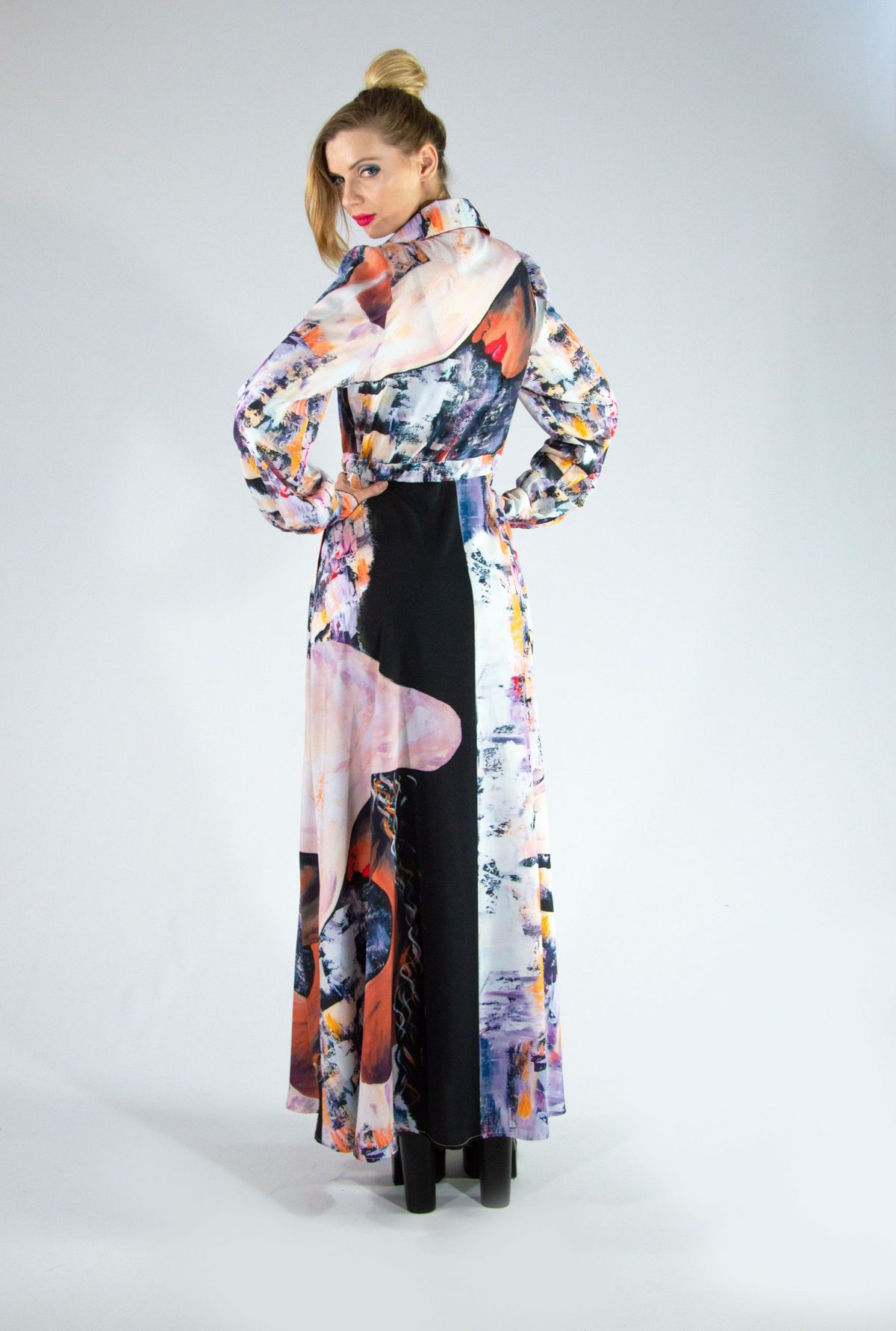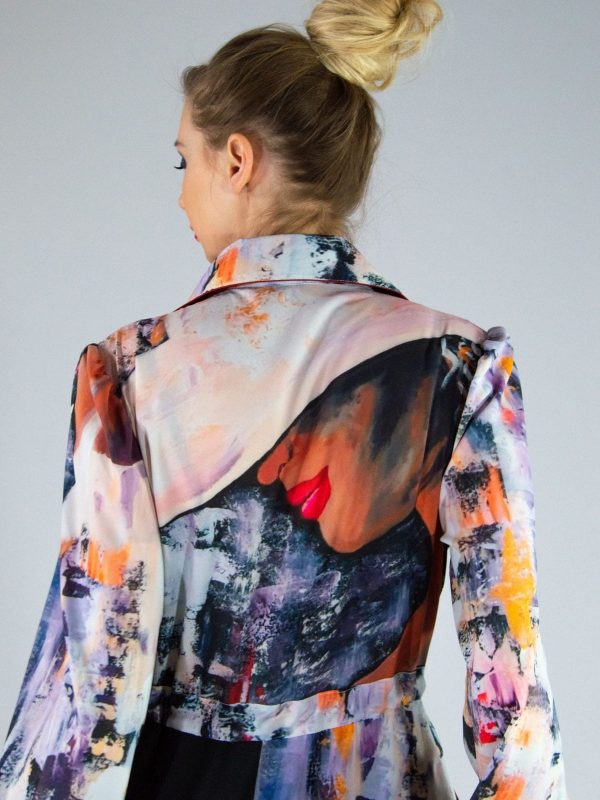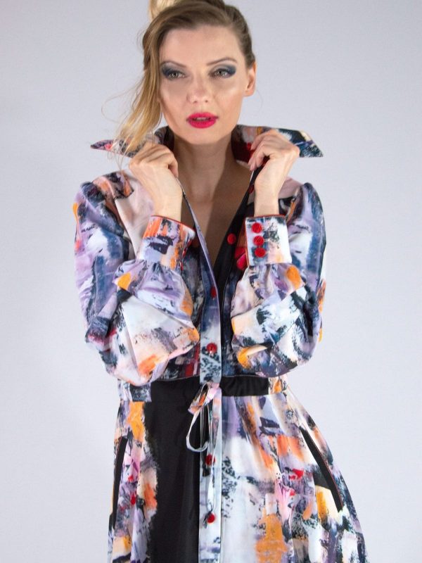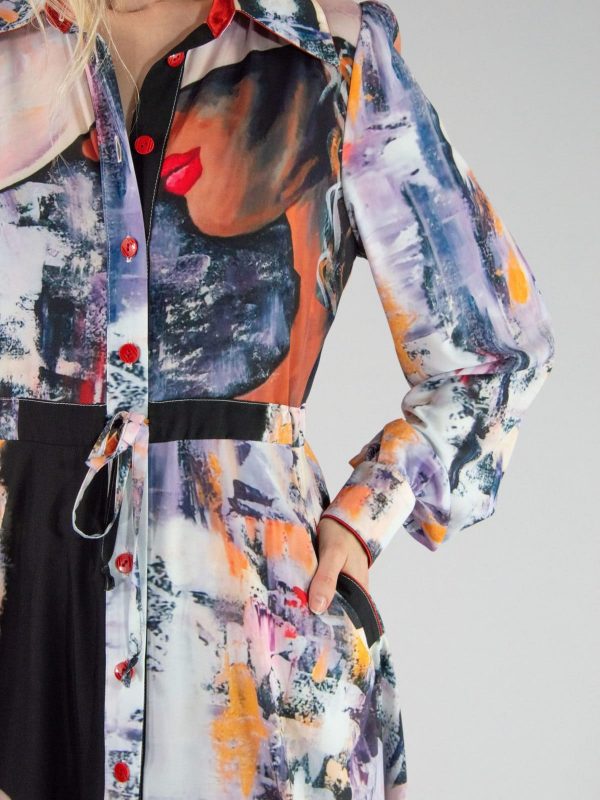 Šaty ušité v obľúbenom košeľovom strihu, ktorý výborne sadne na každú postavu. Šaty sú ušité z grafickej potlače navrhnutej na mieru pre našu značku a pripomínajú plátno post moderných maliarov. Ľahko ich skombinujete s čiernymi alebo pastelovými doplnkami.