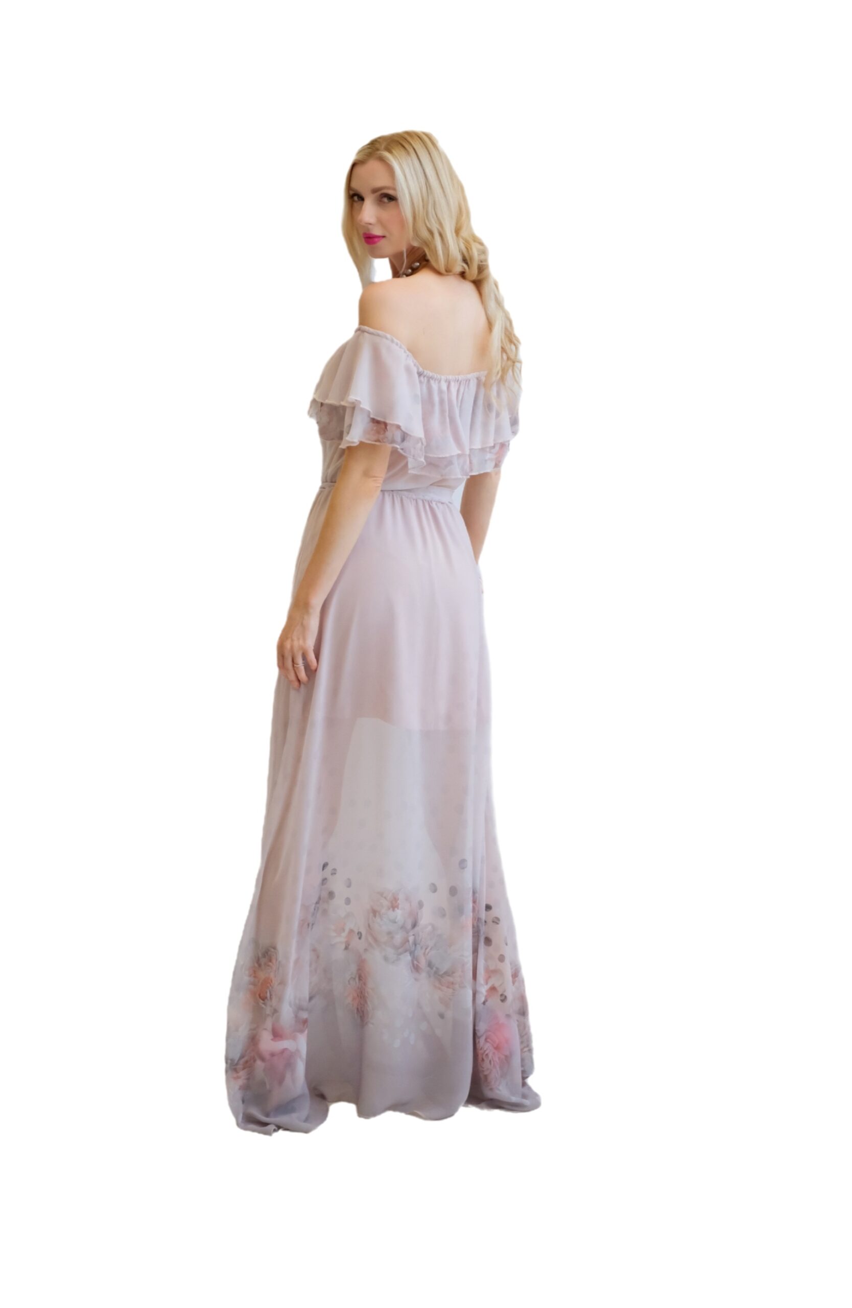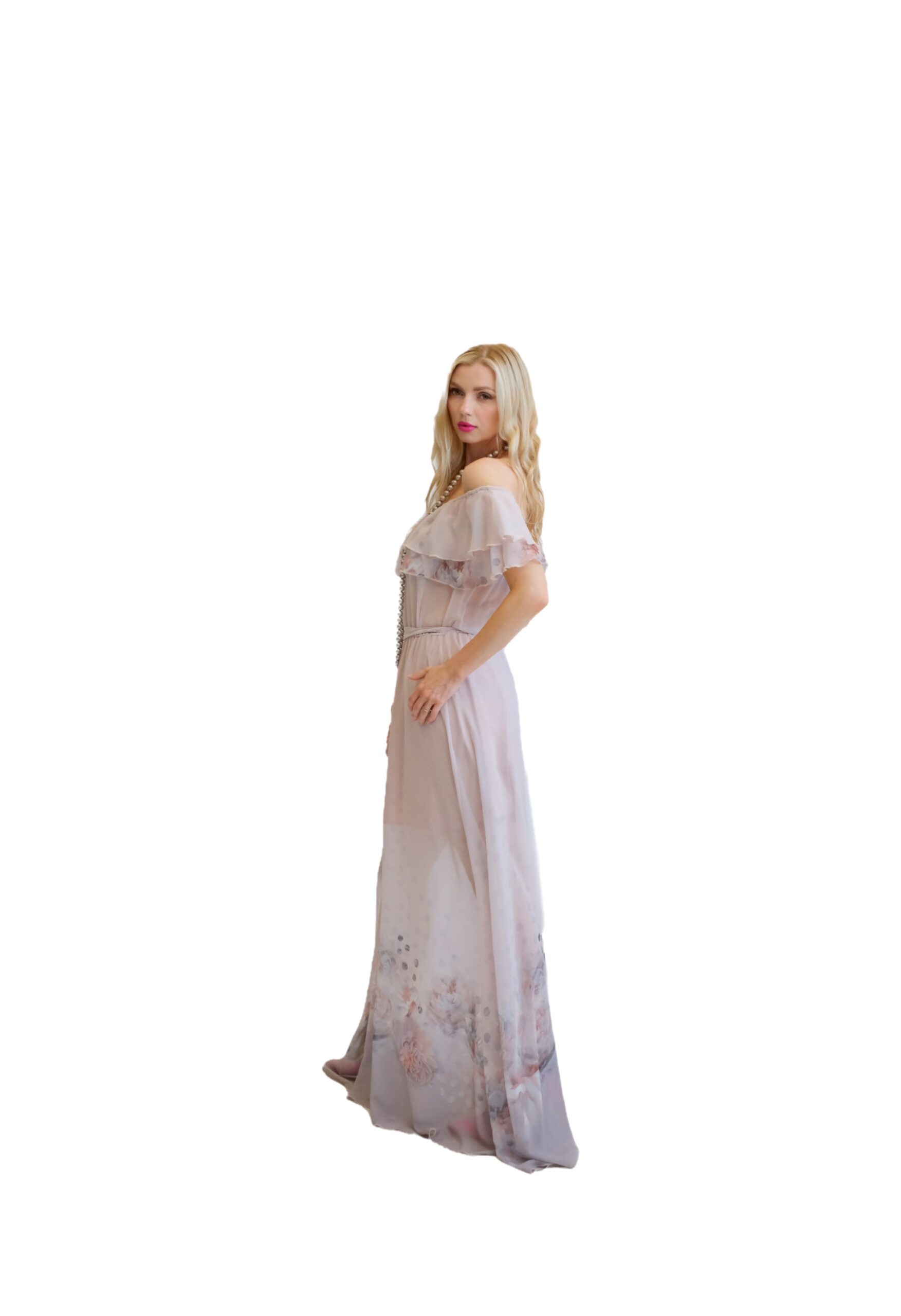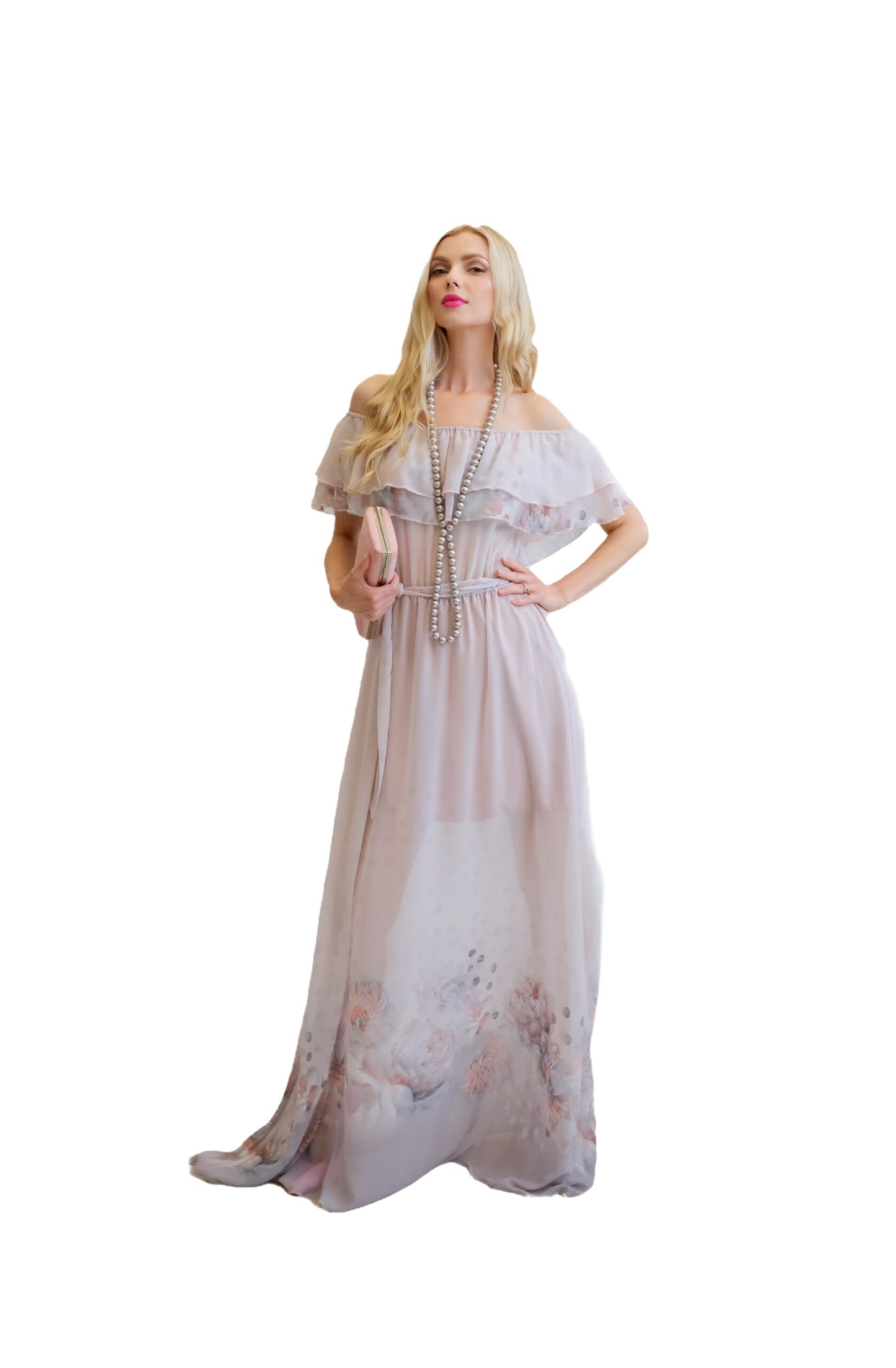 Šaty sú ušité v jednoduchom rovnom strihu so stiahnutím v páse, ktoré zabezpečuje gumička. Šaty sú navrhnuté v nádhernom a vzdušnom šifóne, ktorý v kombinácii s nazberenými volánmi v oblasti výstrihu dodáva šatám eterický dojem. Šaty majú jemnú potlač kvetov v kombinácii bežových a neutrálnych odtieňoch, ktorá ešte podčiarkuje éterickosť celého modelu. V týchto šatách budete jemnou vílou na každej letnej udalosti. Béžové farby skvele vyniknú práve v lete na a v pastelových odtieňoch ukáže aj letné opálenie.