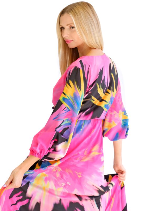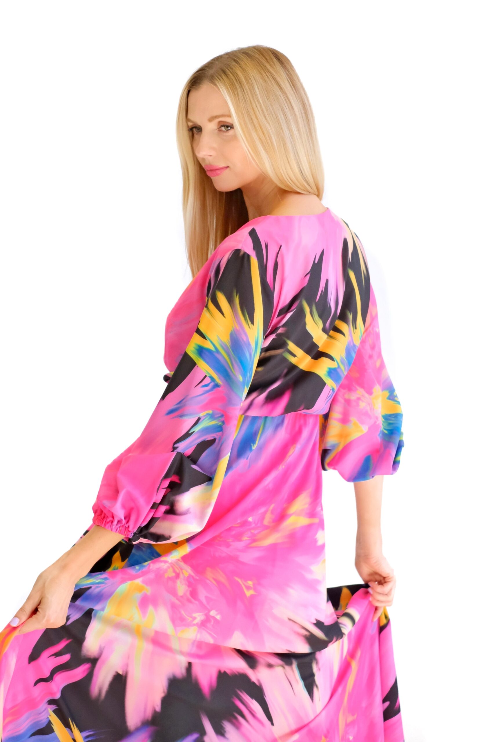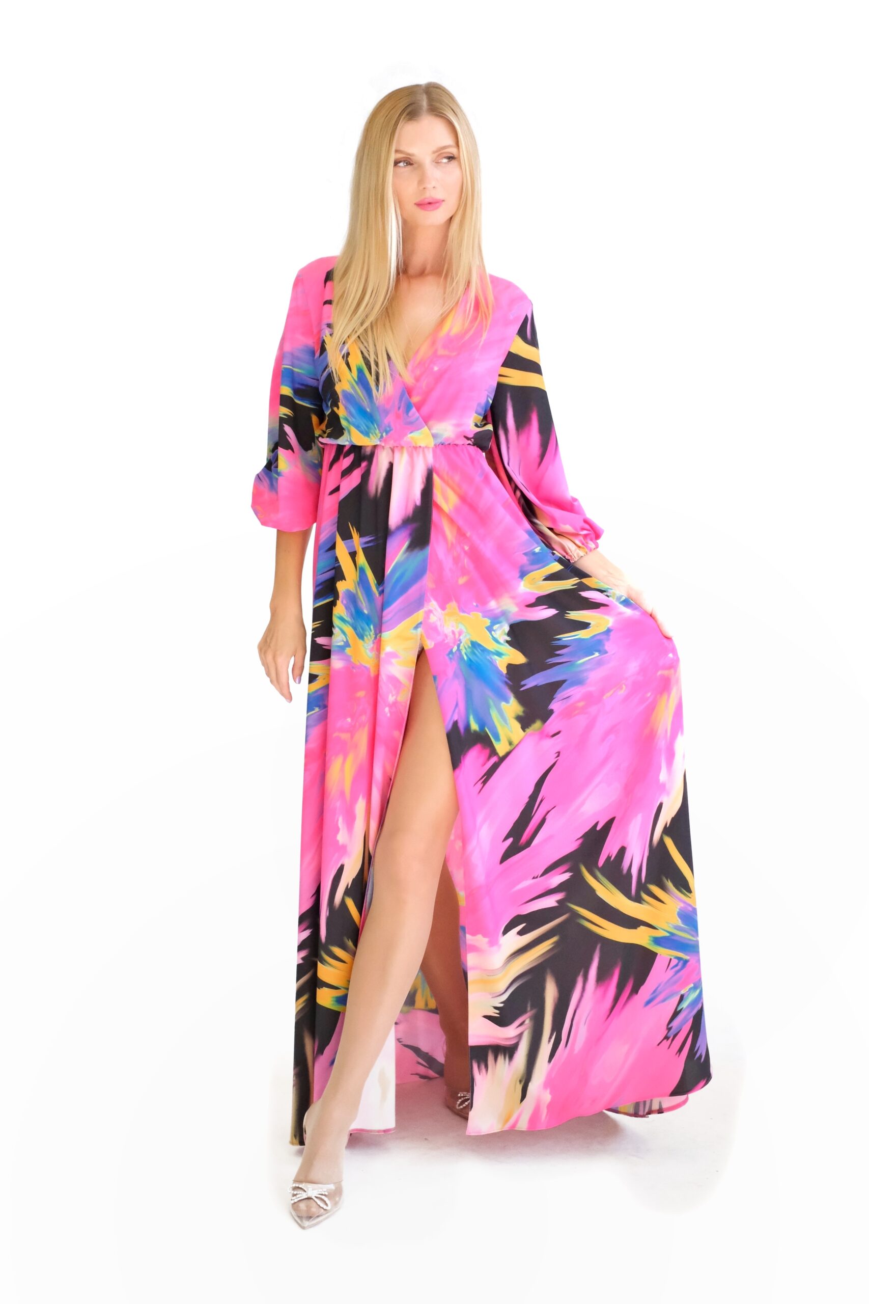 Šaty sú navrhnuté v pohodlnom strihu, ktorý je v strede stiahnutý gumičkou, tým pádom Vám dobre sadne na pás a budete sa v nich cítiť veľmi komfrotne. Šaty majú preložený výstrih, ktorý poskytuje dostatok voľnosti. Zaujímavými detailami sú bohémske rukávy a rafinovaný rozstrih až po pás, ktorý šatám dodáva šmrnc.