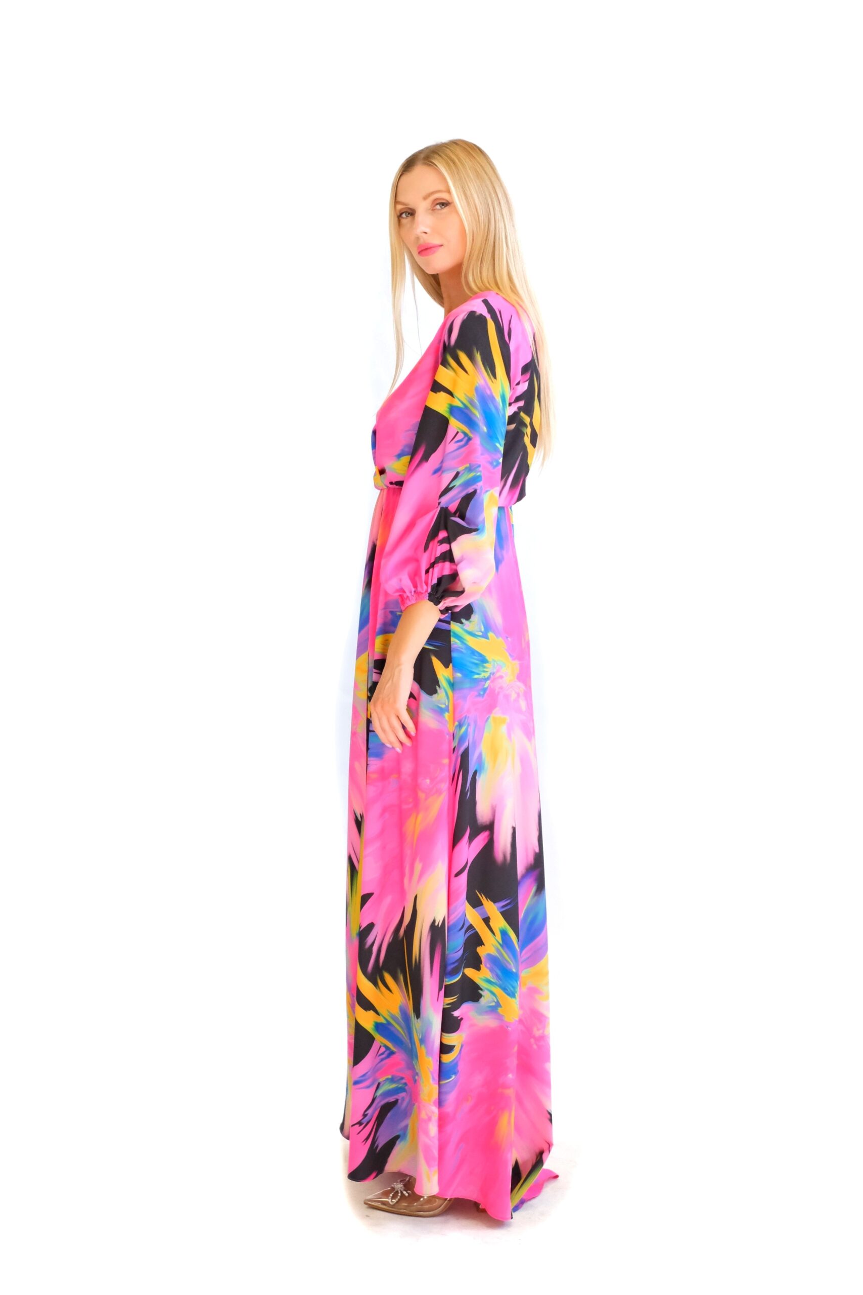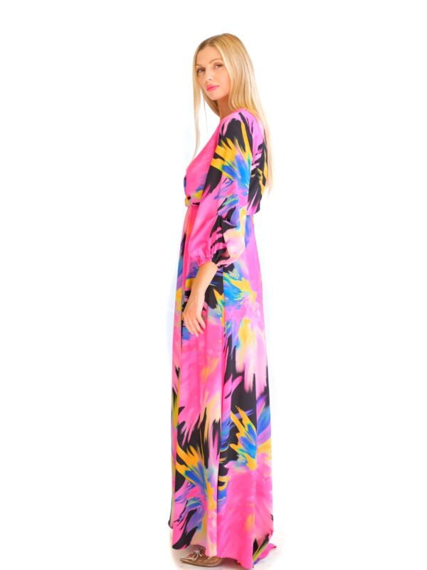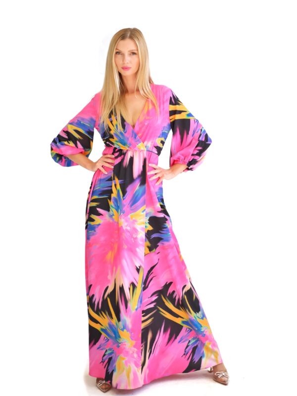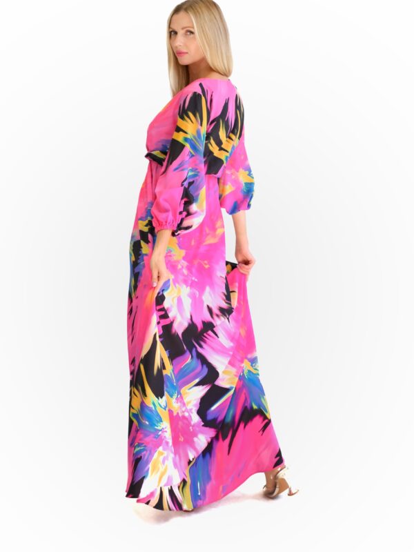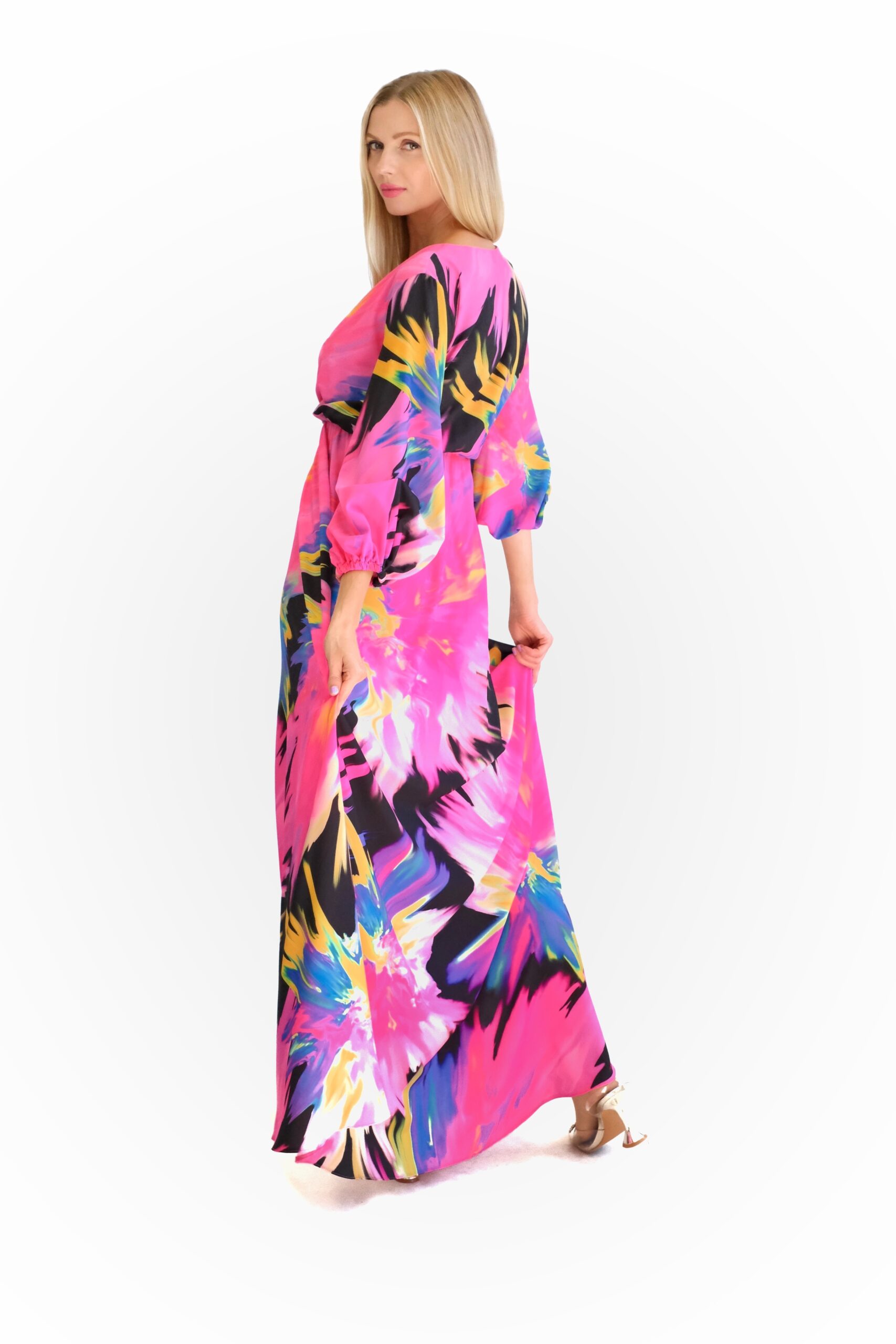 Šaty sú navrhnuté v pohodlnom strihu, ktorý je v strede stiahnutý gumičkou, tým pádom Vám dobre sadne na pás a budete sa v nich cítiť veľmi komfrotne. Šaty majú preložený výstrih, ktorý poskytuje dostatok voľnosti. Zaujímavými detailami sú bohémske rukávy a rafinovaný rozstrih až po pás, ktorý šatám dodáva šmrnc.