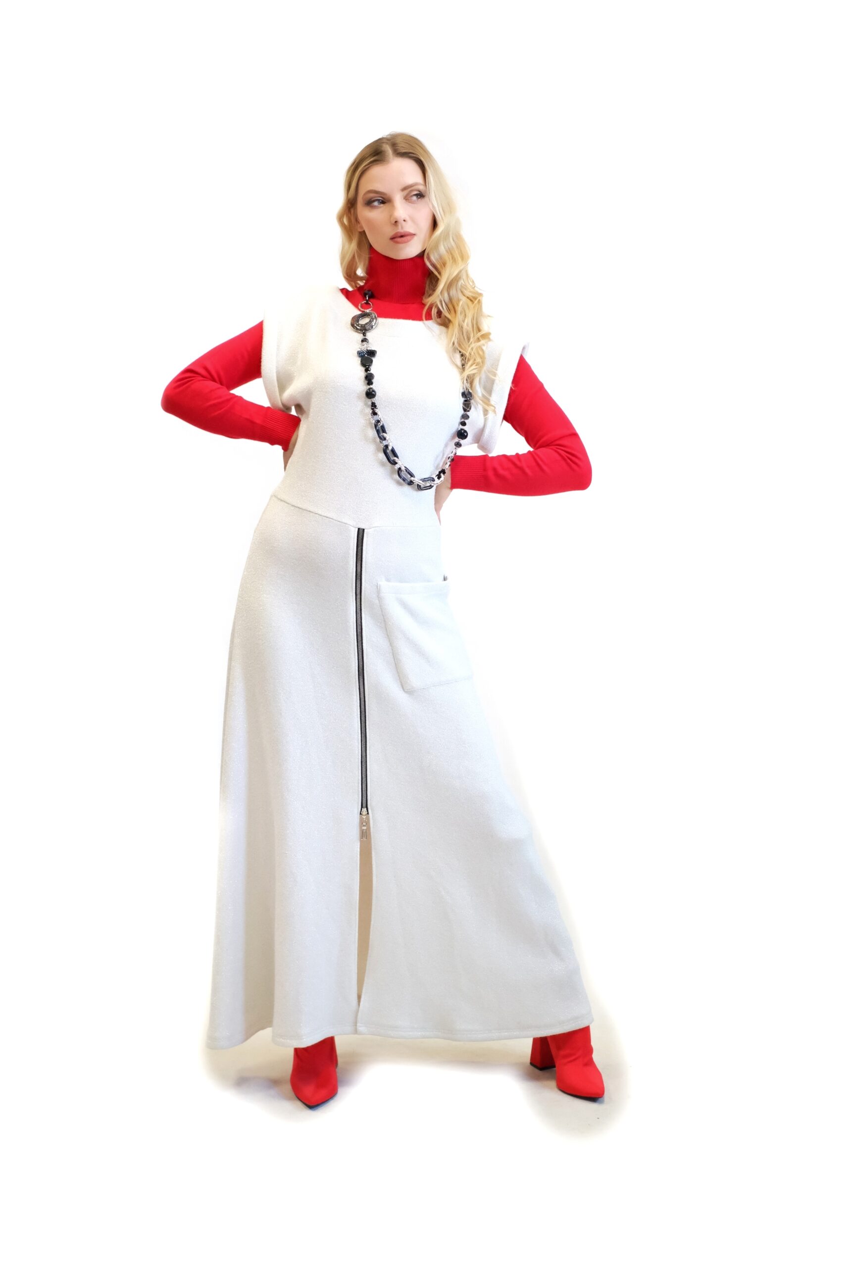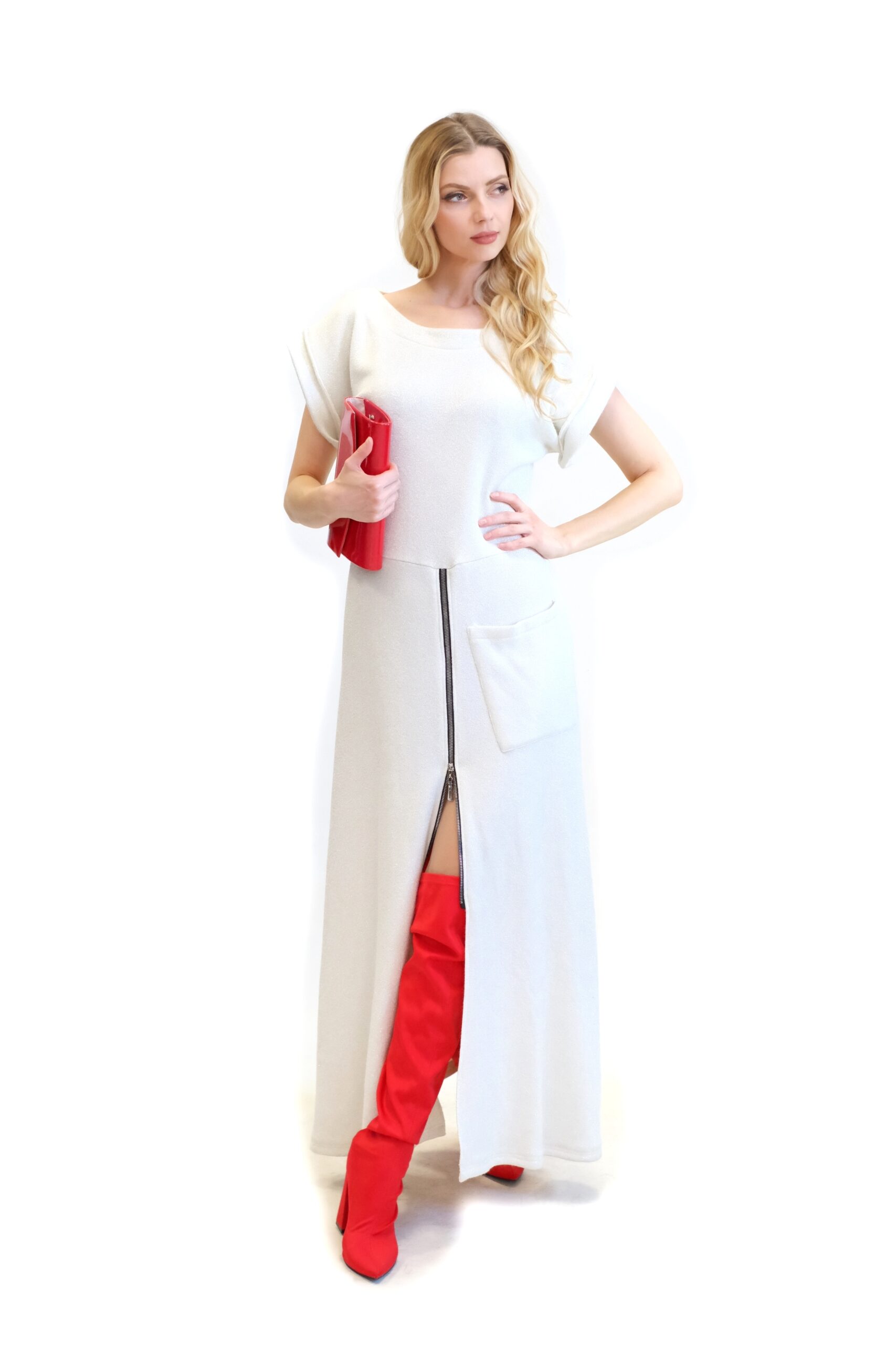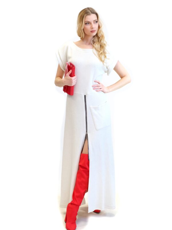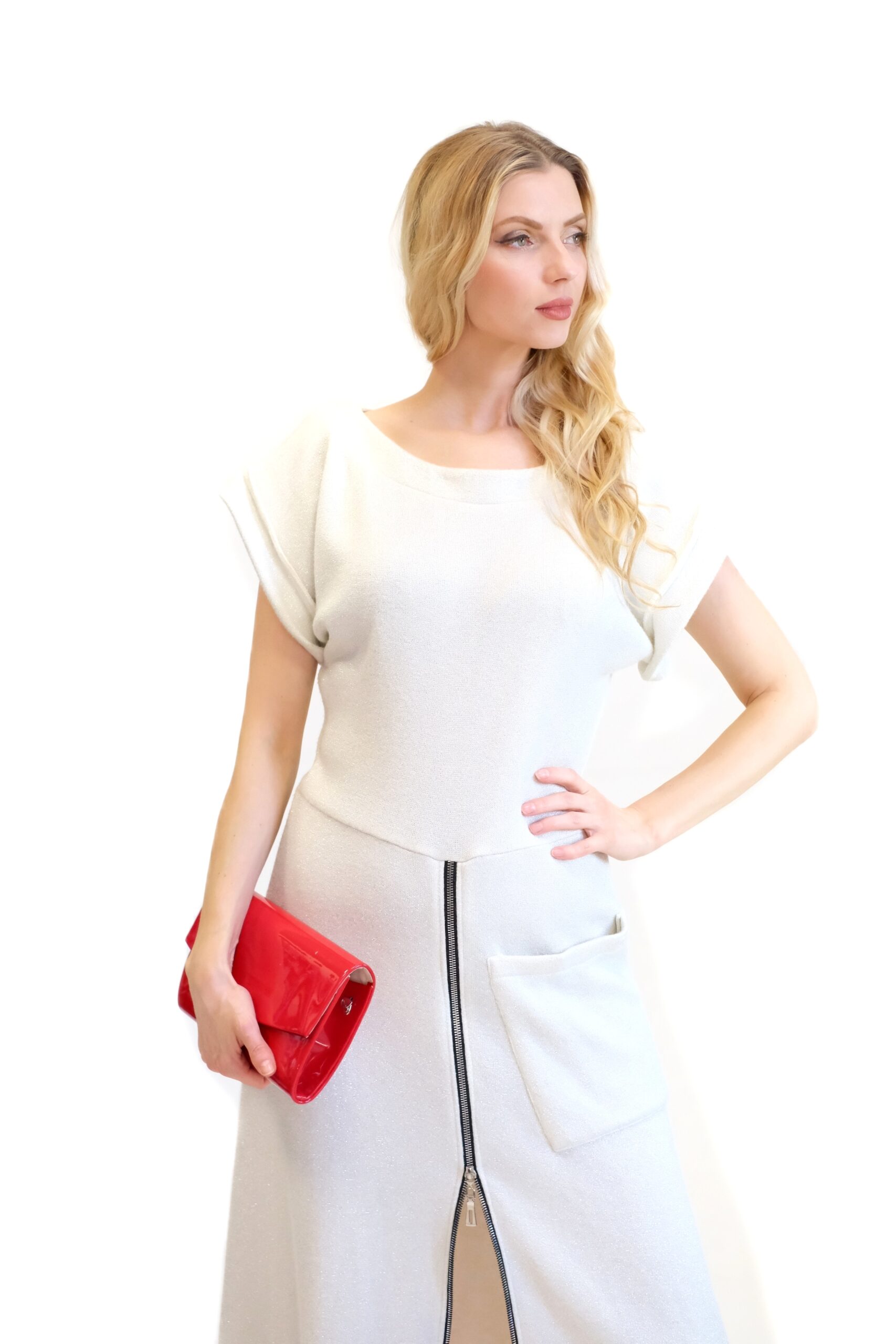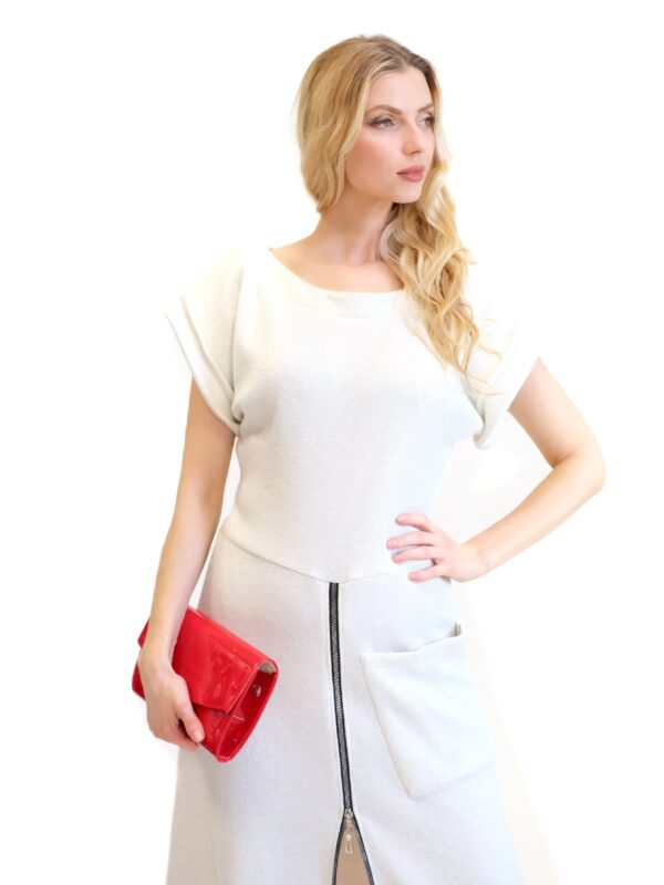 Šaty sú navrhnuté z prijemného úpletového materiálu, v ktorom sa budete cítiť komfortne počas celého dňa. Materiál je prispôsobivý a zohreje vás aj počas chladných dní. Šaty sú ušité ako skvelý doplnok na vrstvenie. Vďaka rafinovanému strihu ich dokážete nosiť počas každého ročného obdobia. Šaty sú prestrihnuté v páse a zaujímavým detailom je zips, ktorý sa ťahá po celej dĺžke suknice. Šaty majú krátke rukávy. Šaty kombinujte počas chladnejších období s kontrastnými pleteninami ako naša aranžérka.