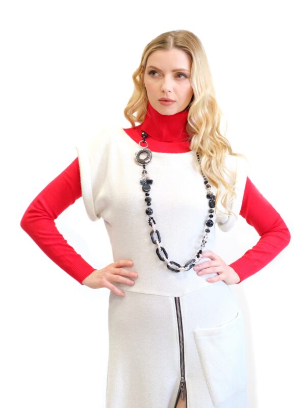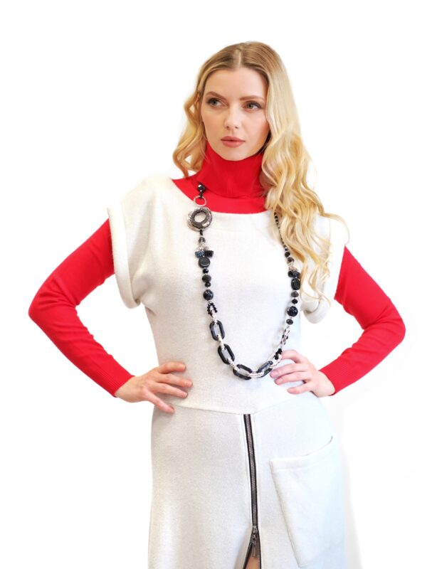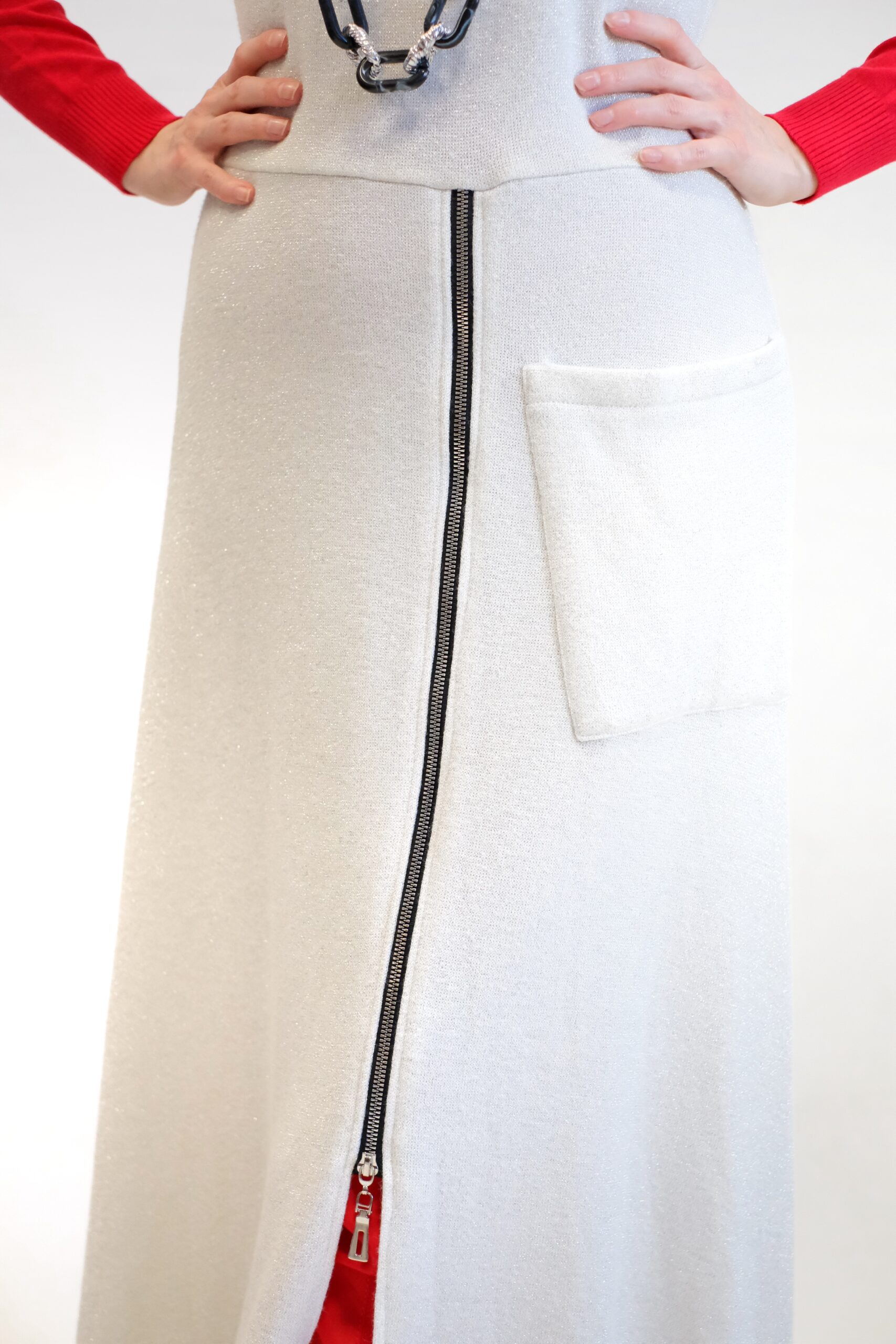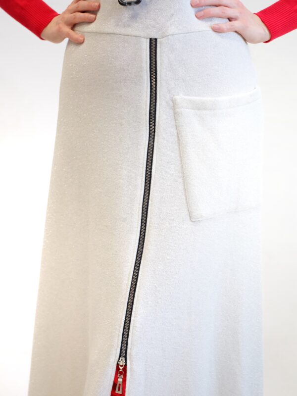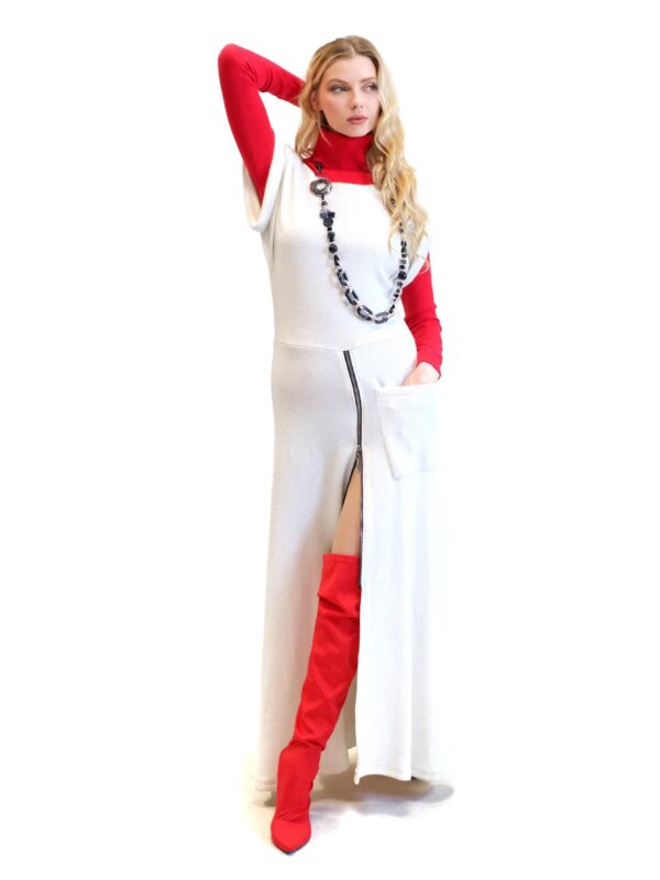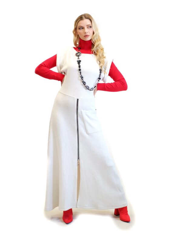 Šaty sú navrhnuté z prijemného úpletového materiálu, v ktorom sa budete cítiť komfortne počas celého dňa. Materiál je prispôsobivý a zohreje vás aj počas chladných dní. Šaty sú ušité ako skvelý doplnok na vrstvenie. Vďaka rafinovanému strihu ich dokážete nosiť počas každého ročného obdobia. Šaty sú prestrihnuté v páse a zaujímavým detailom je zips, ktorý sa ťahá po celej dĺžke suknice. Šaty majú krátke rukávy. Šaty kombinujte počas chladnejších období s kontrastnými pleteninami ako naša aranžérka.