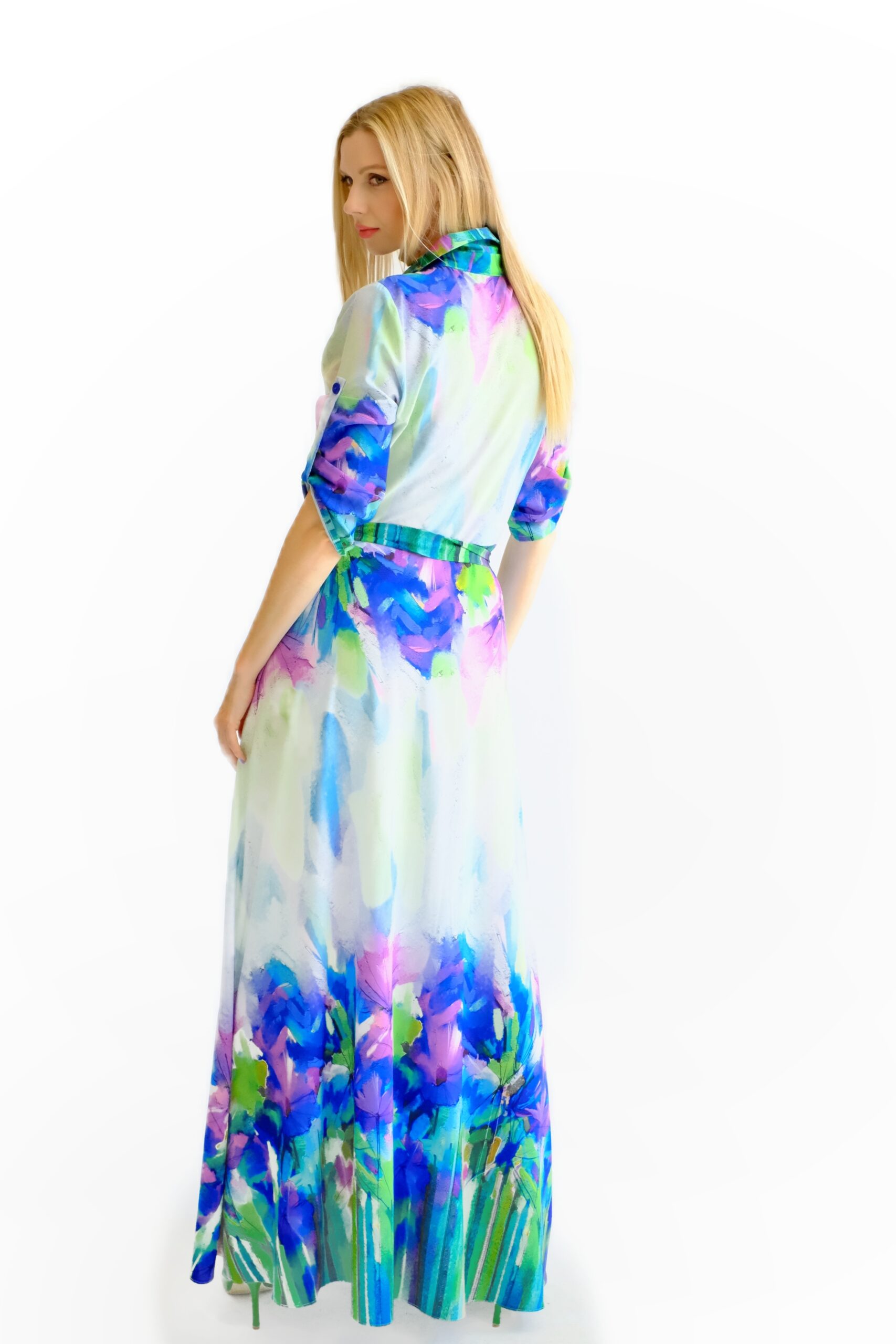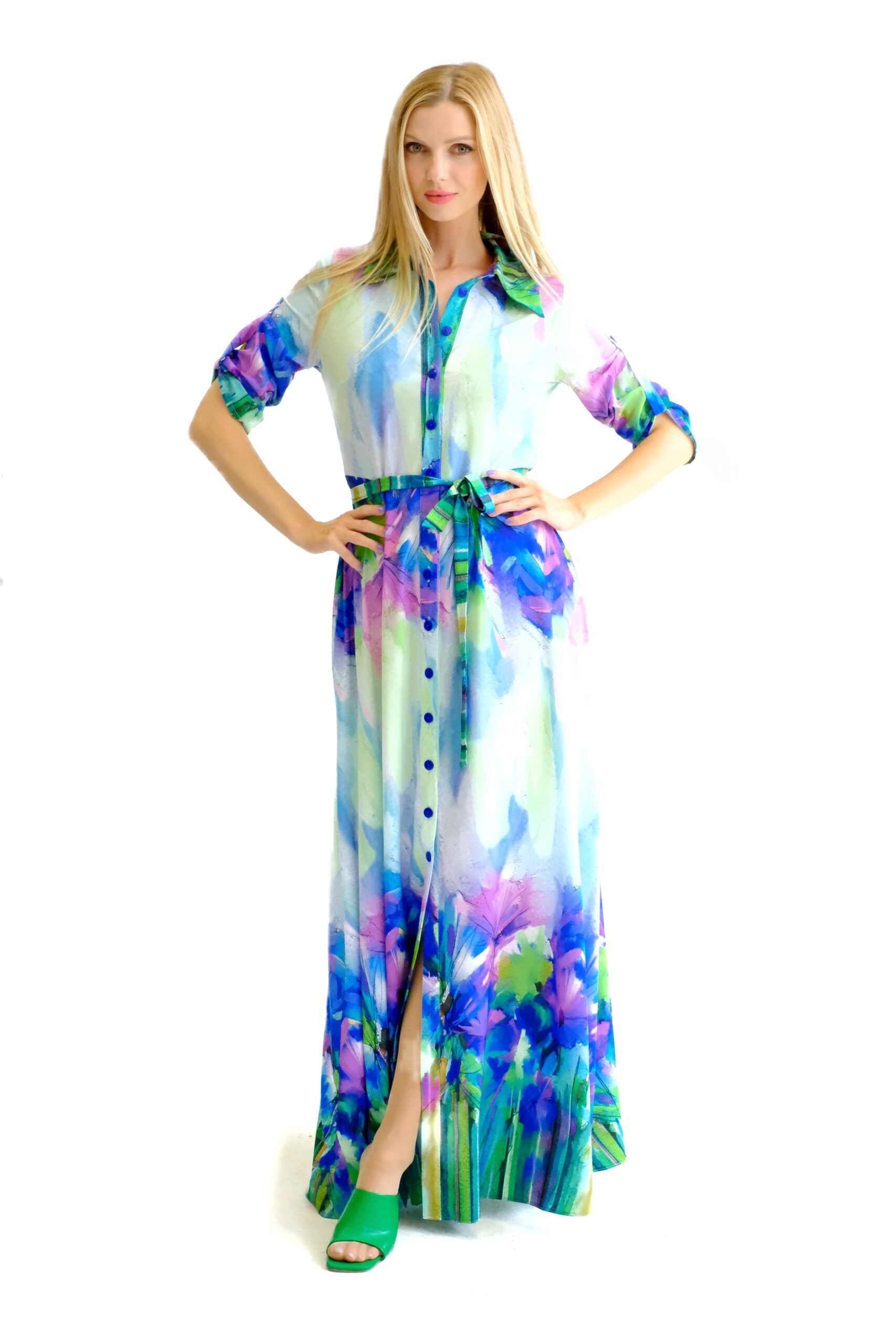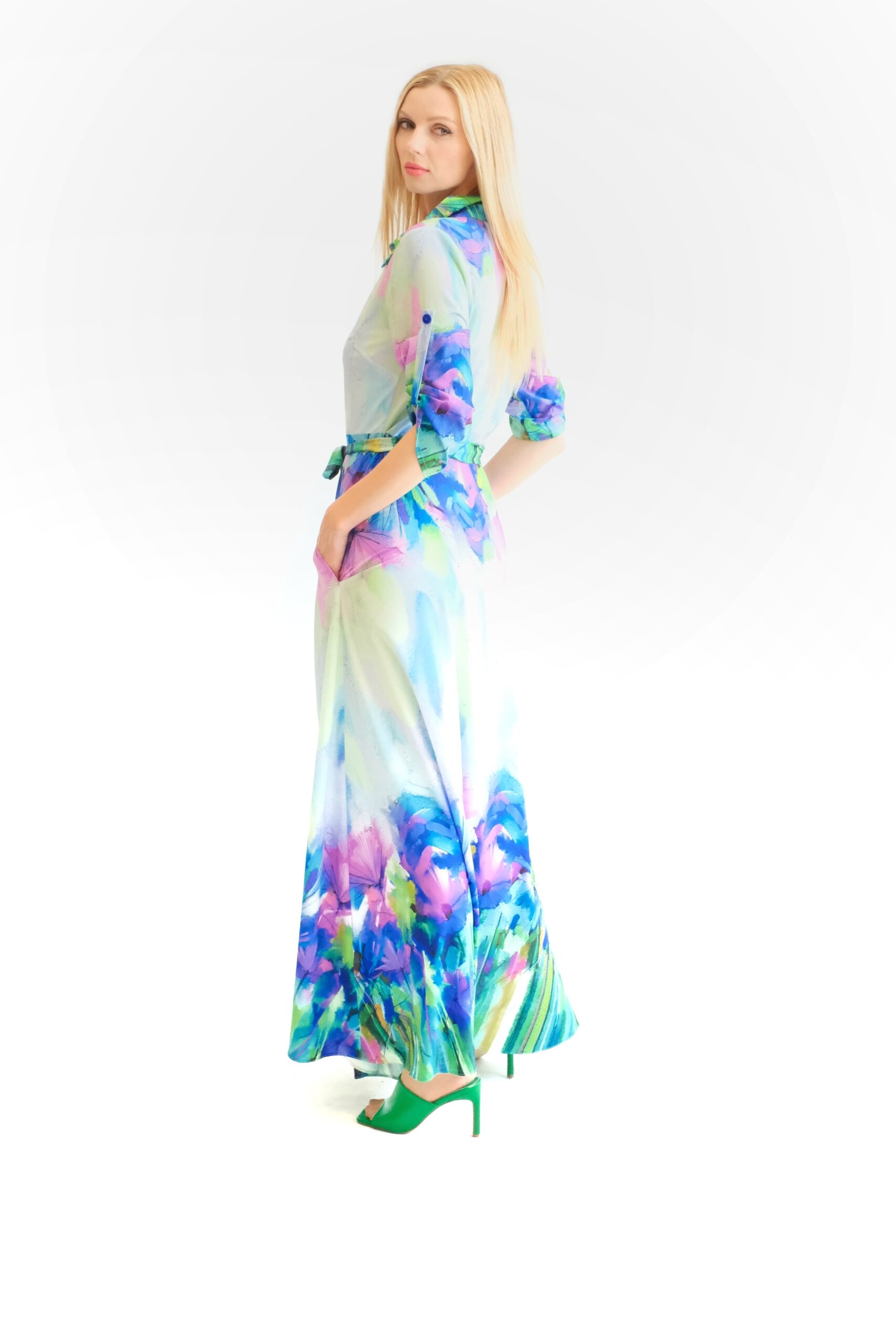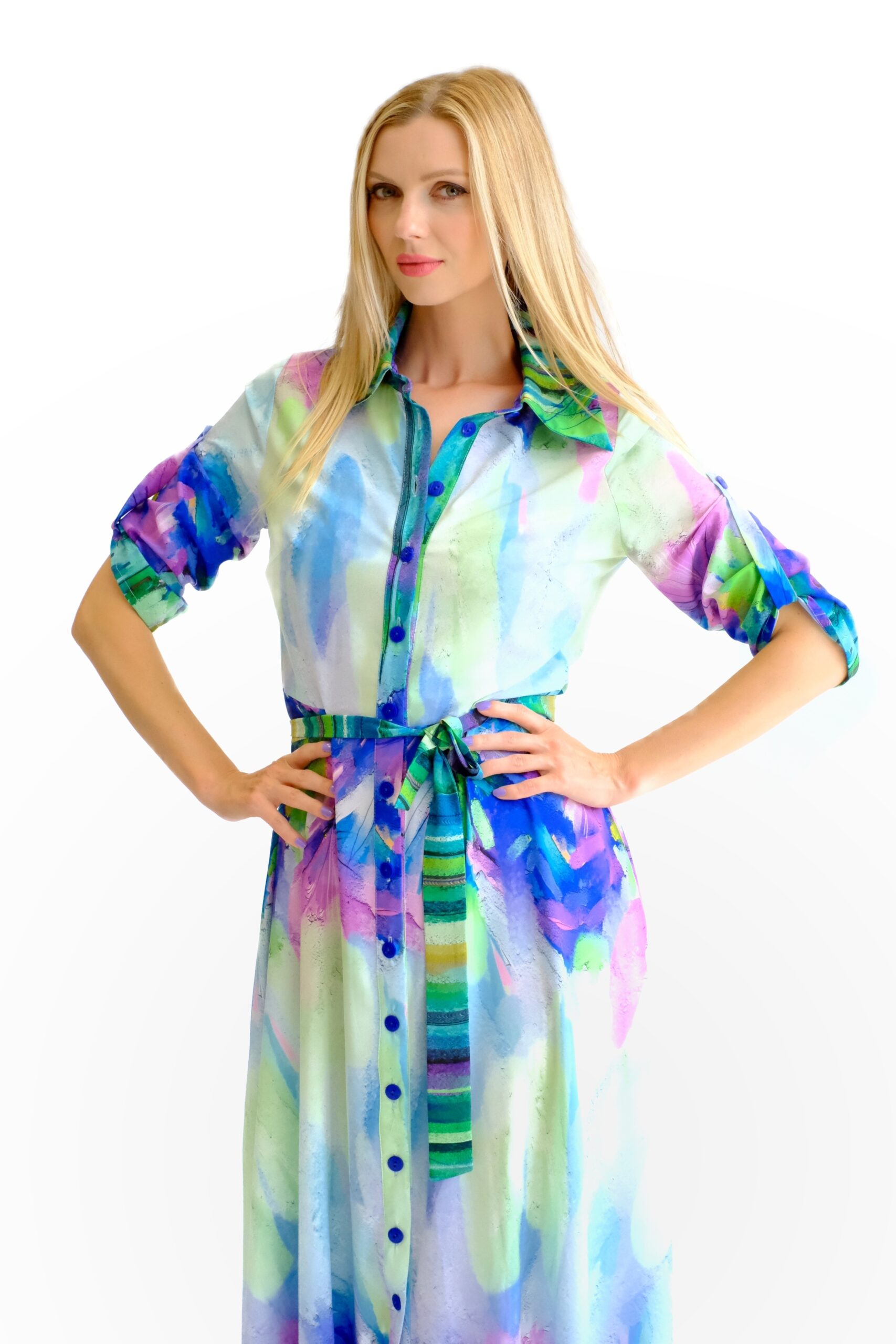 Šaty sú ušité v obľúbenom košeľovom strihu, ktorý skvele sadne na každý typ postavy. Šaty sú prestrihnuté v oblasti pásu a majú rukávy, ktoré sa dajú vyhrnúť . K šatám je priložený opasok z rovnakého materiálu. Najvýraznejším prvkom na šatách je jednoznačne výrazný motív, ktorý pripomína maľbu na plátne. Potlač žiari výraznými odtieňmi leta a to modrou, fialovou a zelenou. Kombinujte s cyklamenovými doplnkami ako naša aranžérka pre wow efekt.