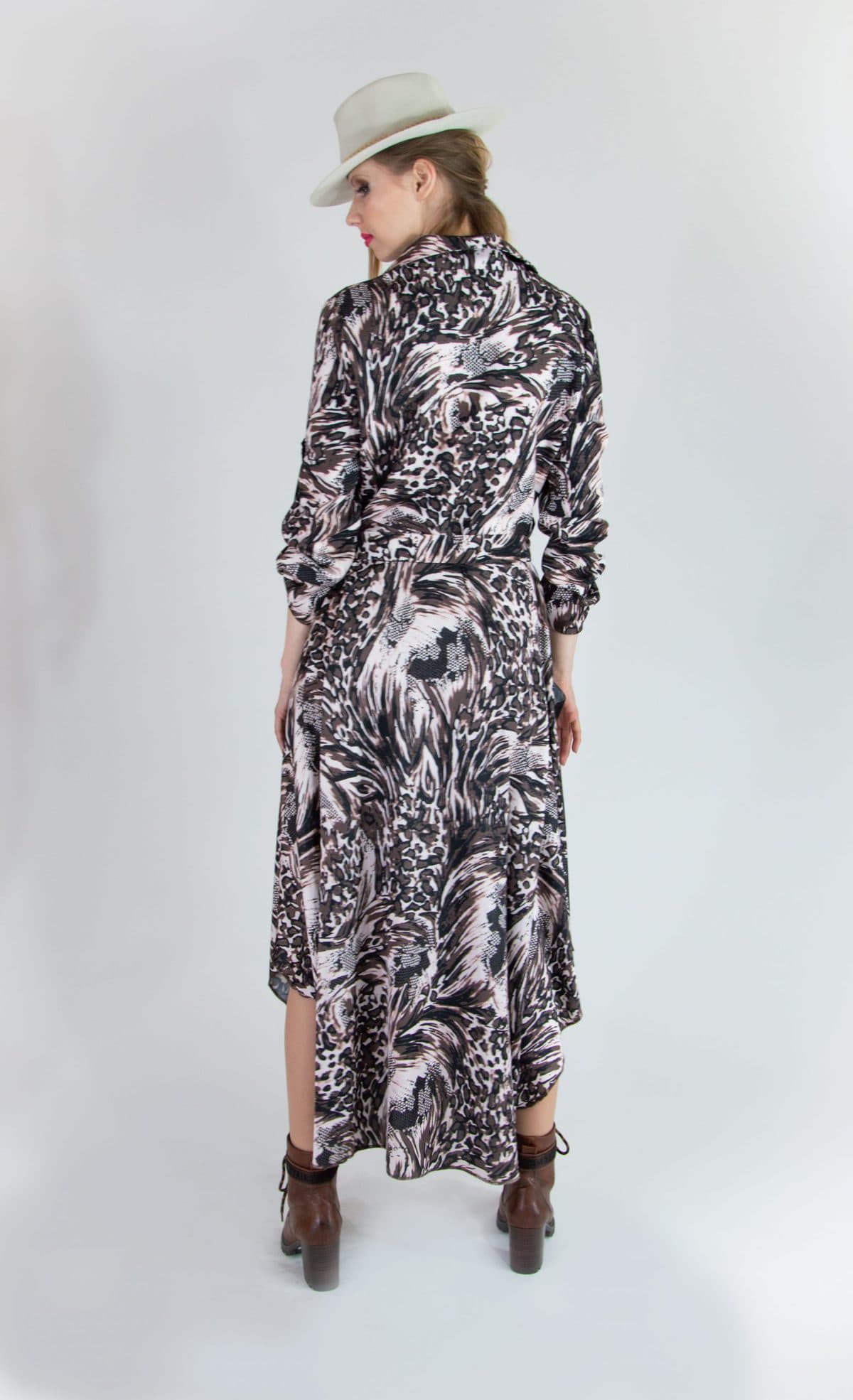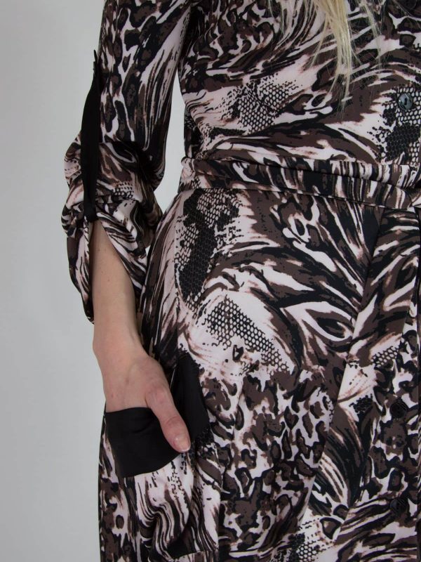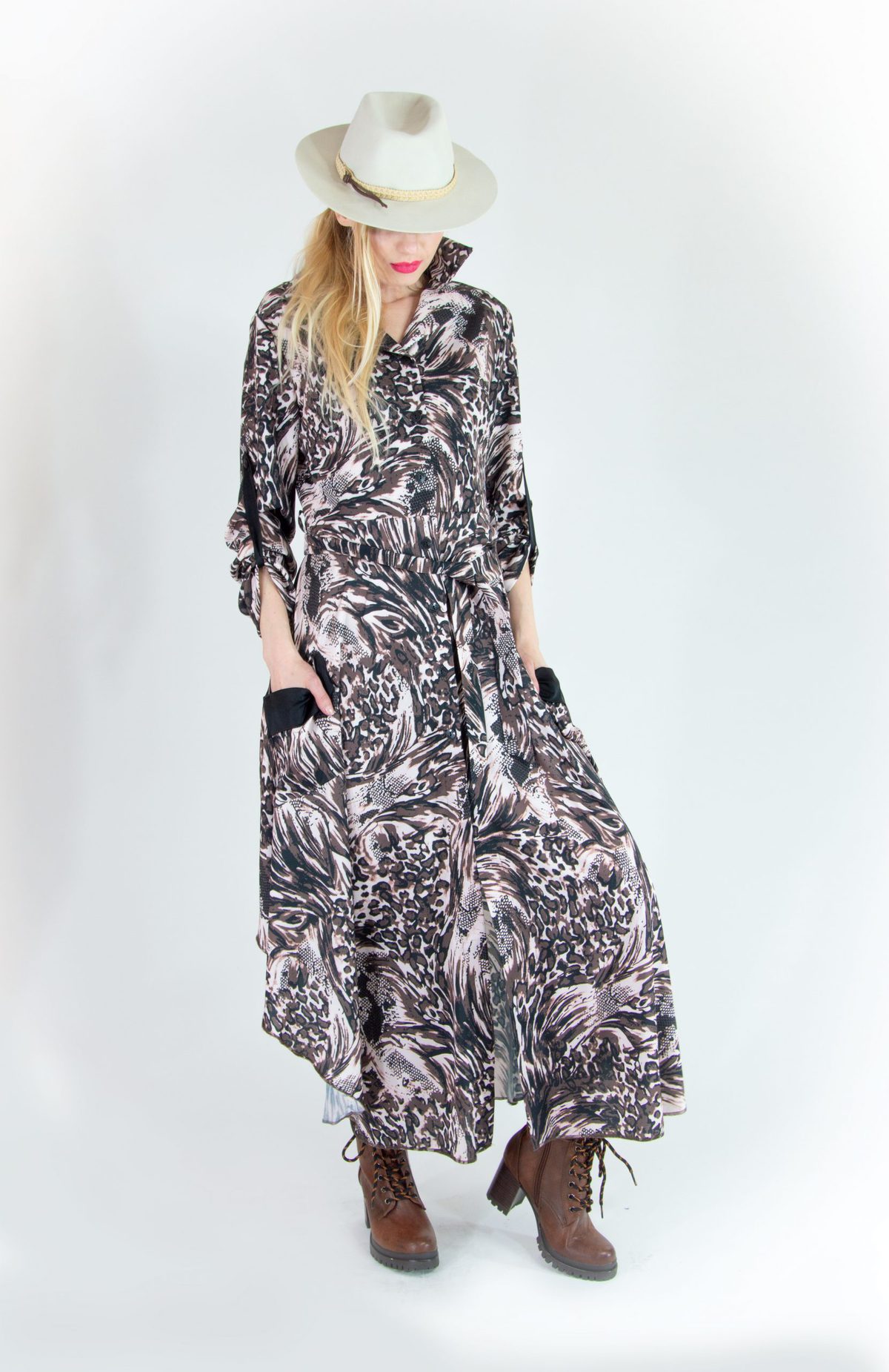 Dlhé šaty ušité v obľúbenom košeľovom strihu, ktorý je rovný a skvele pristane na každú postavu. Šaty sú veľmi pohodlné aj vďaka materiálu a dajú sa nosiť s opaskom alebo aj bez. Šaty majú opasok z rovnakého materiálu a kontrastné vrecká. Šaty sú ušité vo zvieracom vzore, ktorý slávi veľký návrat posledné obdobie.