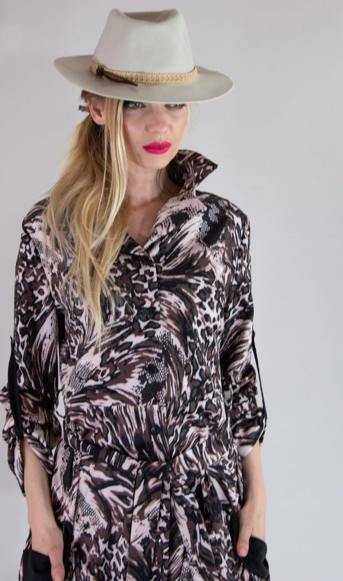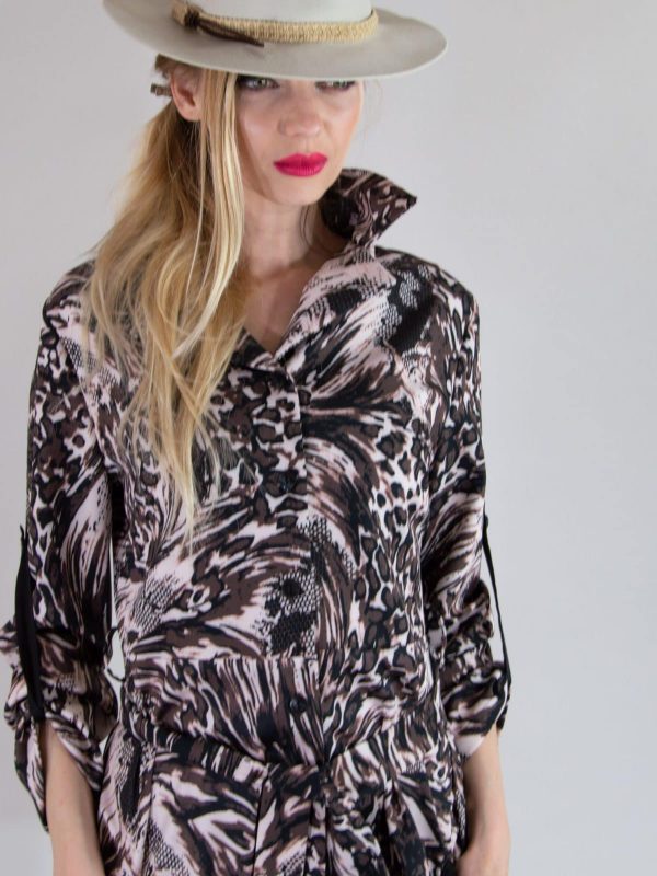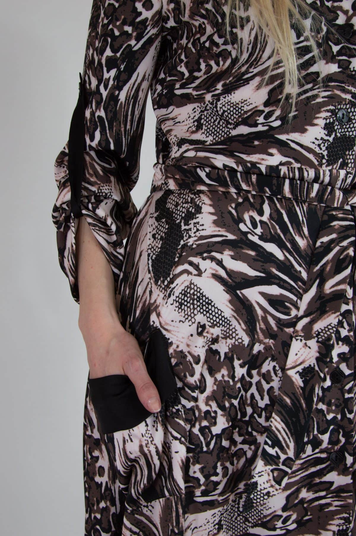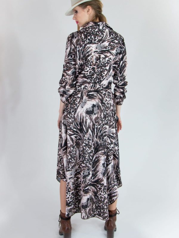 Dlhé šaty ušité v obľúbenom košeľovom strihu, ktorý je rovný a skvele pristane na každú postavu. Šaty sú veľmi pohodlné aj vďaka materiálu a dajú sa nosiť s opaskom alebo aj bez. Šaty majú opasok z rovnakého materiálu a kontrastné vrecká. Šaty sú ušité vo zvieracom vzore, ktorý slávi veľký návrat posledné obdobie.