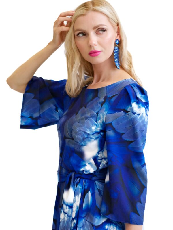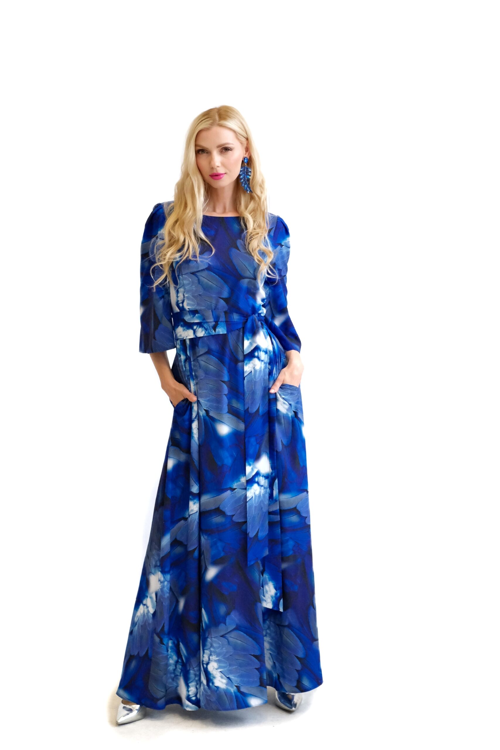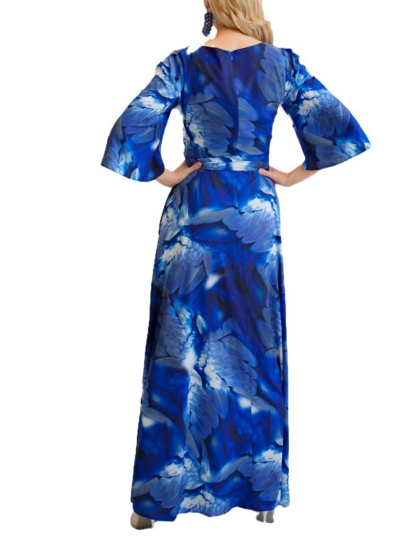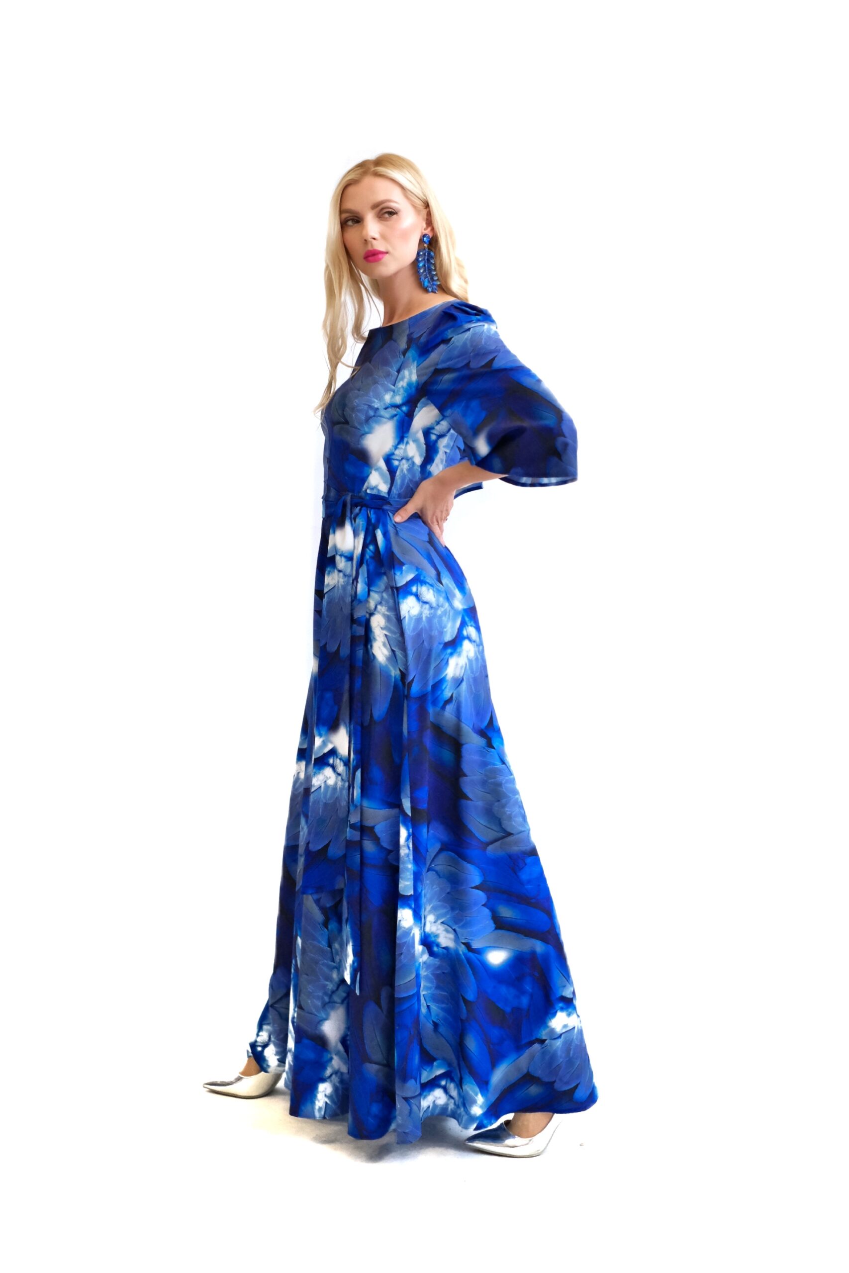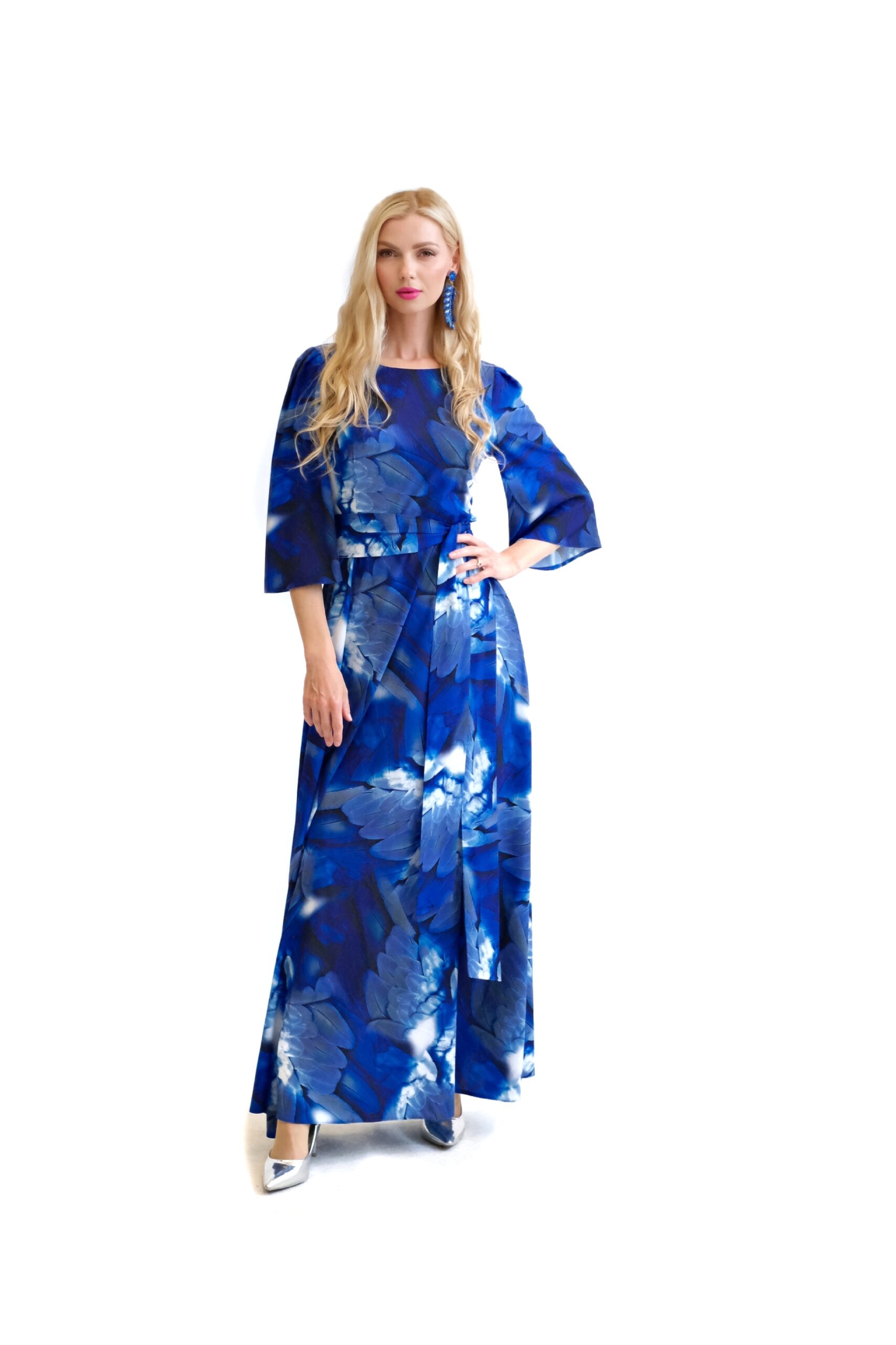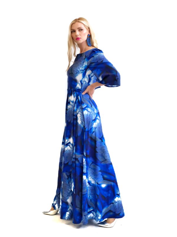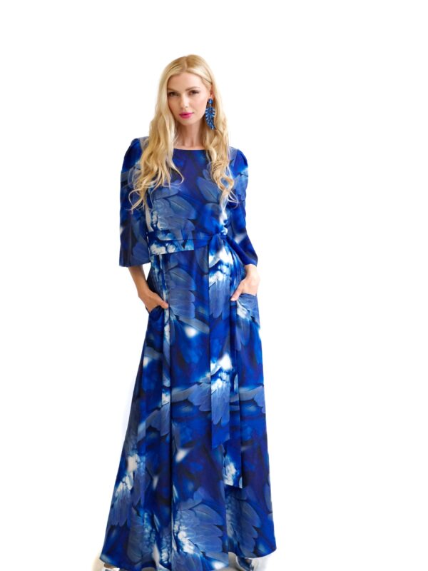 Šaty sú navrhnuté v prepracovanom strihu s dĺžkou až po zem. Šaty majú zdôraznený pás, ktorý podčiarkuje široký opasok, ktorý je ich neoddeliteľnou súčasťou. Šaty majú voľné, vzdušné rukávy, v ktorých sa budete cítiť komfortne aj počas horúcich letných dní. Šaty hrajú všetkými odtieňmi modrej s náznakom bielej farby. Kombinujte ich s modrými, striebornými alebo bielymi doplnkami ako naša aranžérka.