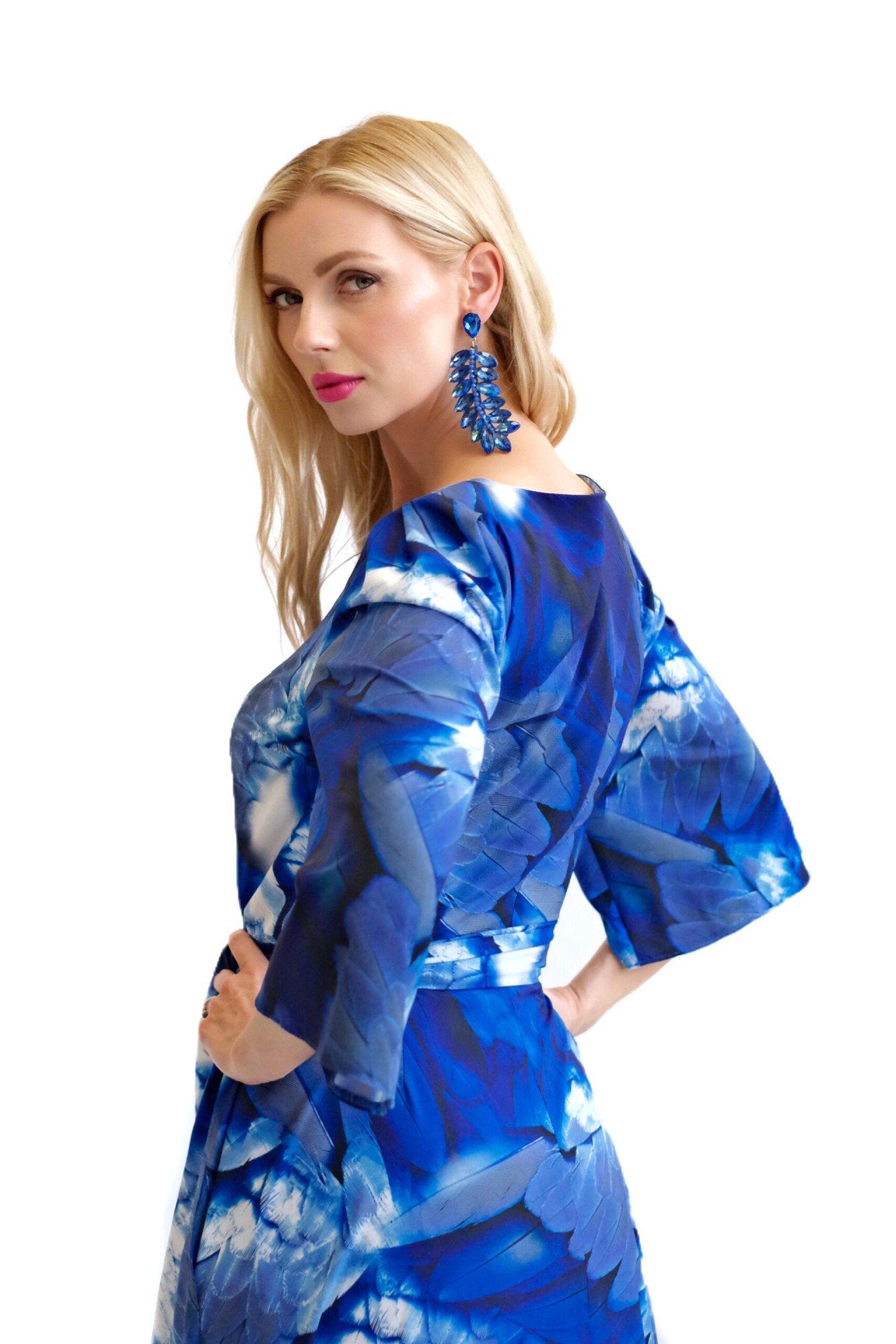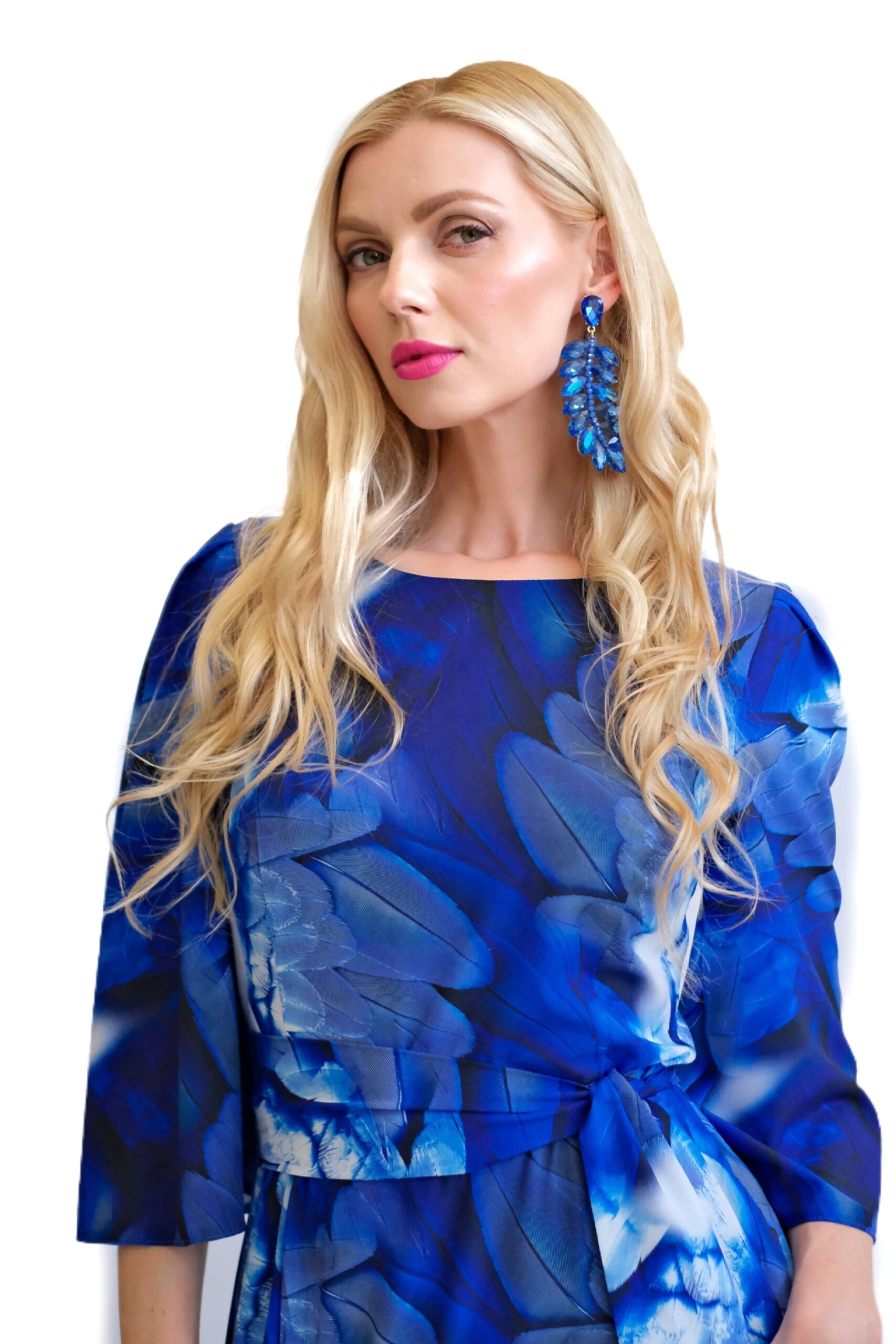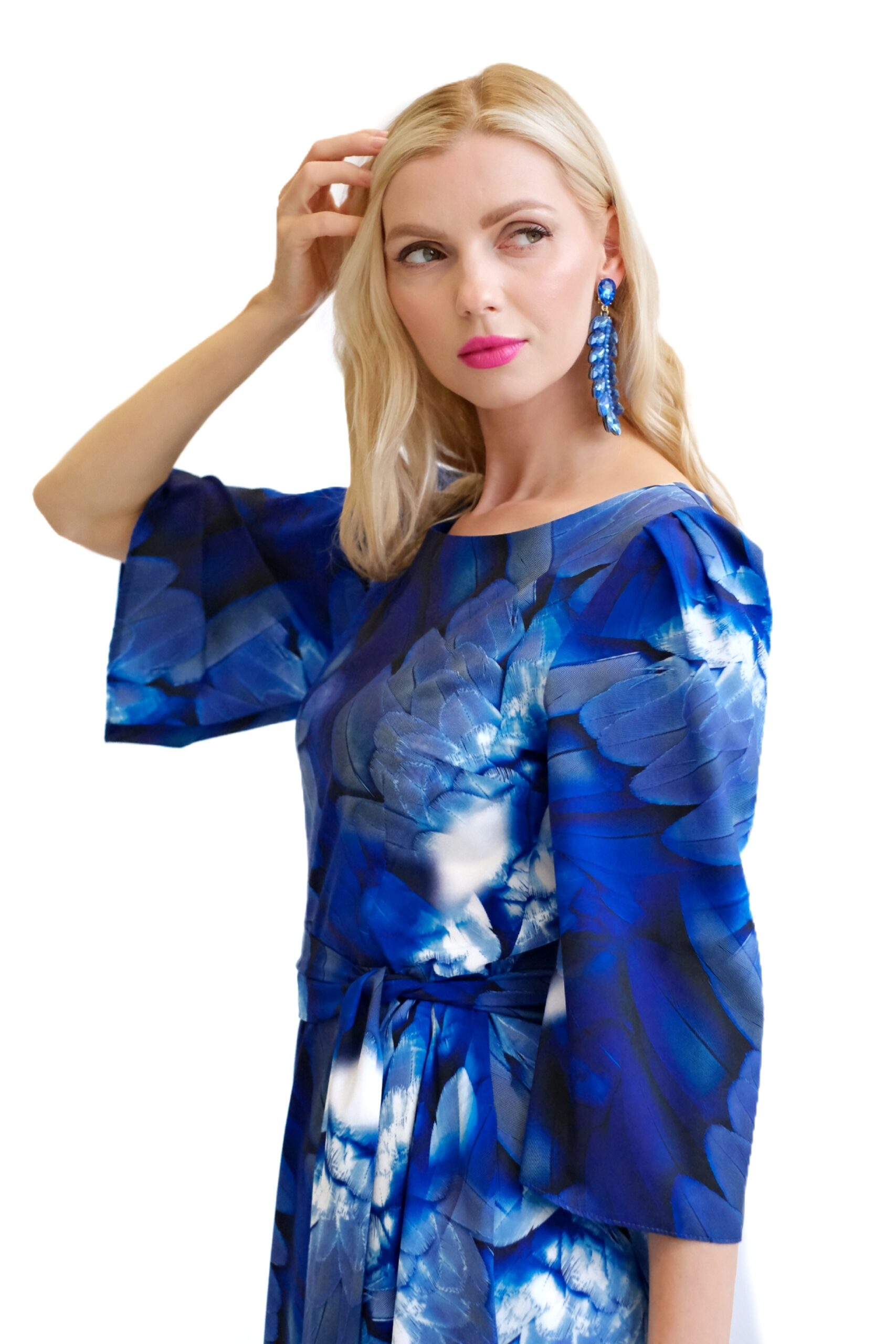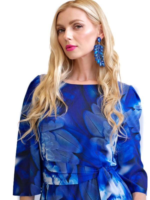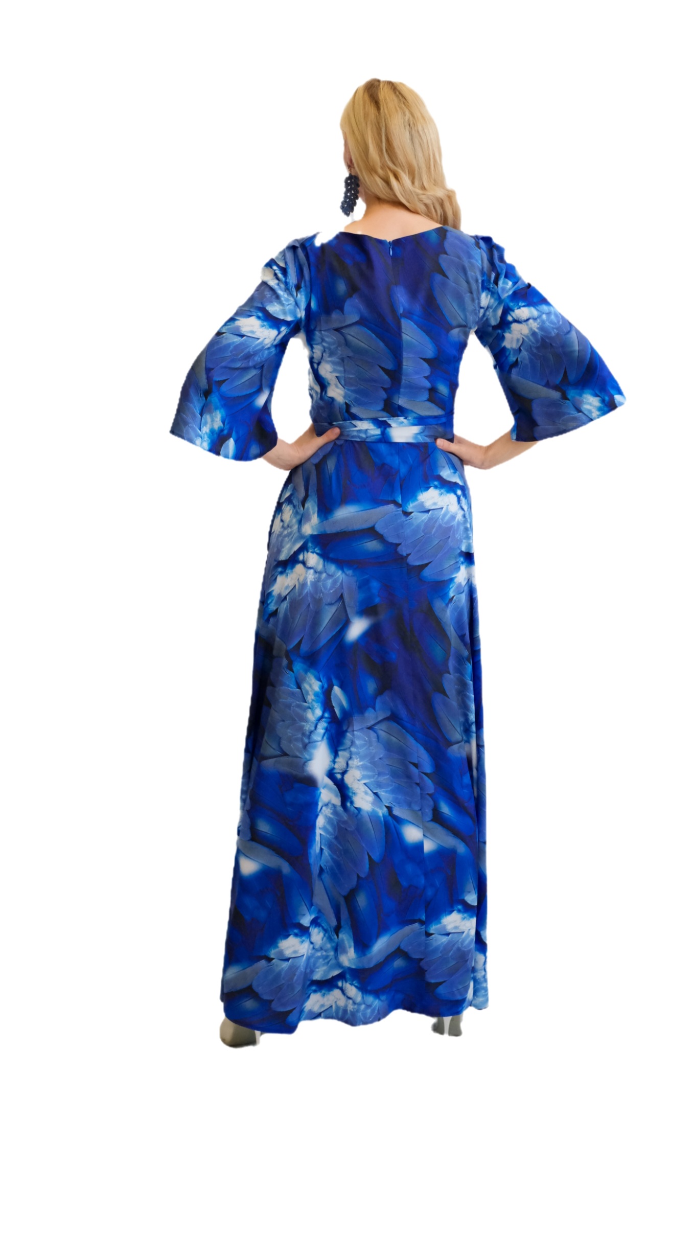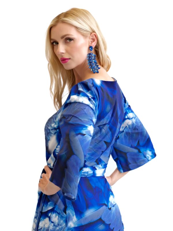 Šaty sú navrhnuté v prepracovanom strihu s dĺžkou až po zem. Šaty majú zdôraznený pás, ktorý podčiarkuje široký opasok, ktorý je ich neoddeliteľnou súčasťou. Šaty majú voľné, vzdušné rukávy, v ktorých sa budete cítiť komfortne aj počas horúcich letných dní. Šaty hrajú všetkými odtieňmi modrej s náznakom bielej farby. Kombinujte ich s modrými, striebornými alebo bielymi doplnkami ako naša aranžérka.