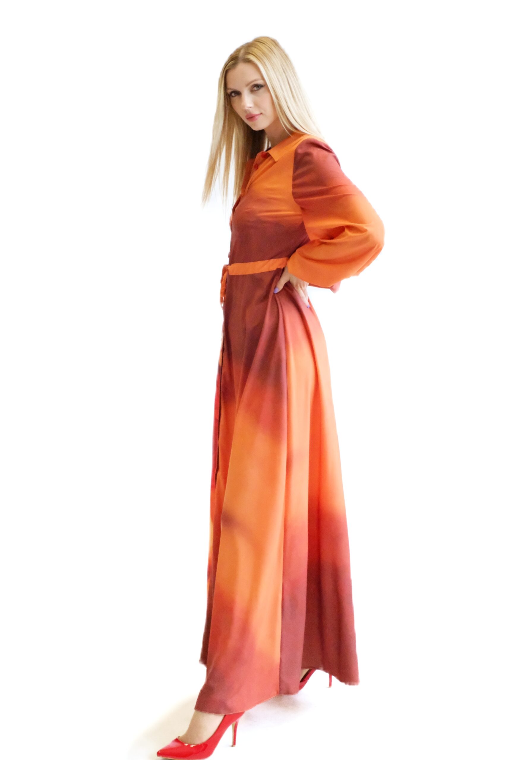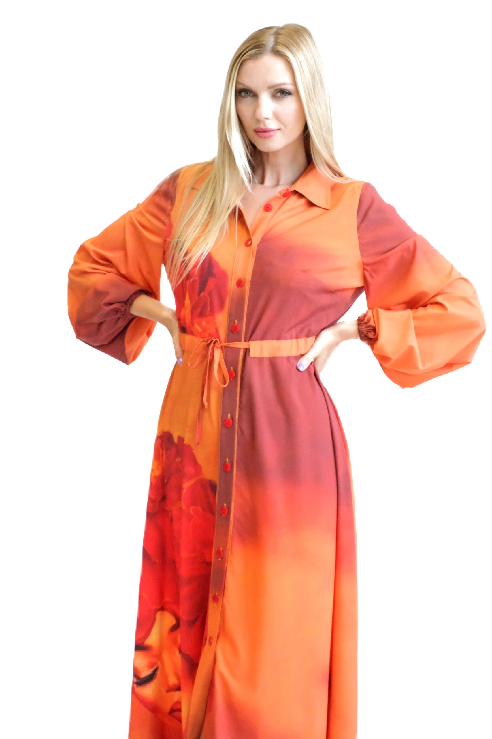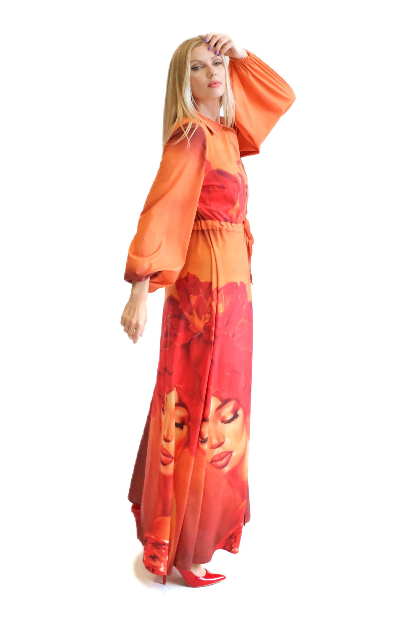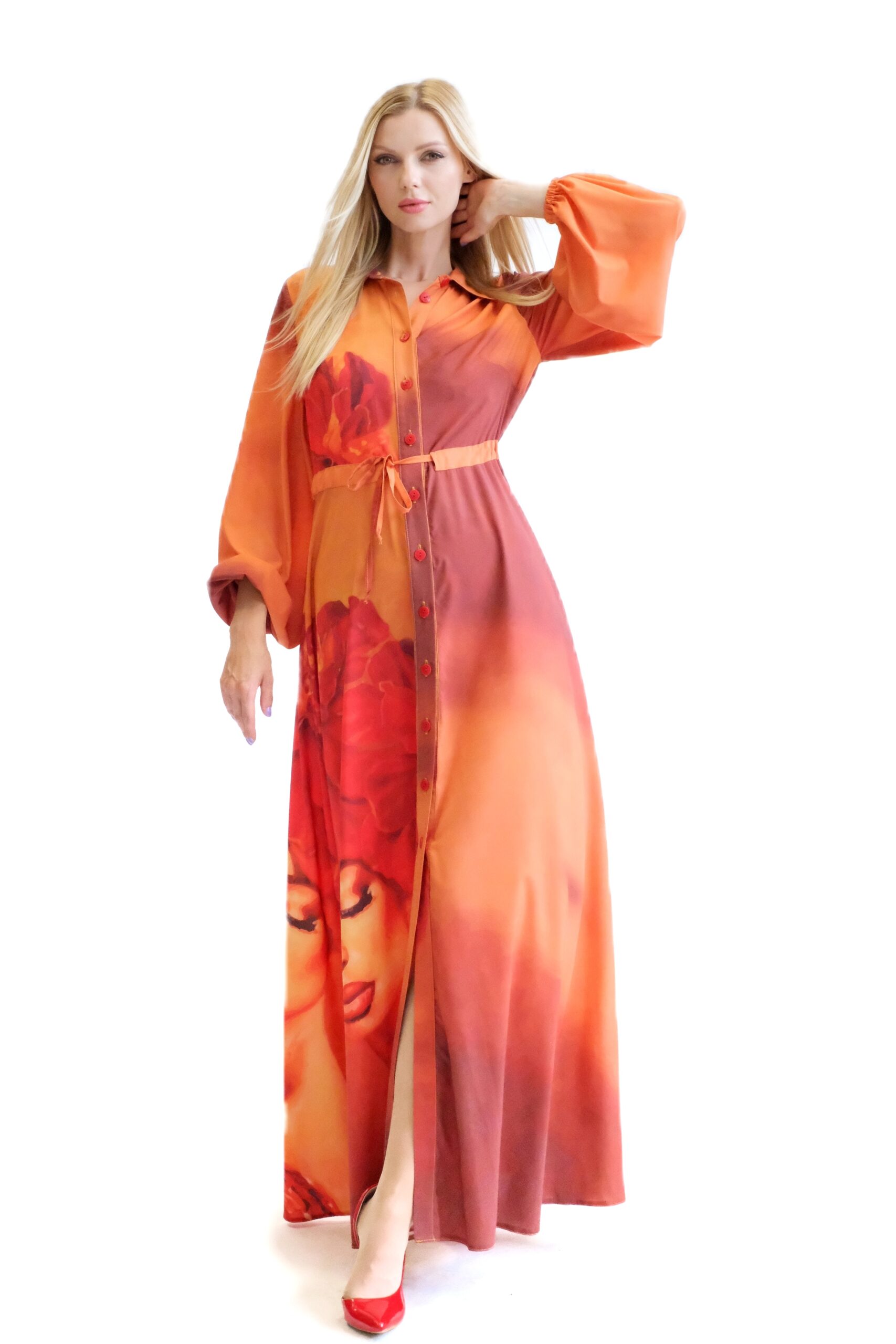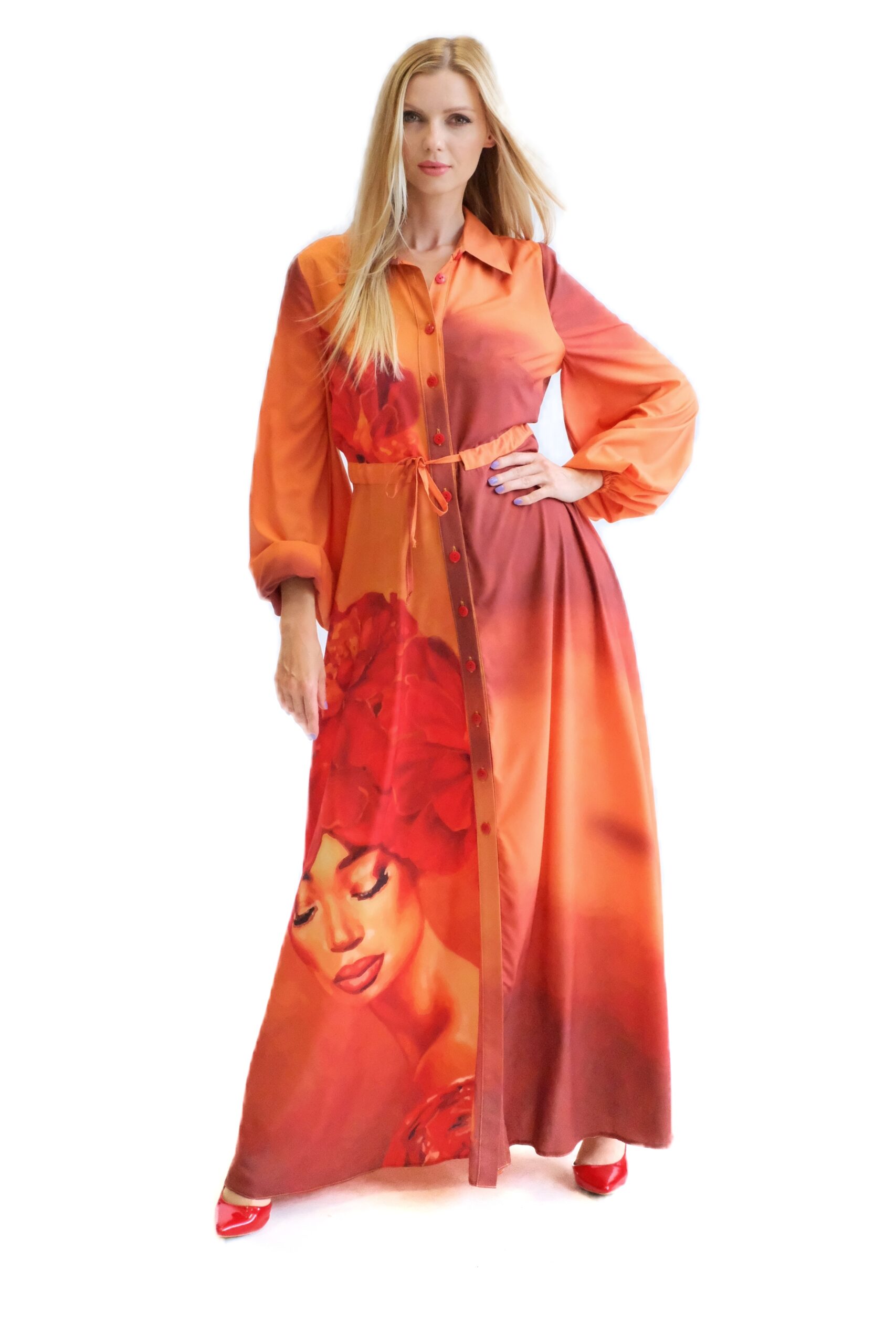 Šaty sú navrhnuté v pohodlnom košeľovom strihu s dĺžkou až po zem. Šaty výborne sadnú, vďaka rovnému strihu na rôzne typy postáv, a aj vďaka ich vzdušnosti sa v nich budete cítiť výborne aj počas horúcich letných dní. Šaty majú hodinkové voľné rukávy, ktoré im dodávajú na elegancii a pohodlnosti. Zaujímavým detailom je práve výrazný motív ženy, ktorí s použitím zemských farieb evokuje a horúce leto. Najvýraznejším je práve portrét ženy, ktorý dominuje celému kúsku. Kombinujte so zlatými doplnkami ako naša aranžérka pre wow efekt.