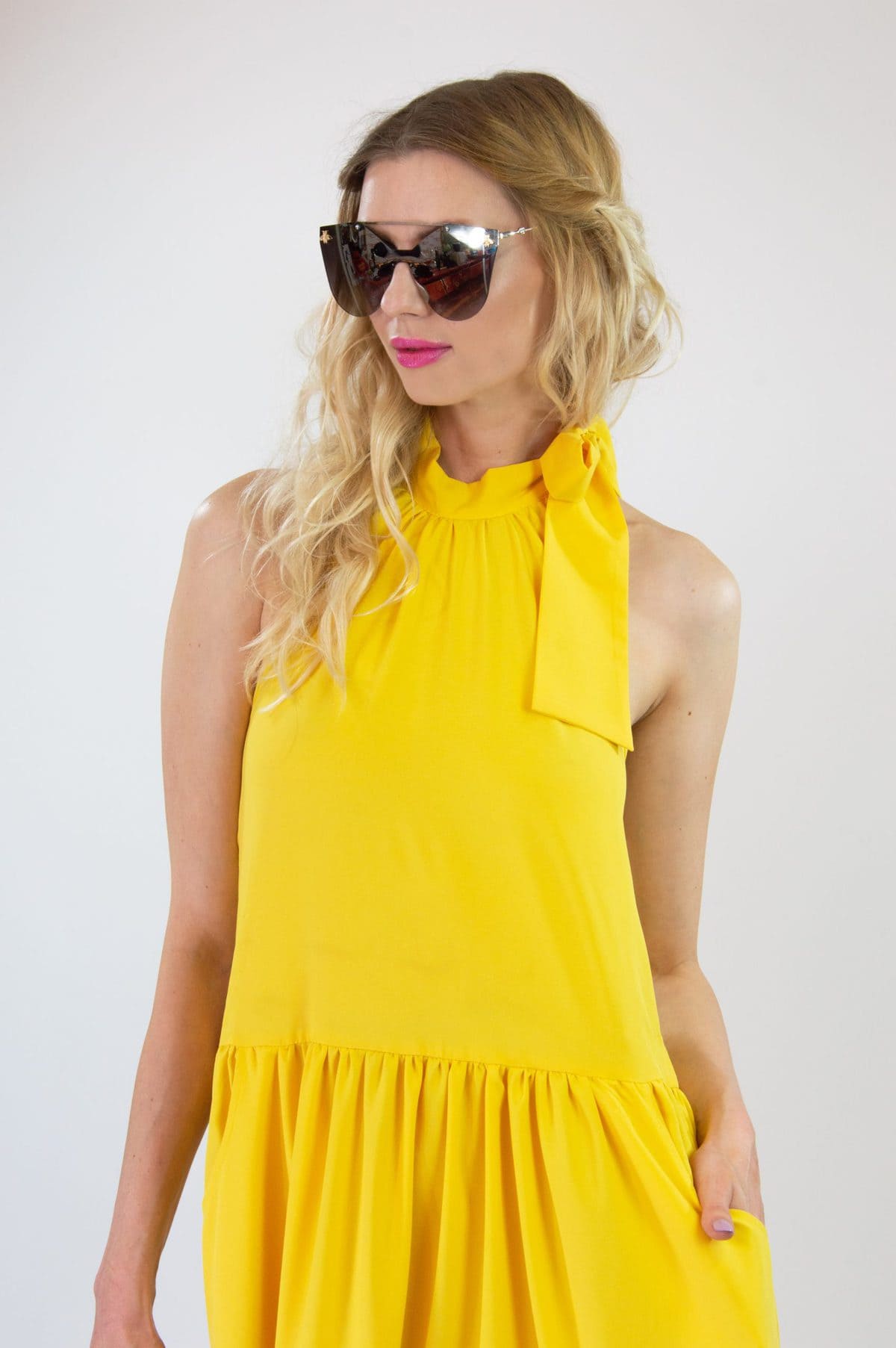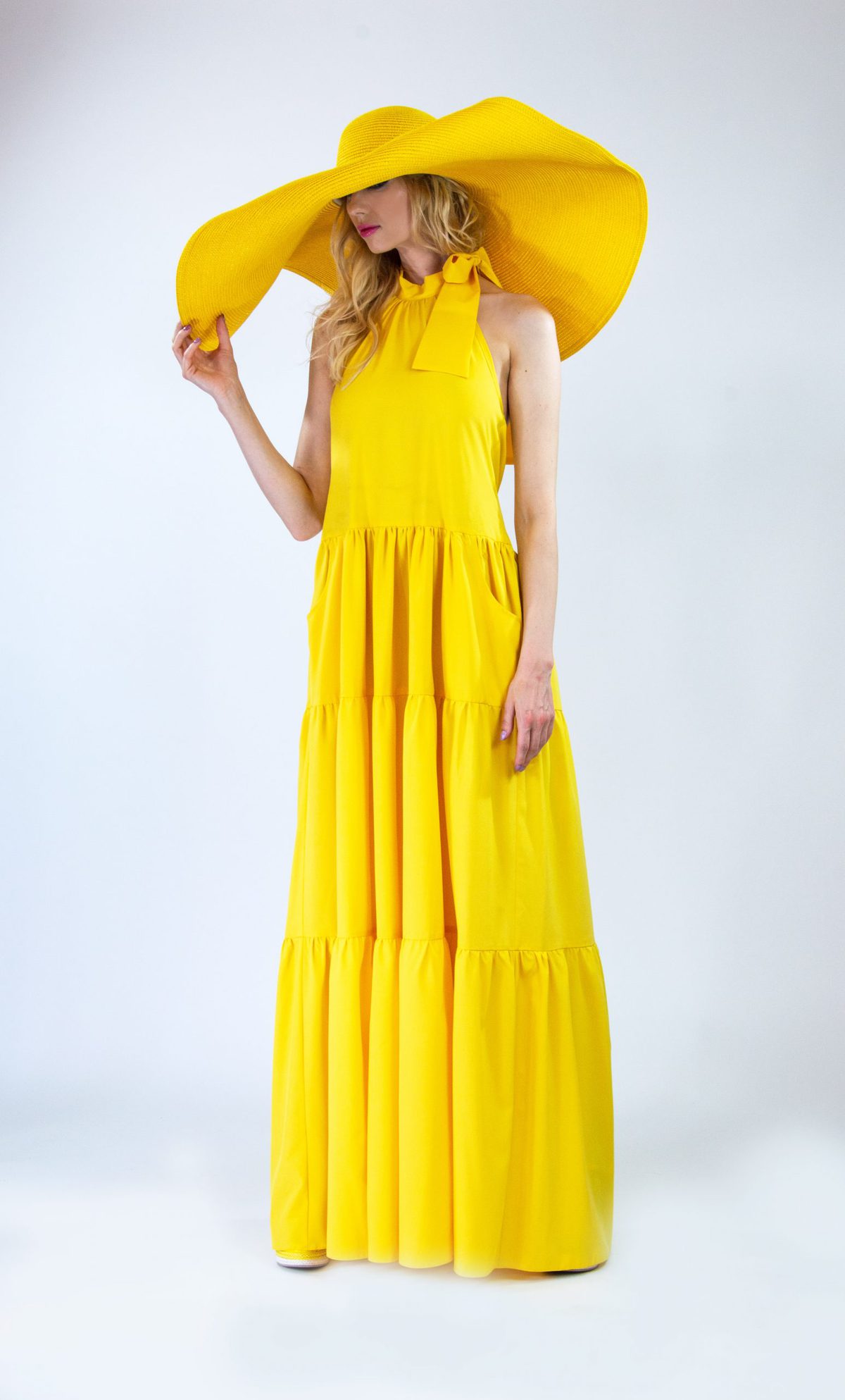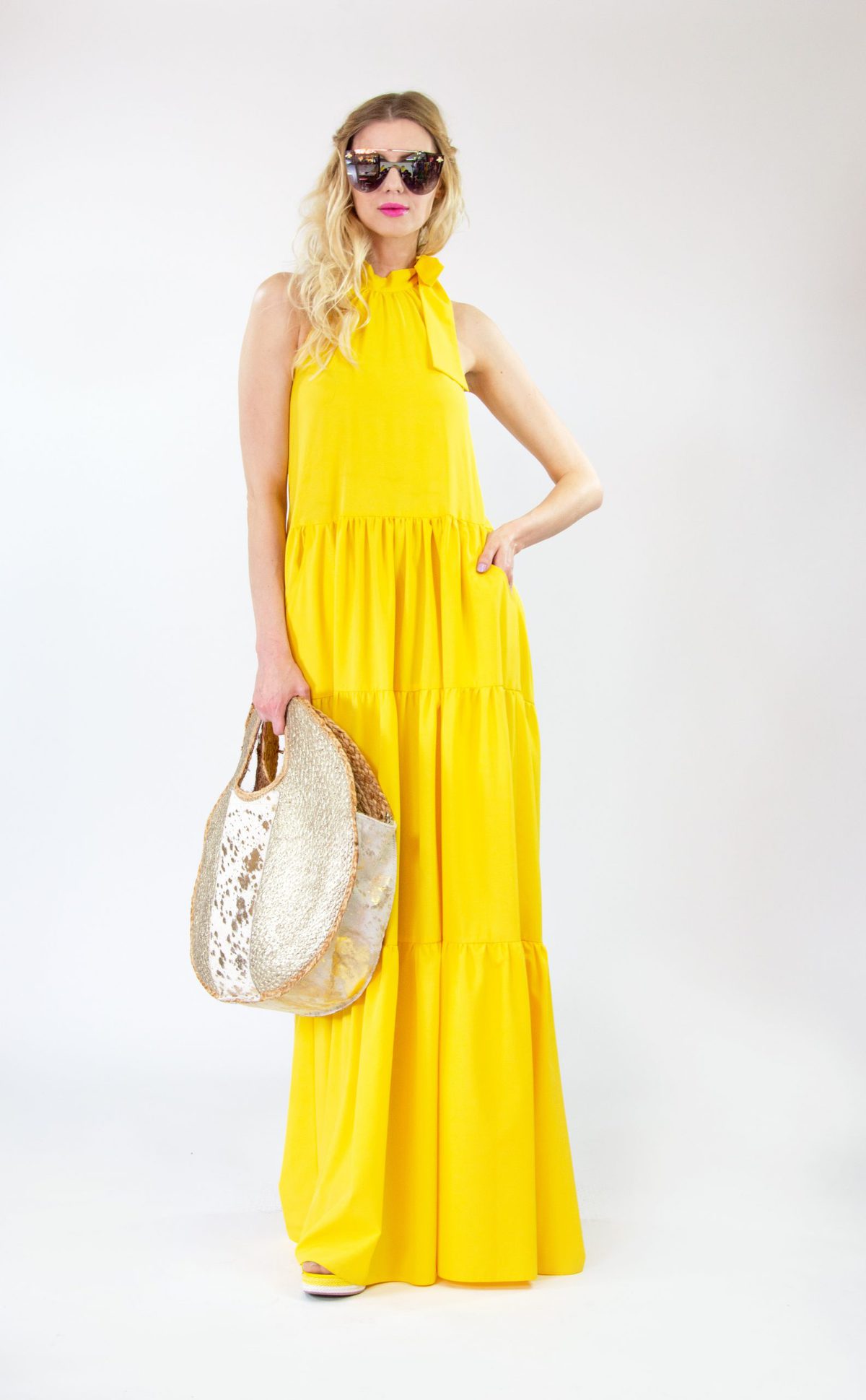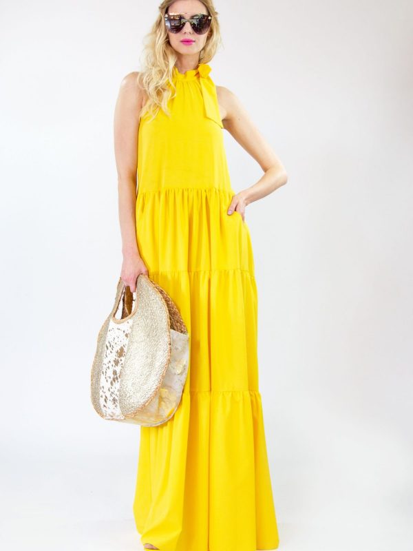 Dlhé volánové letné šaty poskladané z dielov. Šaty sú jednoduchého strihu mierne do áčka. Ideálny letný spoločník vďaka strihu bez rukávov a príjemnému letnému materiálu. Šaty majú funkčné vrecká a sú ušité vo výraznej slniečkovo-žltej farbe.