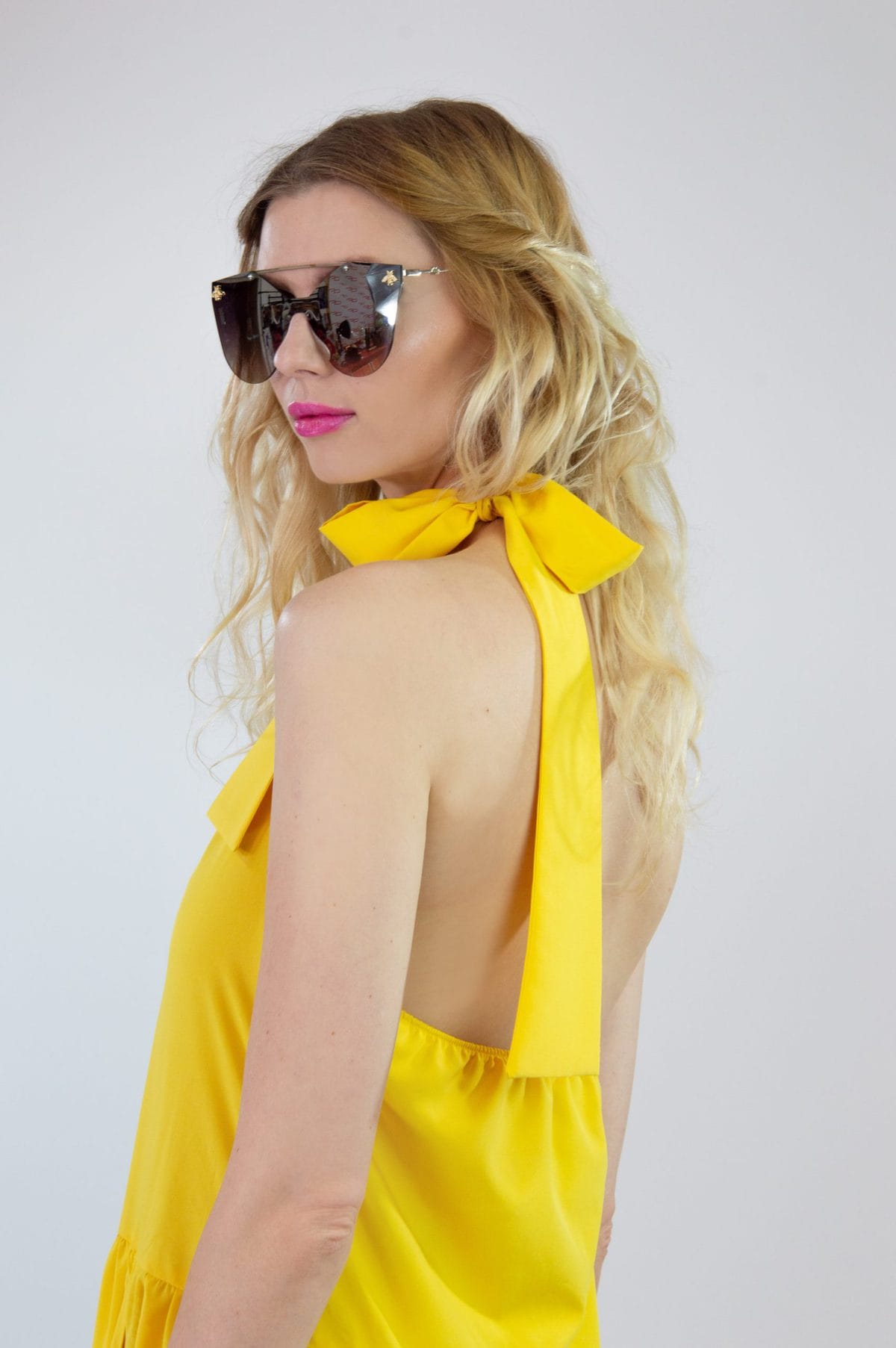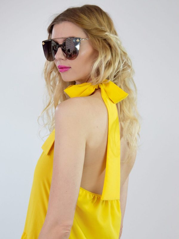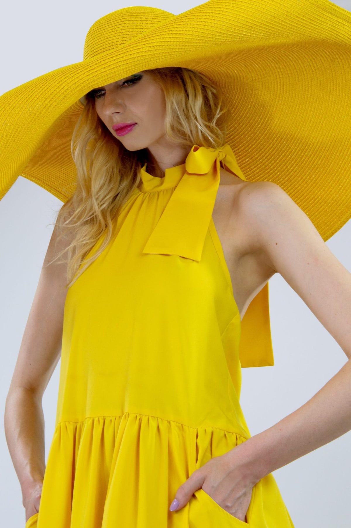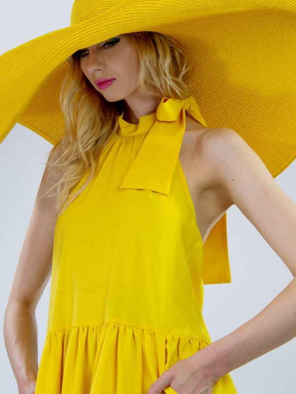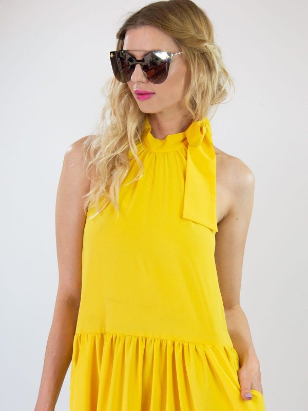 Dlhé volánové letné šaty poskladané z dielov. Šaty sú jednoduchého strihu mierne do áčka. Ideálny letný spoločník vďaka strihu bez rukávov a príjemnému letnému materiálu. Šaty majú funkčné vrecká a sú ušité vo výraznej slniečkovo-žltej farbe.