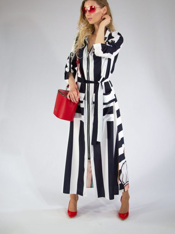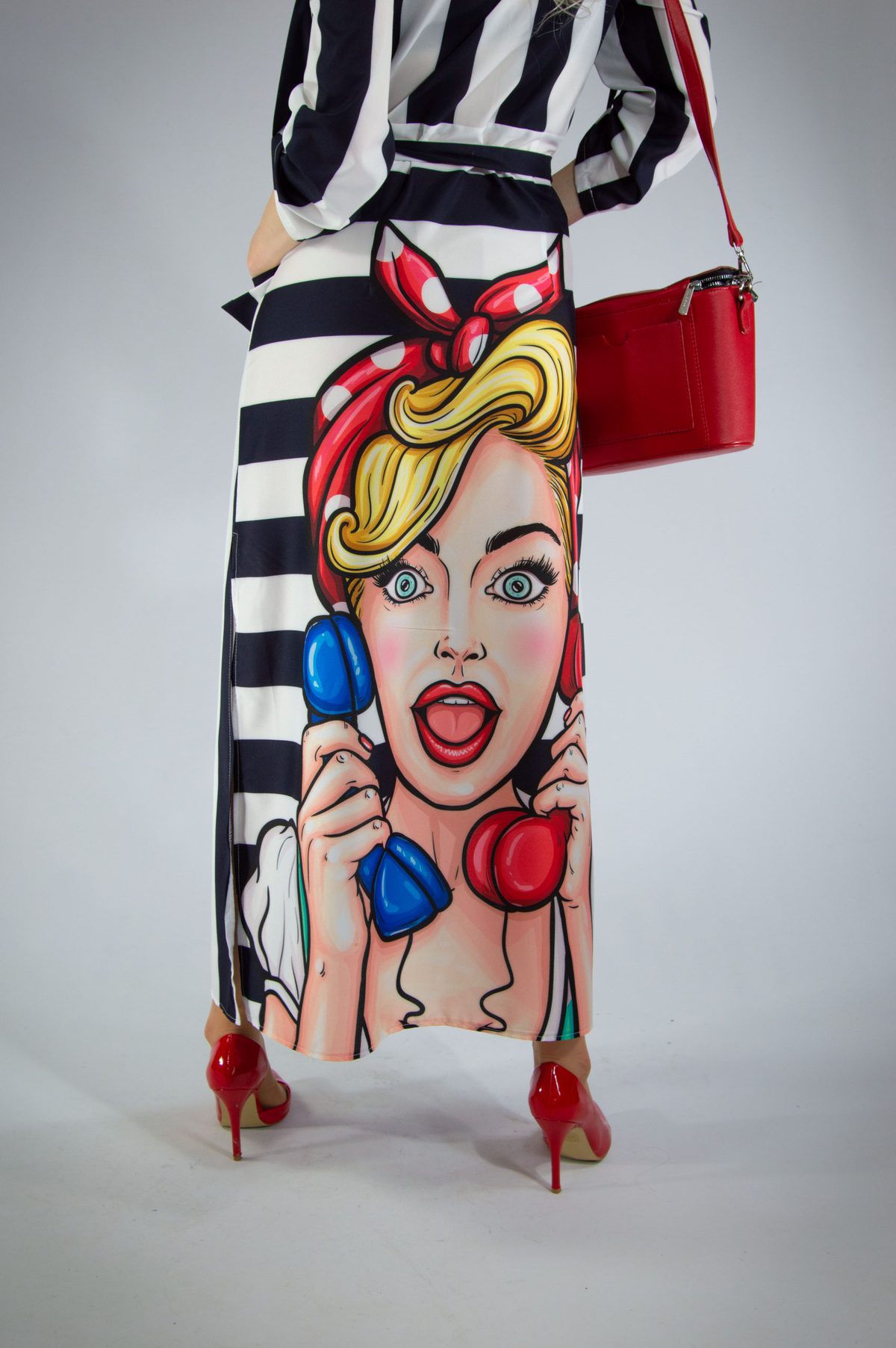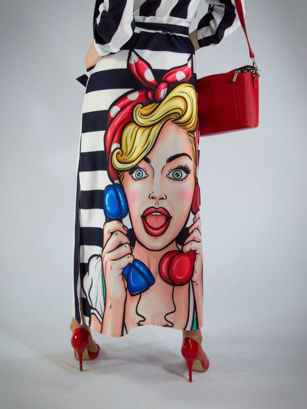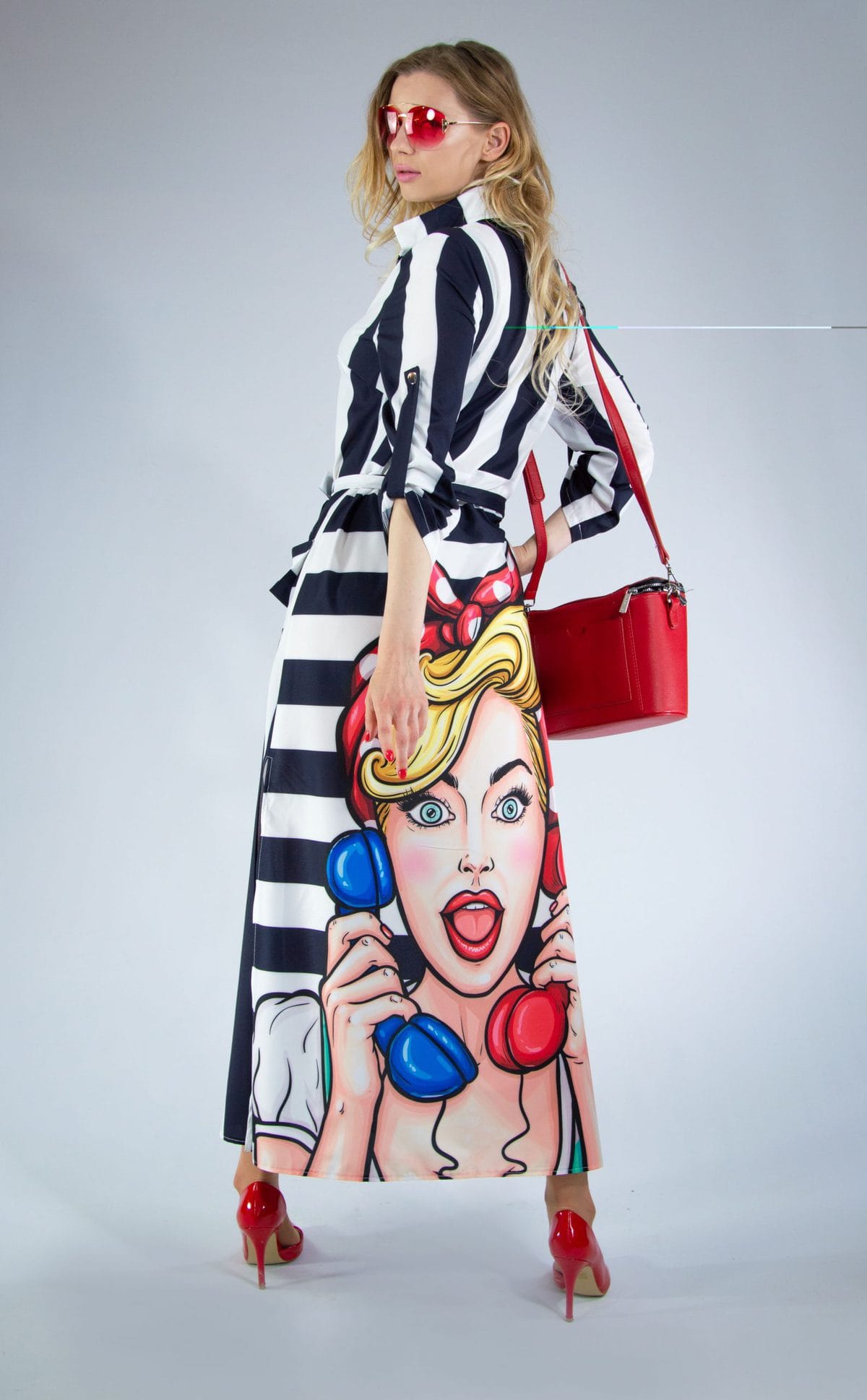 Šaty kombinujúc veselý štýl pop artu a kreslených komiksov 80 rokov so stálicou letnej módy s pruhmi. Šaty sú ušité z jemného letného materiálu s výrazným obrazcom na zadnej časti. Šaty majú praktické zipsové zapínanie.