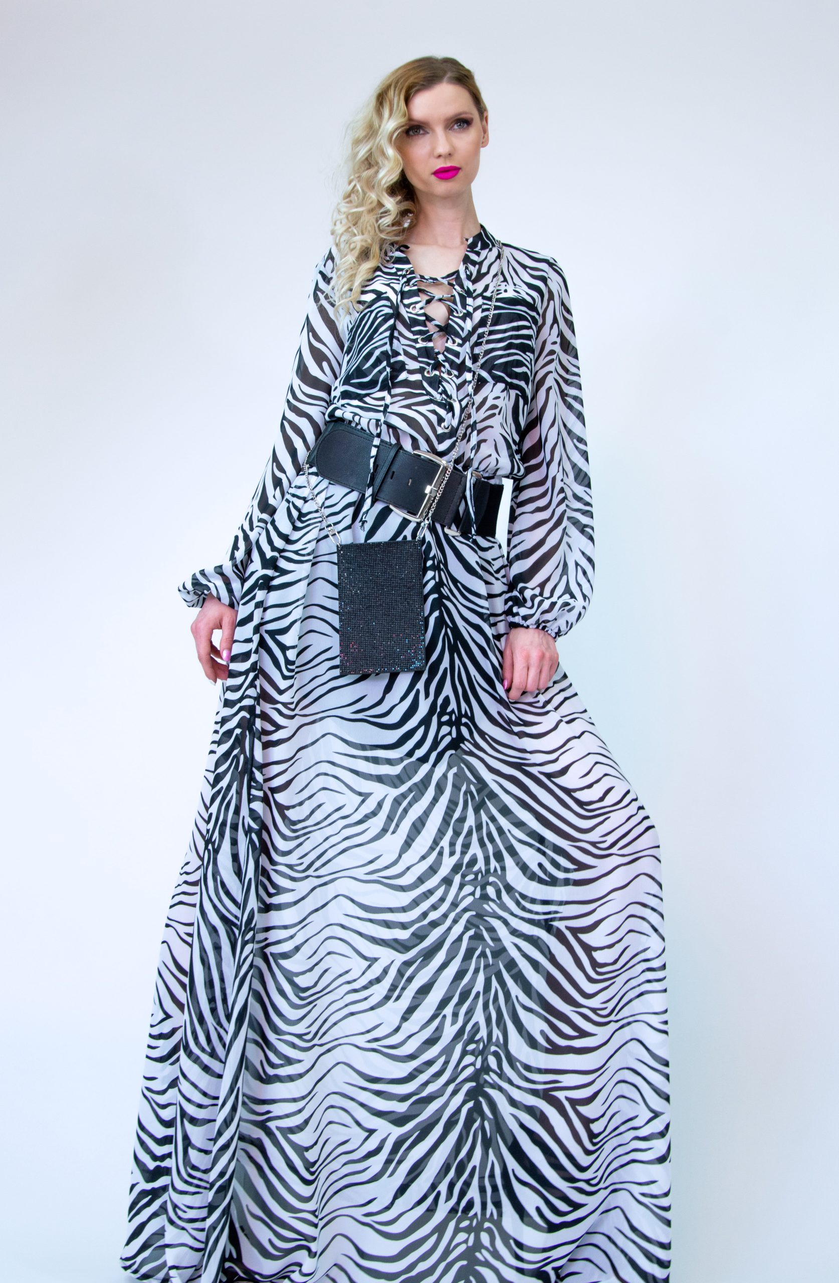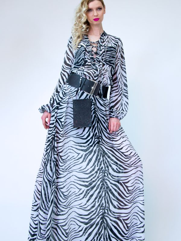 Viac-vrstové šaty z jemného šifónu v populárnom vzore zebry. Doslova sa ponúkajú na stiahnutie objemným opaskom. Strih mierne do áčka s výstrihom na šnurovanie prestrihnutý tesne nad pásom. Ideálne na teple jarné dni a letné večerné party. Zvieracie vzory sú aj túto sezónu trend tak sa do nich zamaskujte aj vy.