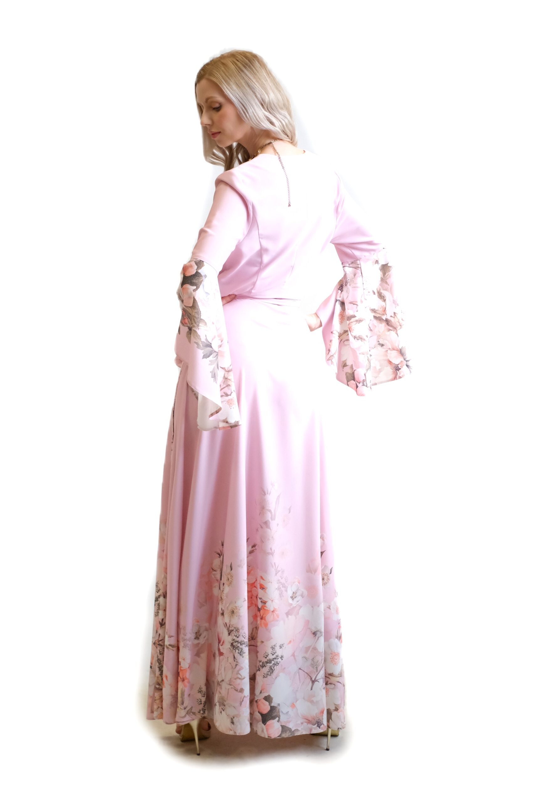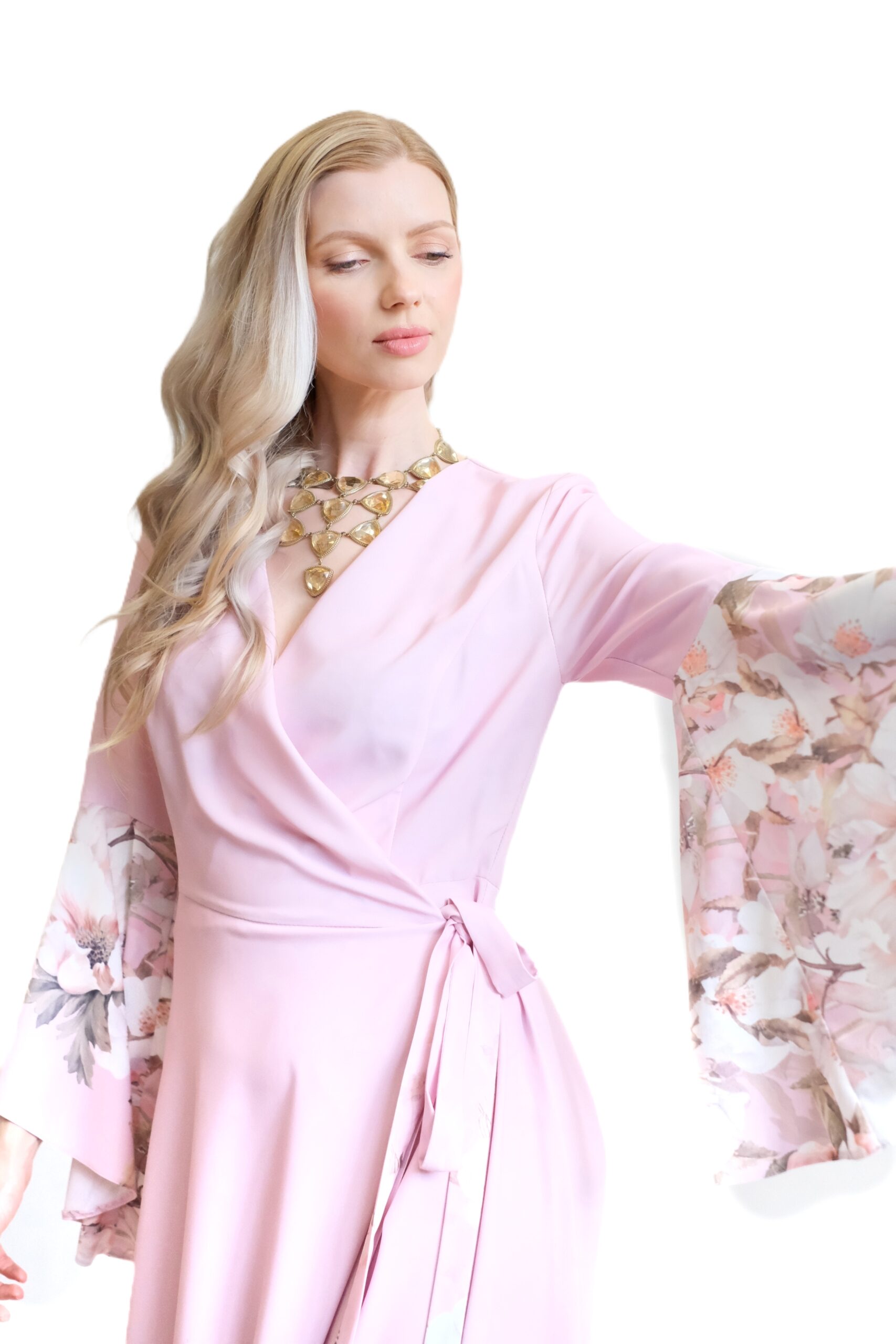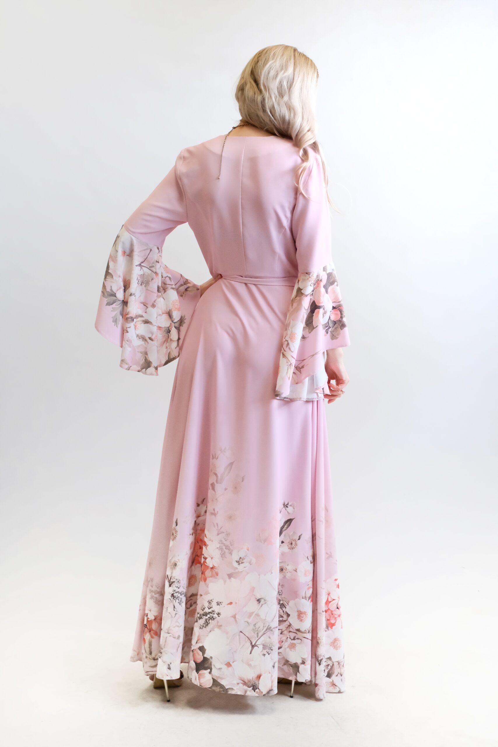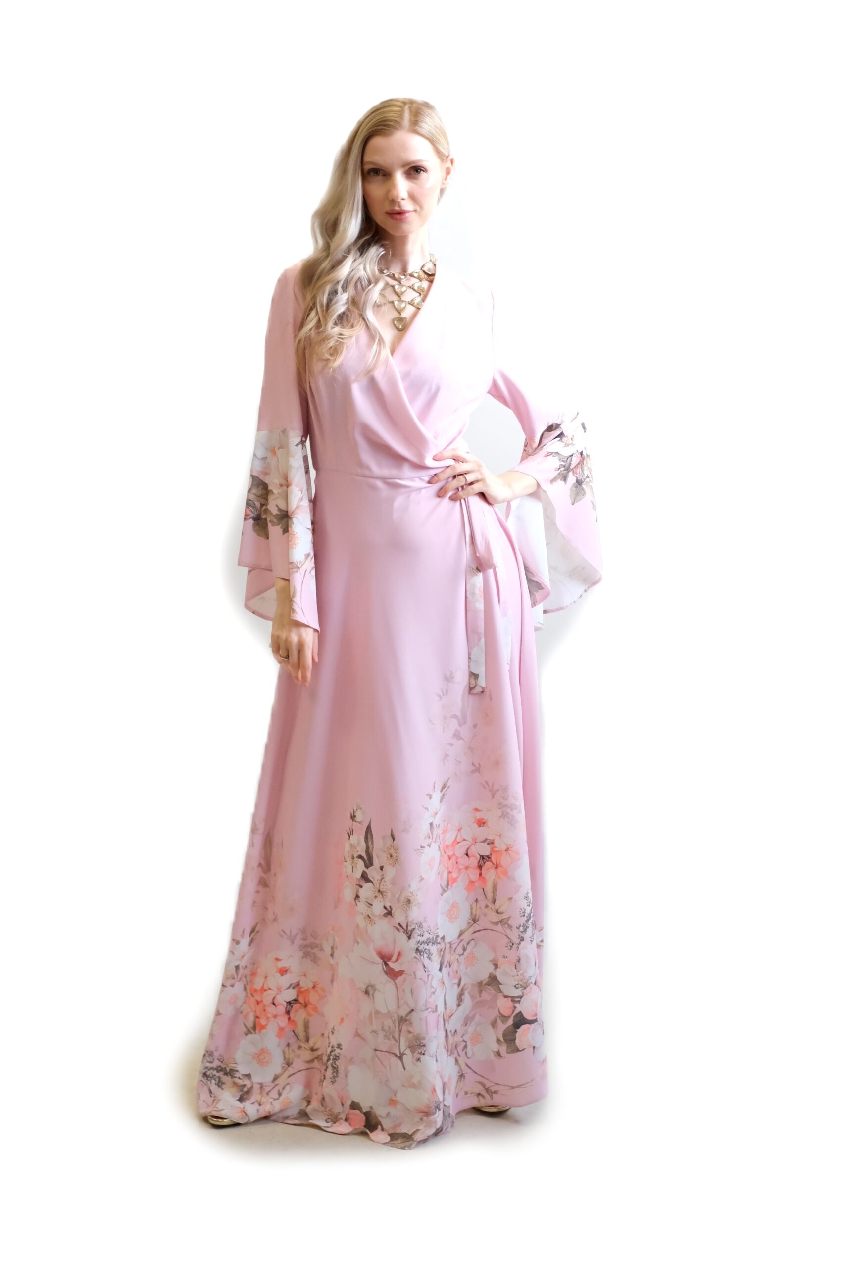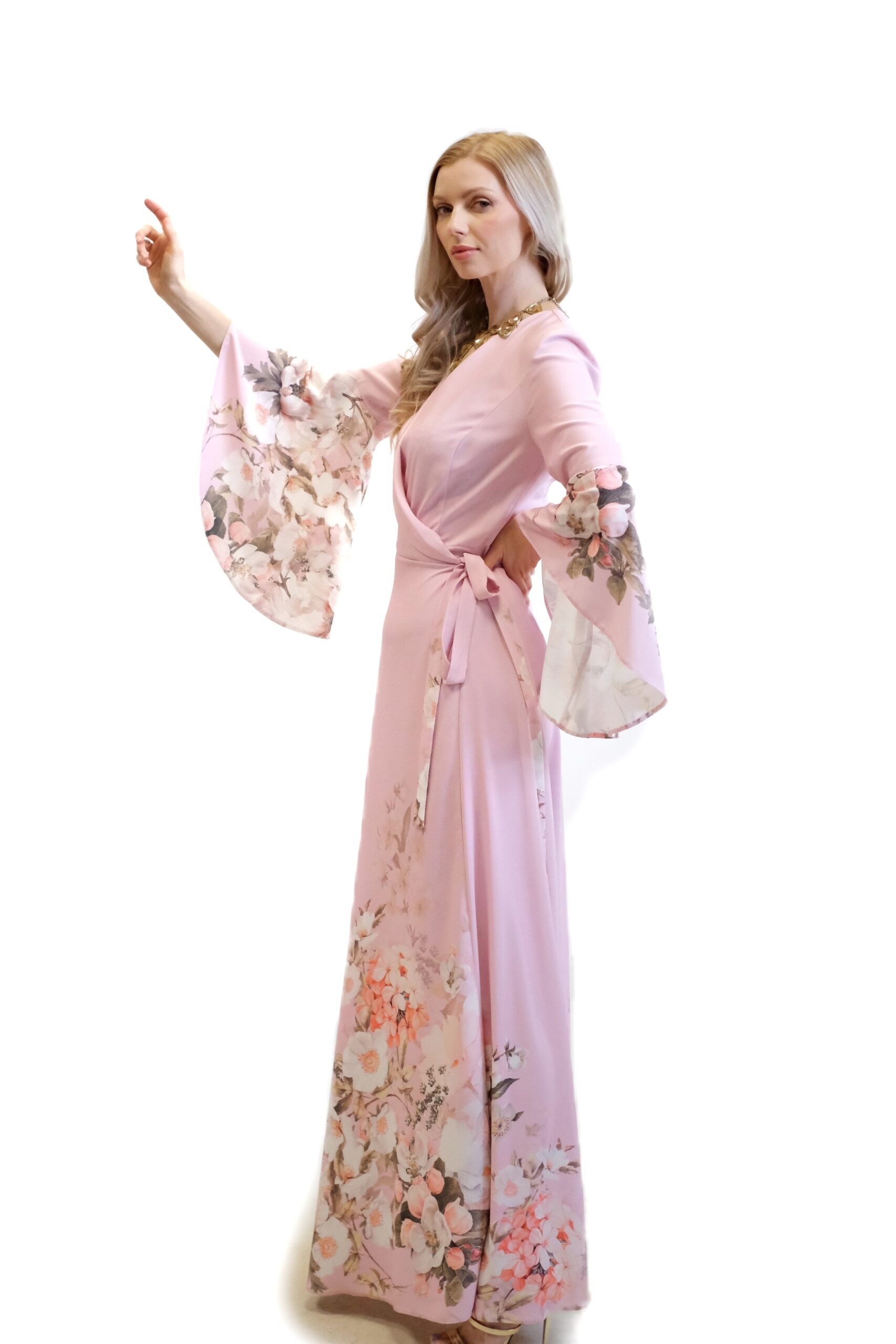 Tieto elegantné zavinovacie maxi šaty v jemnom odtieniružovej (light rose) sú dokonalým spojením luxusnej domácej módy a noblesného spoločenského oblečenia.