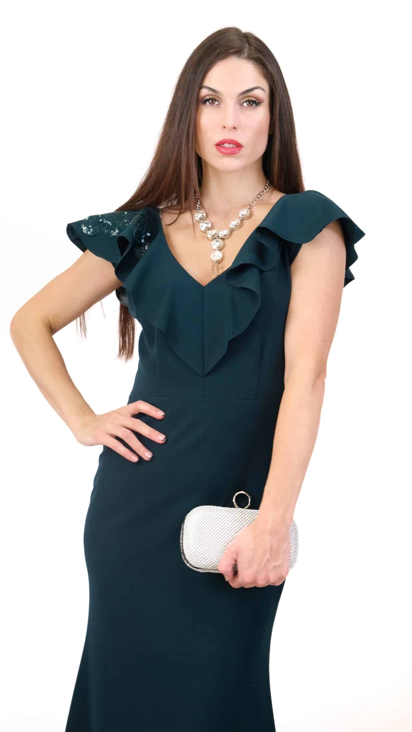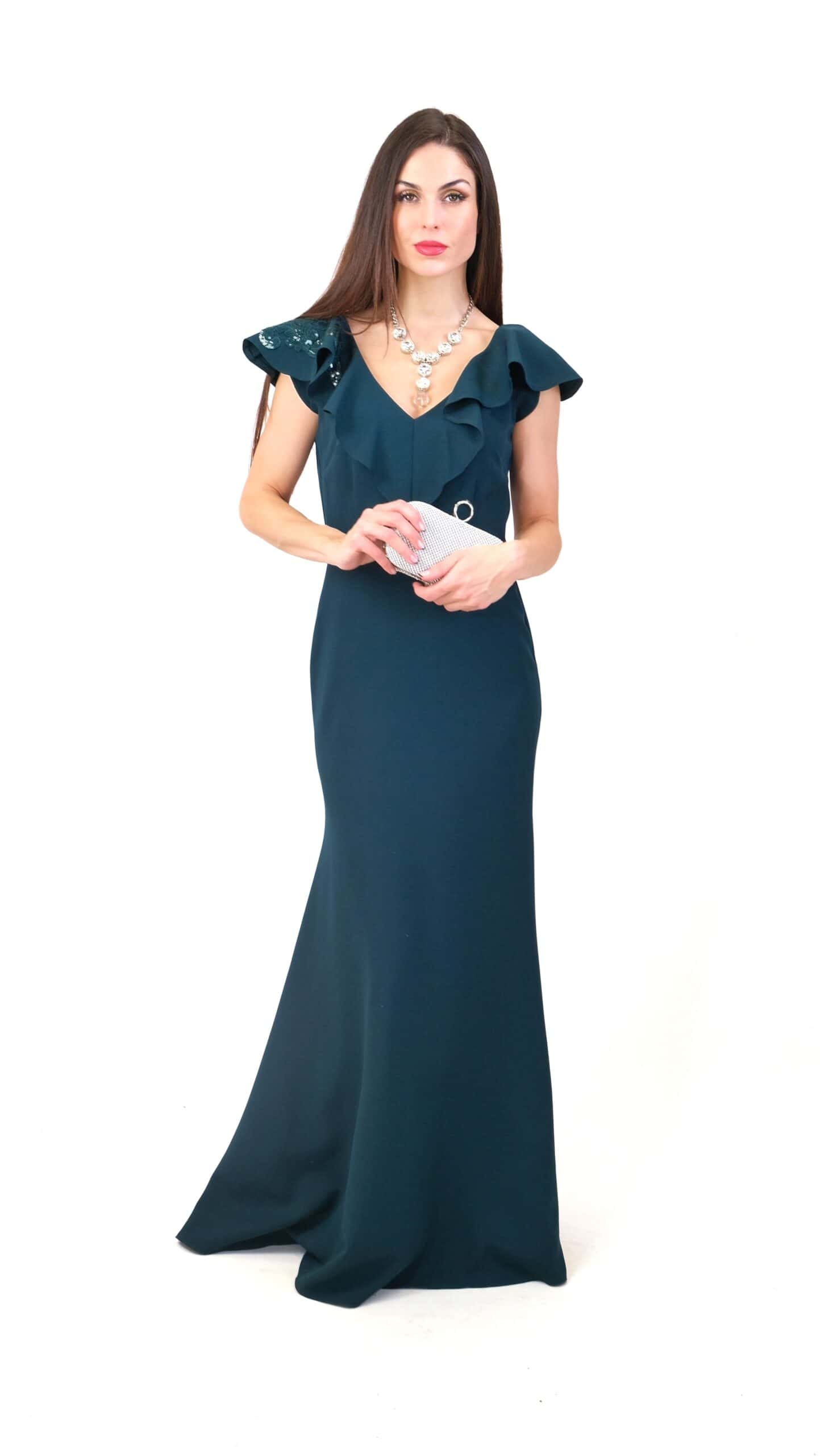 Šaty sú navrhnuté v jednoduchom strihu, ktorý Vás nechá naplno vyniknúť. Šaty sú ušité z poddajnej smaragdovej látky, ktorá sa prispôsobí Vášmu telu. Zaujímavým detailom je bohato zdobený výstrih romantickým volánom, čo šatám dodáva na elegancii. Na pleciach je našitá krajka v rovnakej farbe. Šaty, v ktorých zažiarite na každom plese. Šaty môžete rovnako dobre skombinovať so striebornými ako aj so zlatými doplnkami.