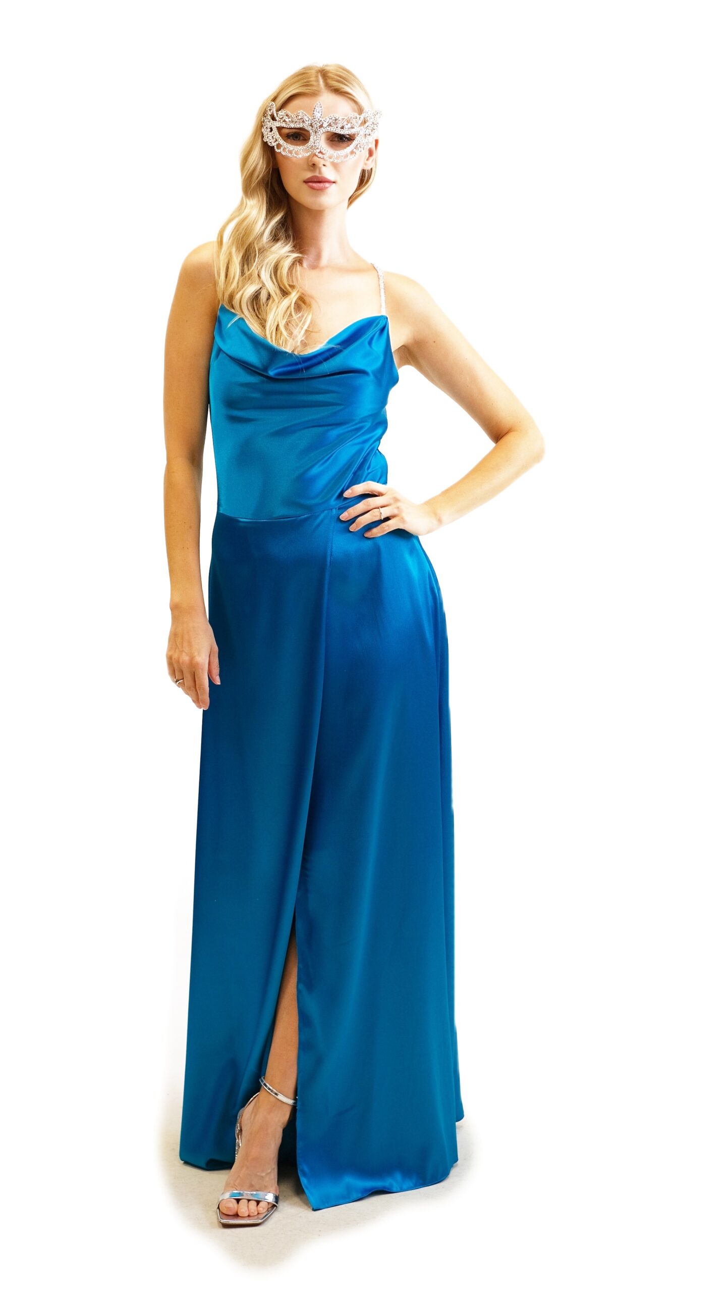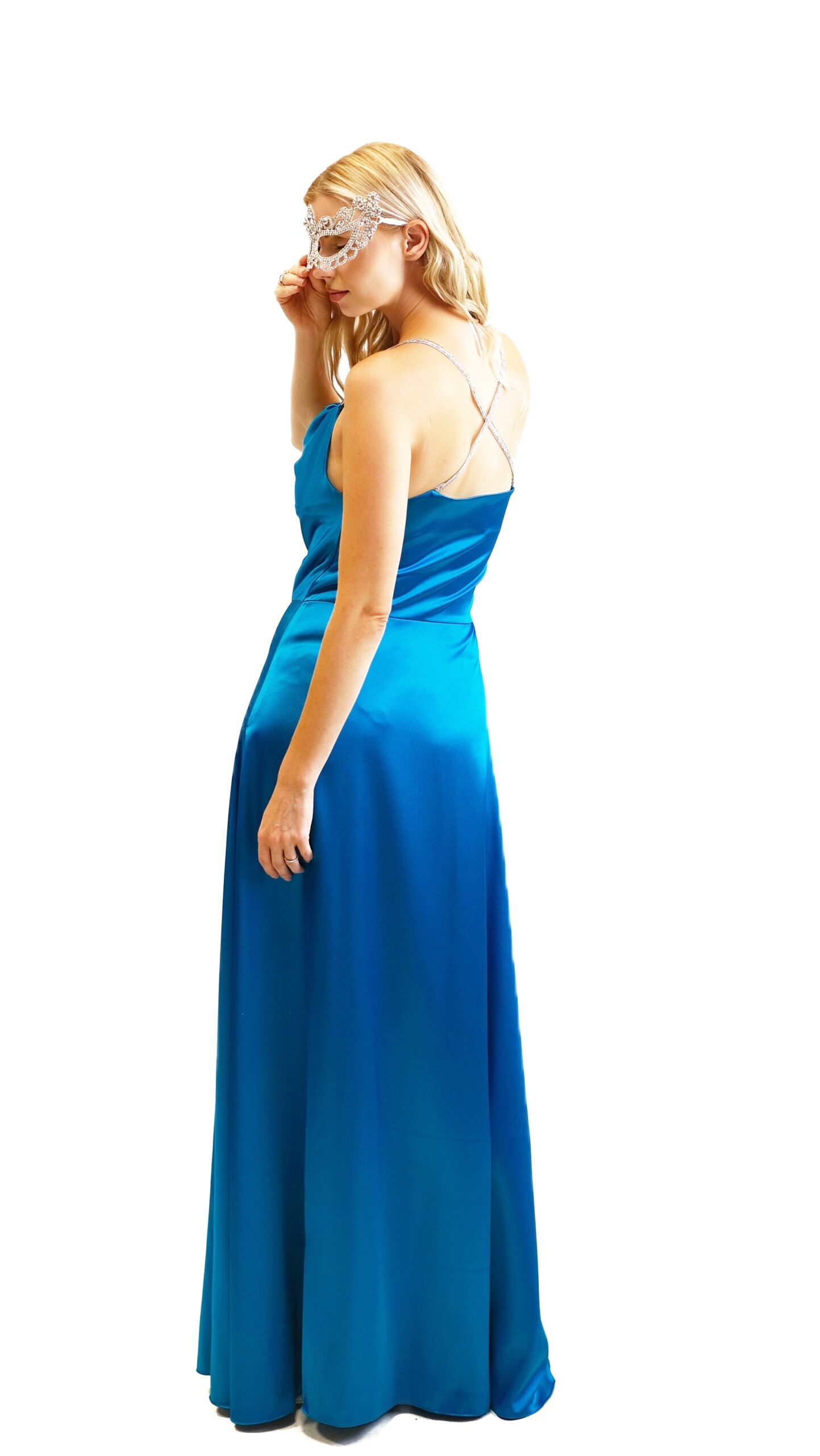 Šaty sú navrhnuté v jednoduchom, úzkom strihu, ktorý výborne kopíruje postavu. Šaty sú strihnuté v pase a majú rafinovaný rozparok, ktorý im dodáva šmrnc. Zaujímavým detailom sú ozdobné ramienka, ktorá Vám poslúžia ako šperk. Šaty sú ideálne na nadchádzajúce stužkovú a plesovú sezónu. Šaty sú navrhnuté v dych vyrážajúcej modrej farbe.