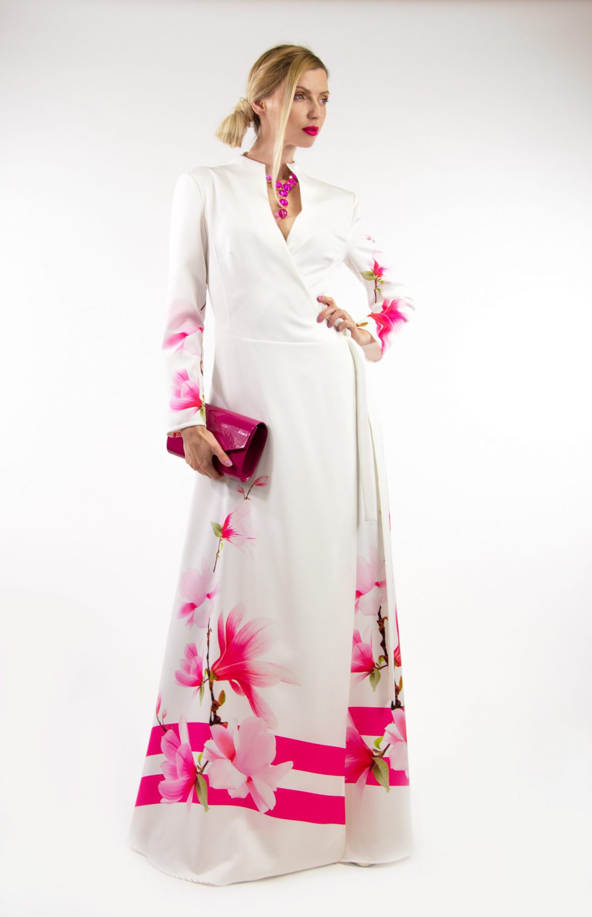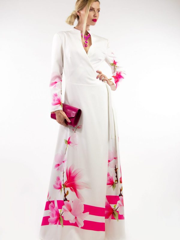 Šaty ako stvorené na letnú oslavu. Na krémovom podklade sú v úžasných detailoch vyobrazené kvety, ktoré dodávajú šatám šmrnc. Šaty sú dlhé až po zem a sú v obľúbenom zavinovaciom strihu, ktorý sadne skvele na každú postavu.