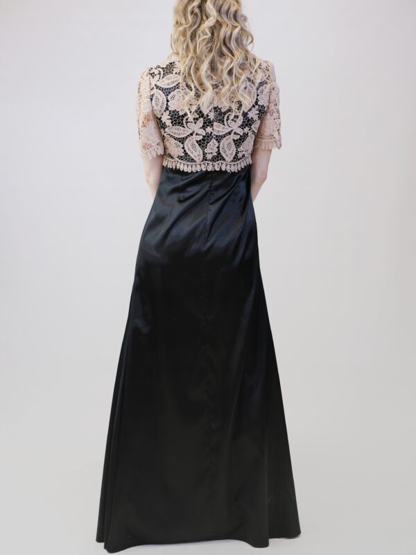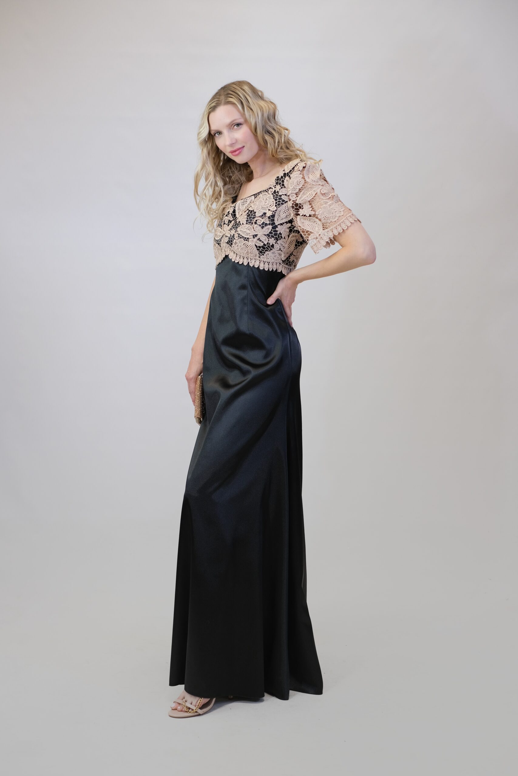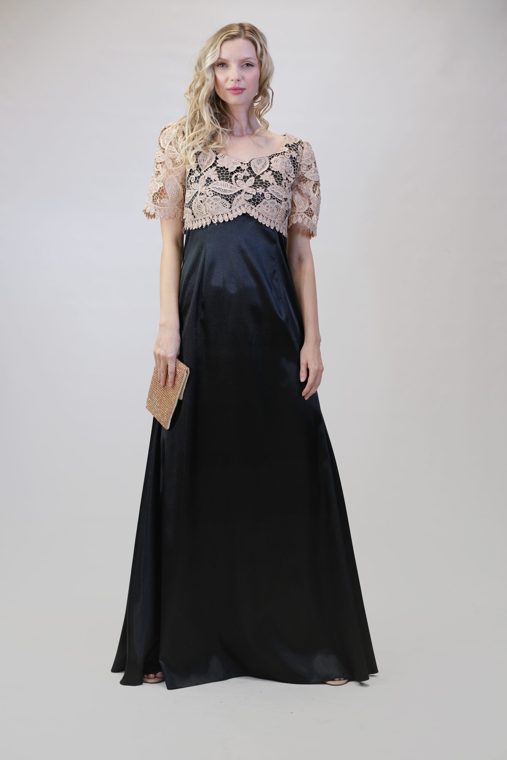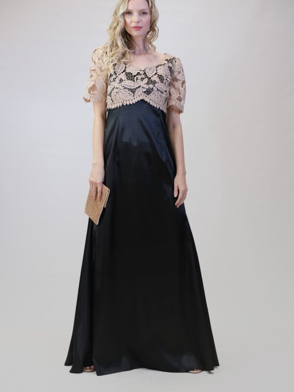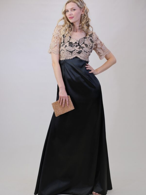 Šaty sú navrhnuté v jednoduchom priliehavom strihu z lesklého saténu, ktorý im dodáva spoločenský nádych. Šaty sú dlhé až po zem. Zaujímavým detailom na šatách je béžová krajka, ktorá je našitá v hornej polovici šiat a zdôrazňuje ich jednoduchý strih. Šaty výborne hodia na každú spoločenskú udalosť a ich neutrálne farby sa dajú kombinovať s čímkoľvek.