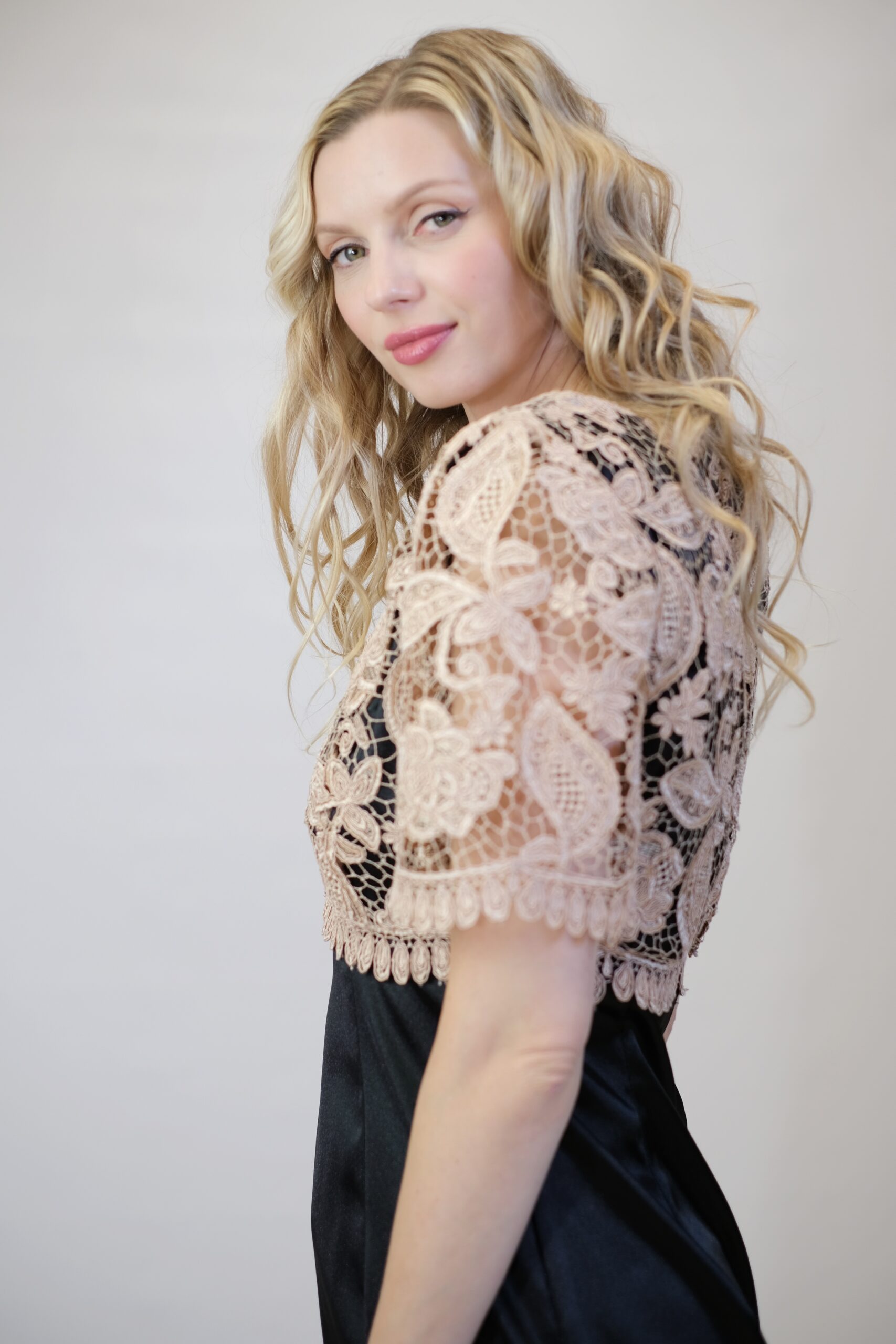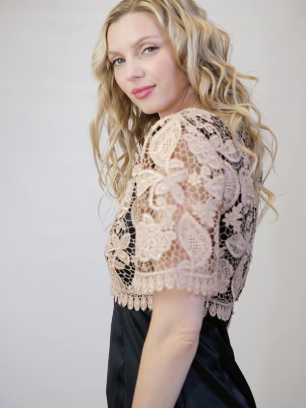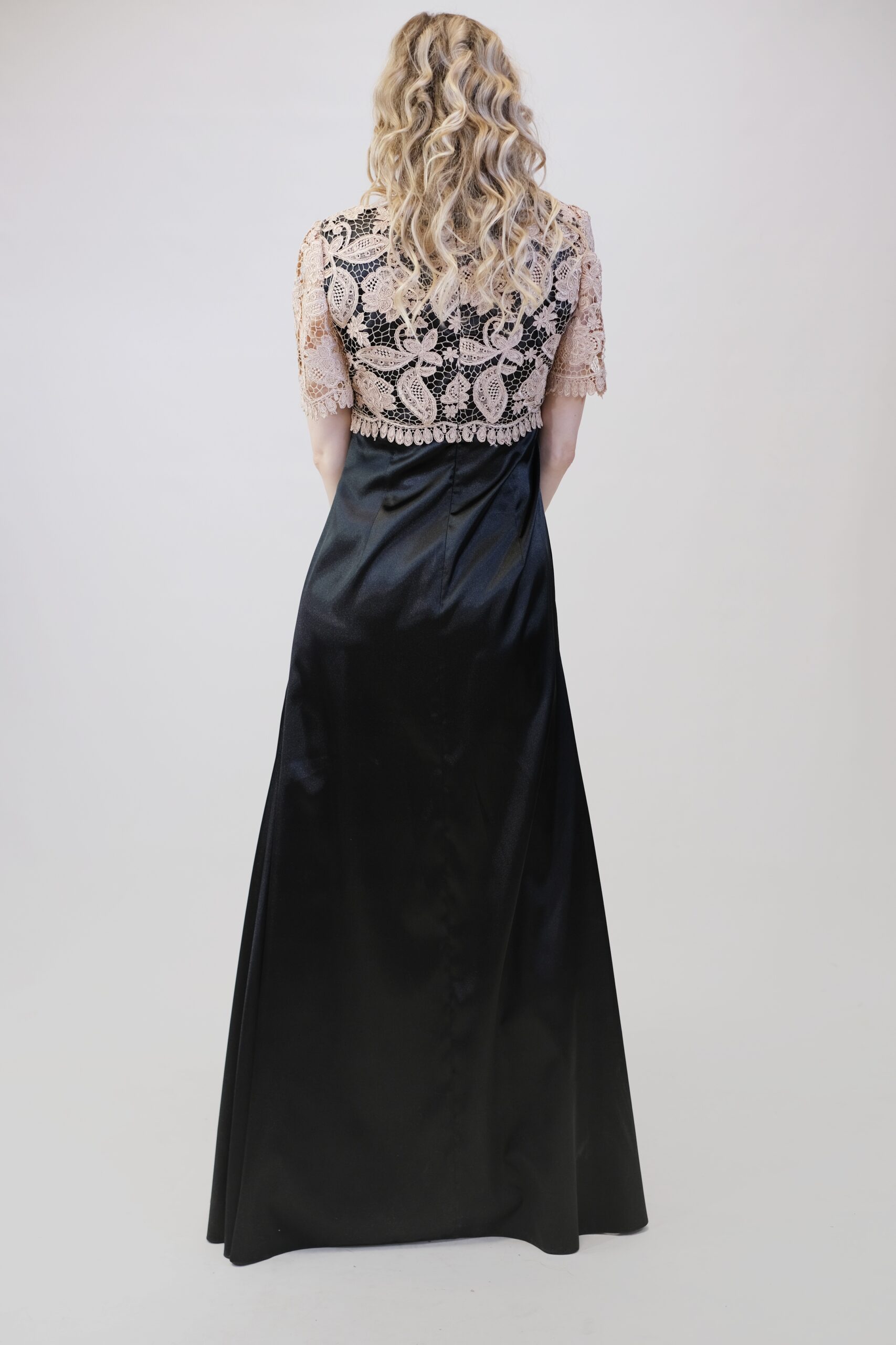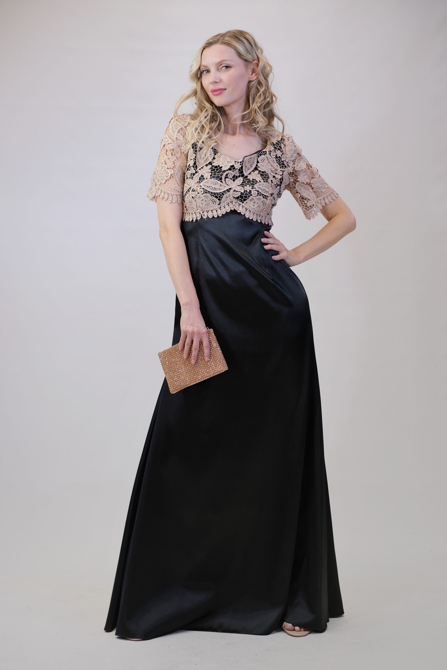 Šaty sú navrhnuté v jednoduchom priliehavom strihu z lesklého saténu, ktorý im dodáva spoločenský nádych. Šaty sú dlhé až po zem. Zaujímavým detailom na šatách je béžová krajka, ktorá je našitá v hornej polovici šiat a zdôrazňuje ich jednoduchý strih. Šaty výborne hodia na každú spoločenskú udalosť a ich neutrálne farby sa dajú kombinovať s čímkoľvek.