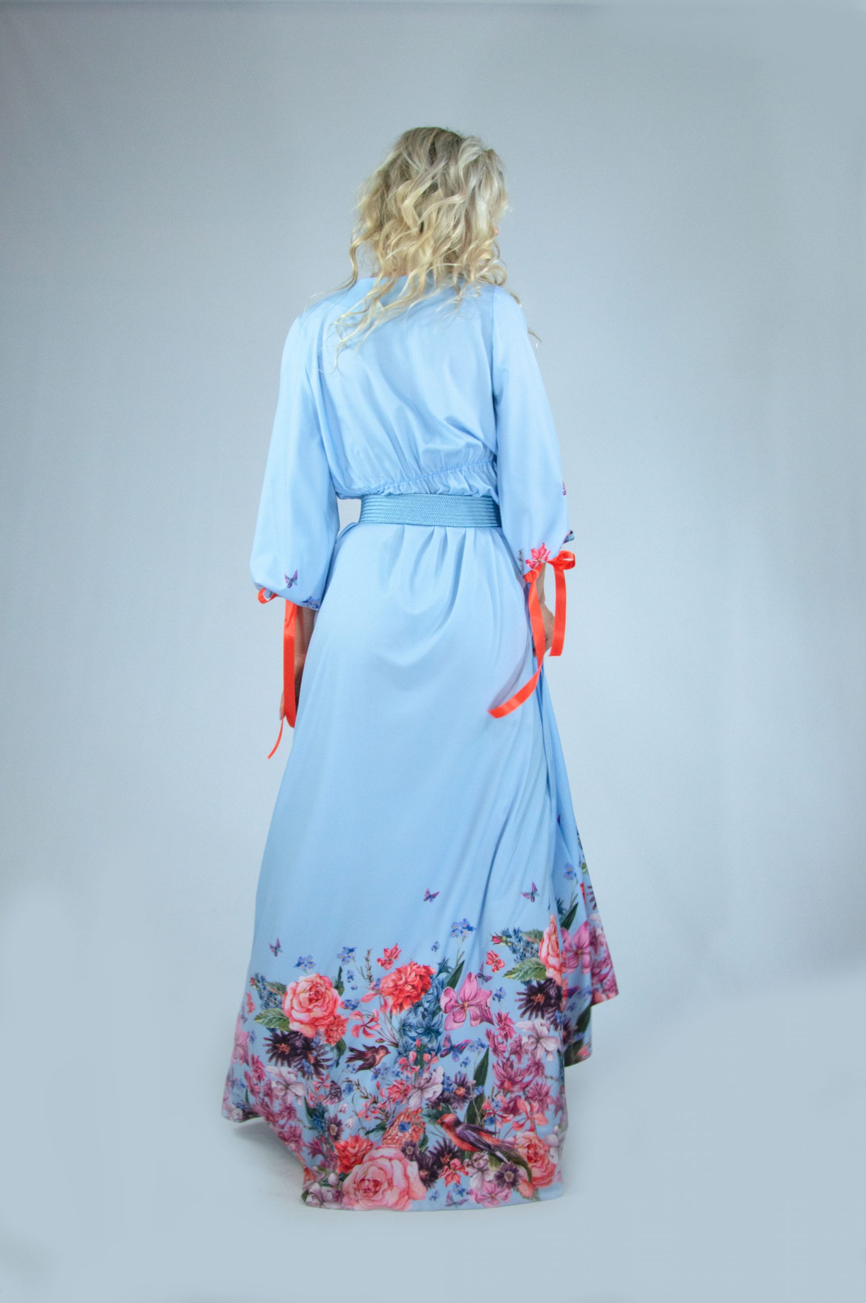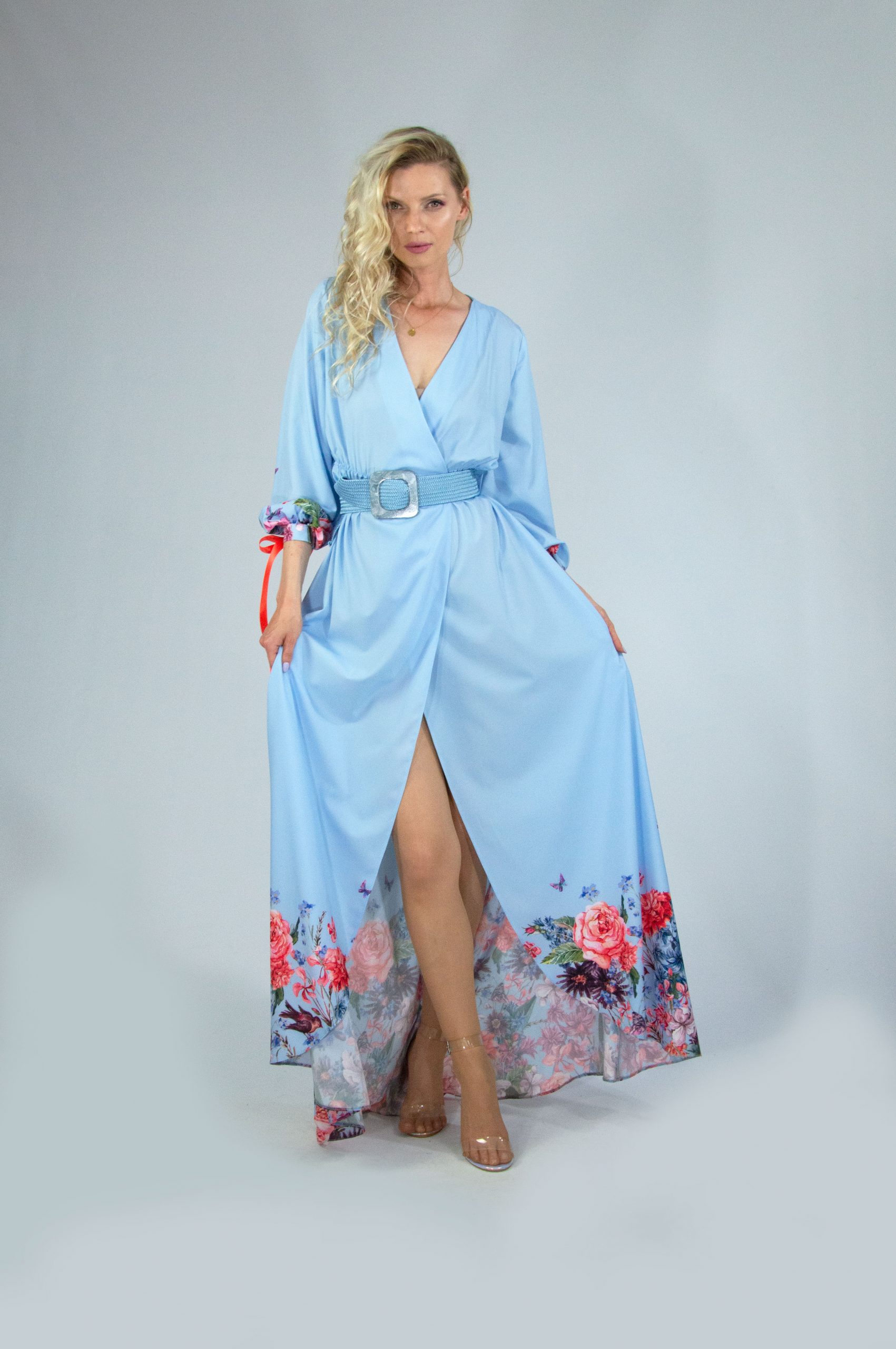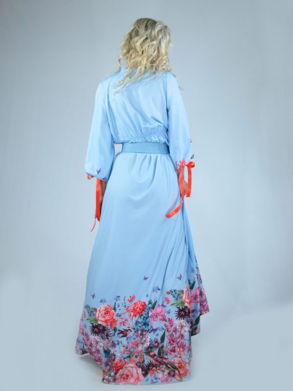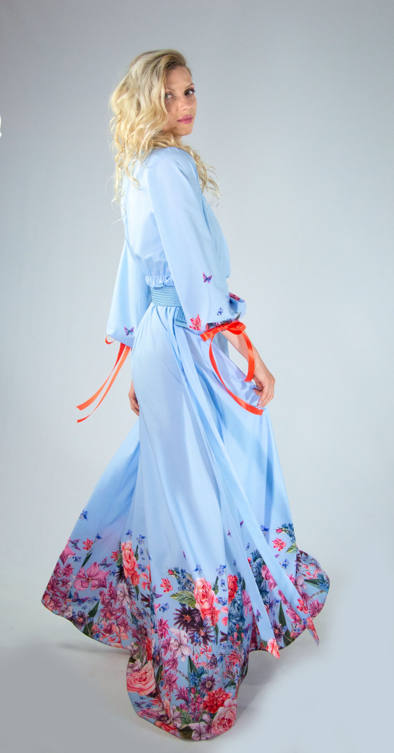 Dlhé letné šaty ako stvorené na letnú oslavu alebo svadbu. Zvinovací strih šiat je veľmi pohodlný a prispôsobí sa každej postave. V týchto šatách sa snúbi výnimočný strih s výnimočným letným motívom. Vzor na šatách má nebeský modrý podklad a nádych orientálneho motívu. Šaty ľahko skombinujete so všetkými odtieňmi ružovej , červenej aj modrej farby. Zaujímavým detailom je výrazná oranžová stužka na rukávoch , ktorá pastelový odtieň oživuje a dodáva mu šmrnc.