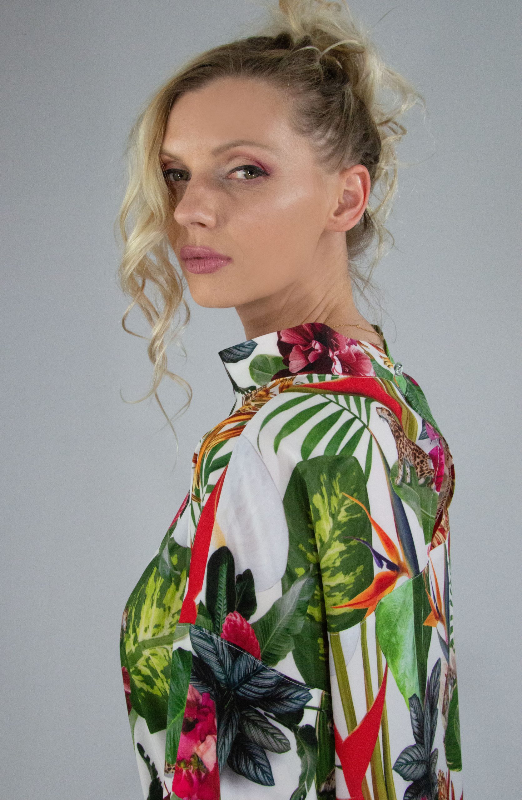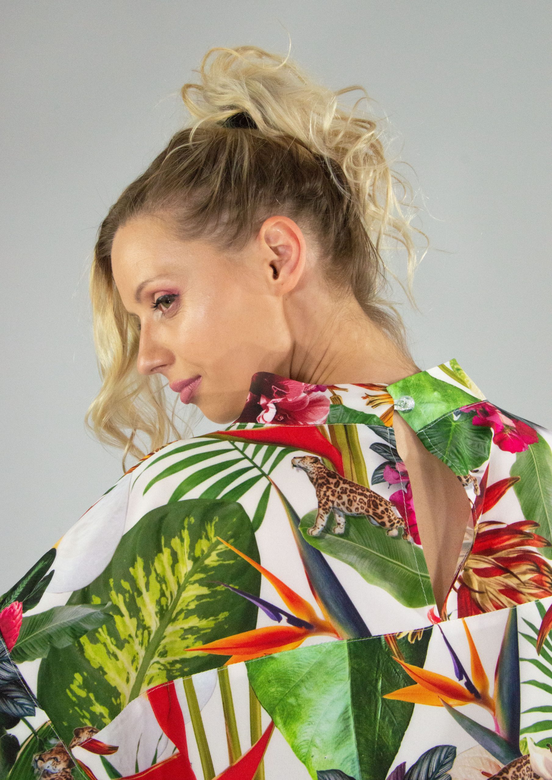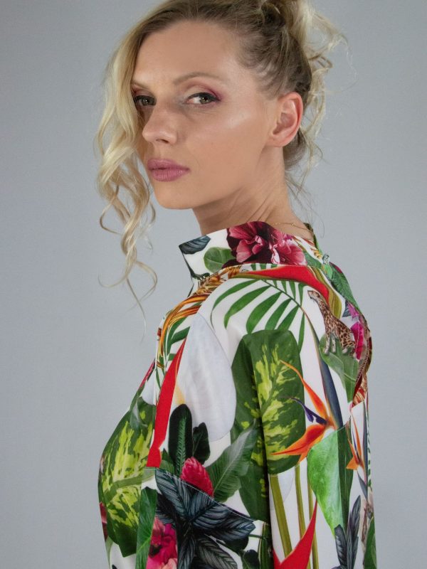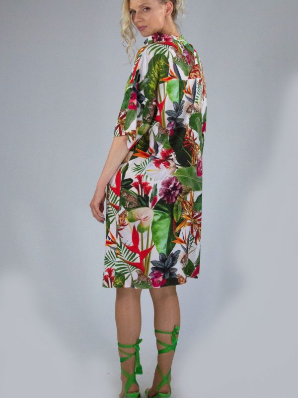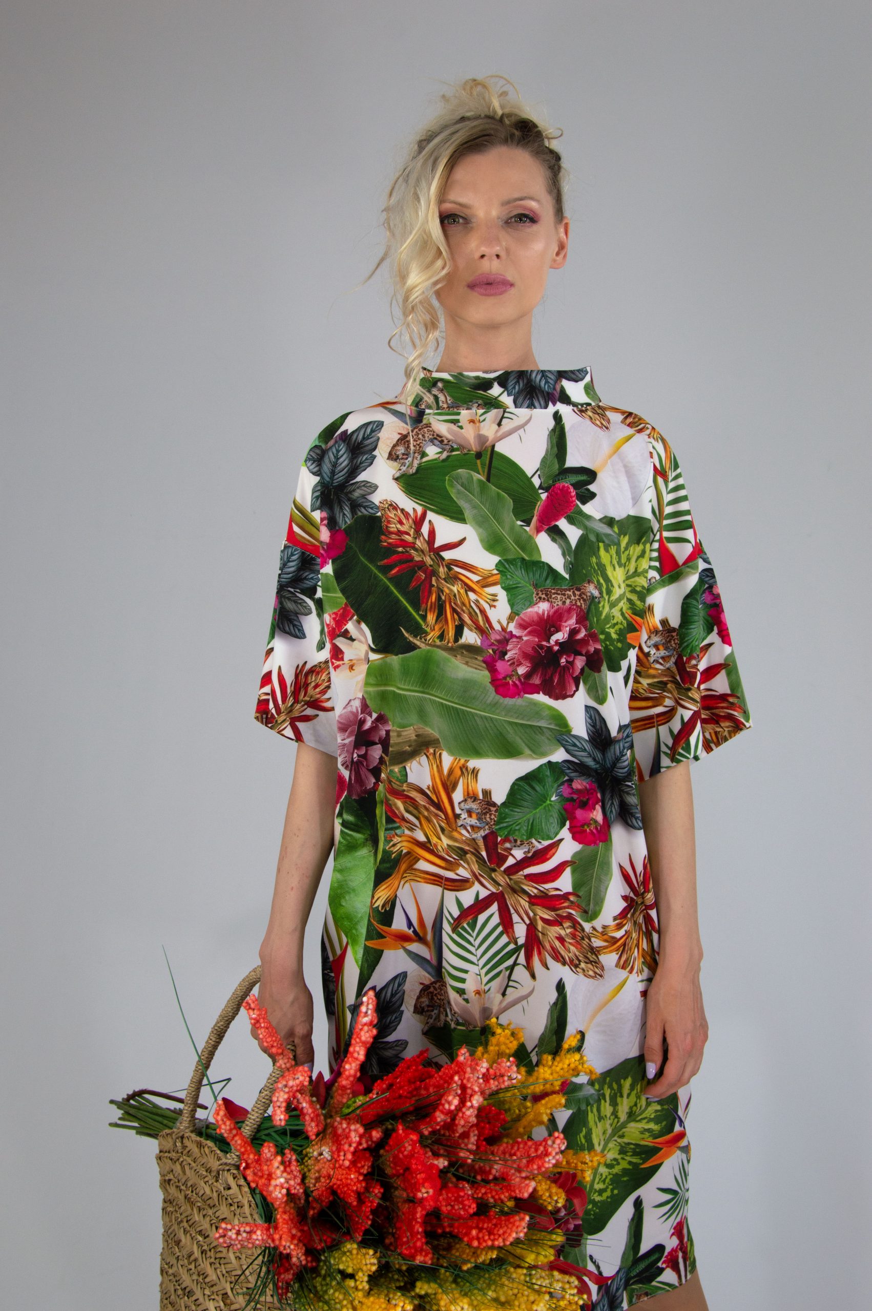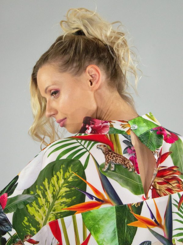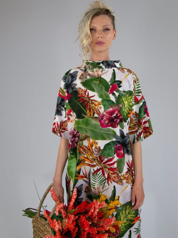Šaty ušité v pohodlnom áčkovom strihu s výrazným vzorom africkej savany ľahko zamaskujú drobné nedostatky. Šaty vďaka jednoduchosti strihu nechávajú naplno vyniknúť nadčasový letný vzor, ktorý žiari farbami. Zaujímavým detailom je golier šiat, ktorý im dodáva šmrnc.