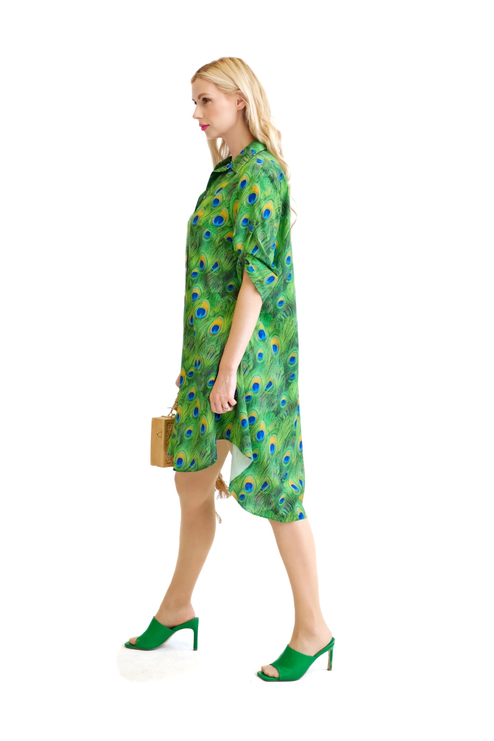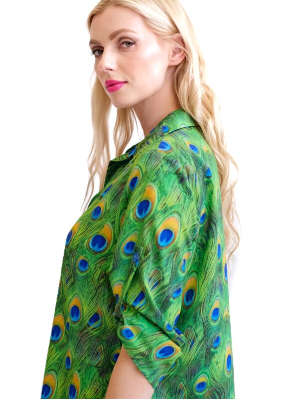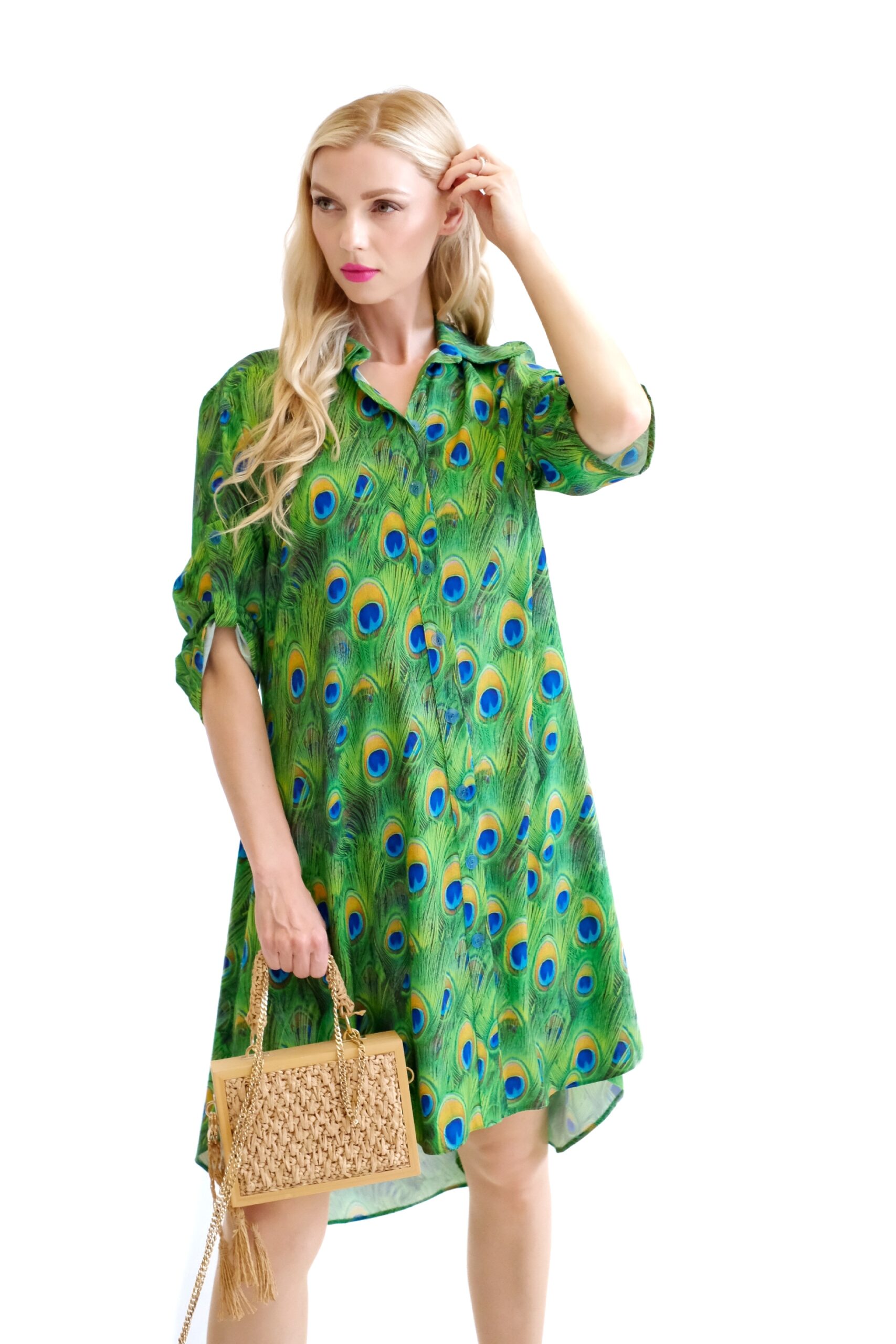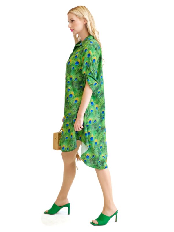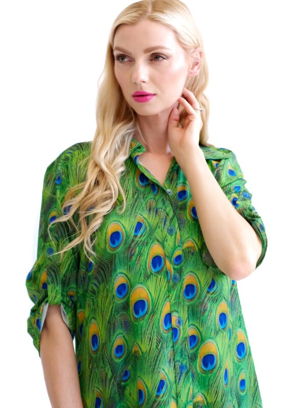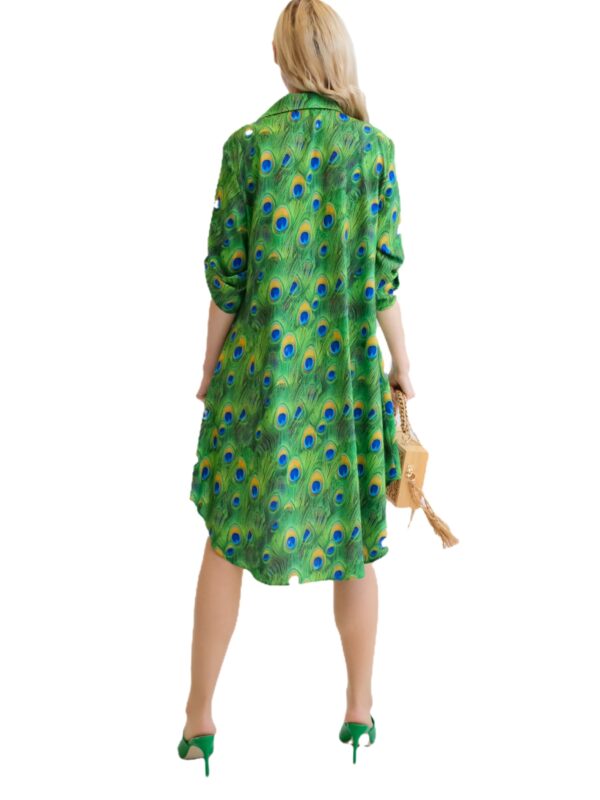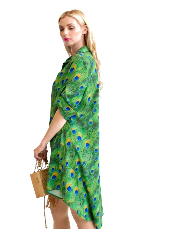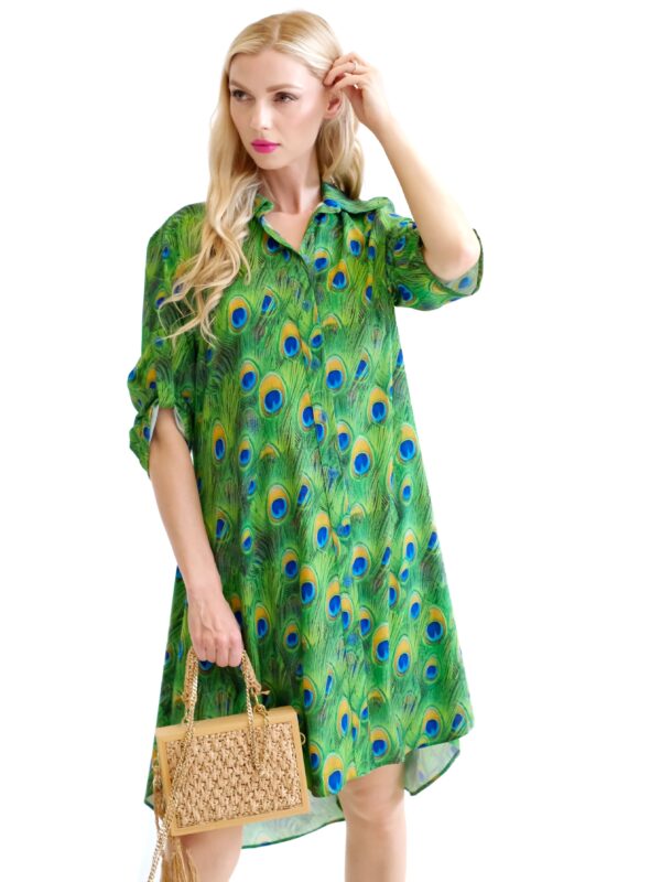 Šaty sú navrhnuté v obľúbenom košeľovom strihu, ktorý skvele sadne na každý typ postavy. Rukávy na šatách sa dajú vyhrnúť. Šaty sú asymetrický strihané, s tým že zadná časť je dlhšia ako predná. Šaty sú ušité z ľahkého, nekrčivého a vzdušného materiálu, v ktorom sa budete cítiť výborne počas horúcich letných dní. Nepriehľadnuteľným prvkom šiat je ich zaujímavý vzor vo forme pávích pier, ktorý hra odtieňmi zelenej, modrej a oranžovej. Tento vzor viete poľahky kombinovať s modrými alebo zelenými doplnkami ako naša aranžérka.
