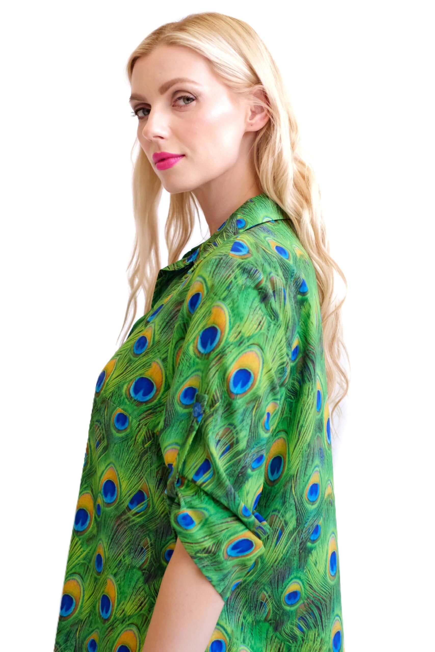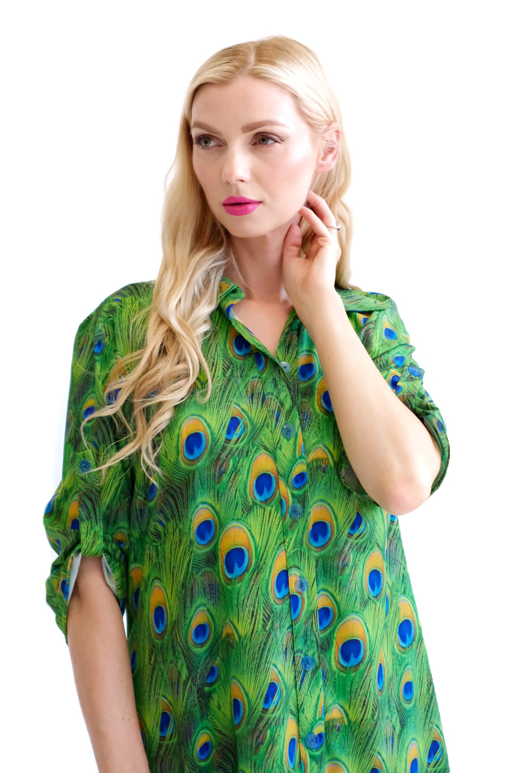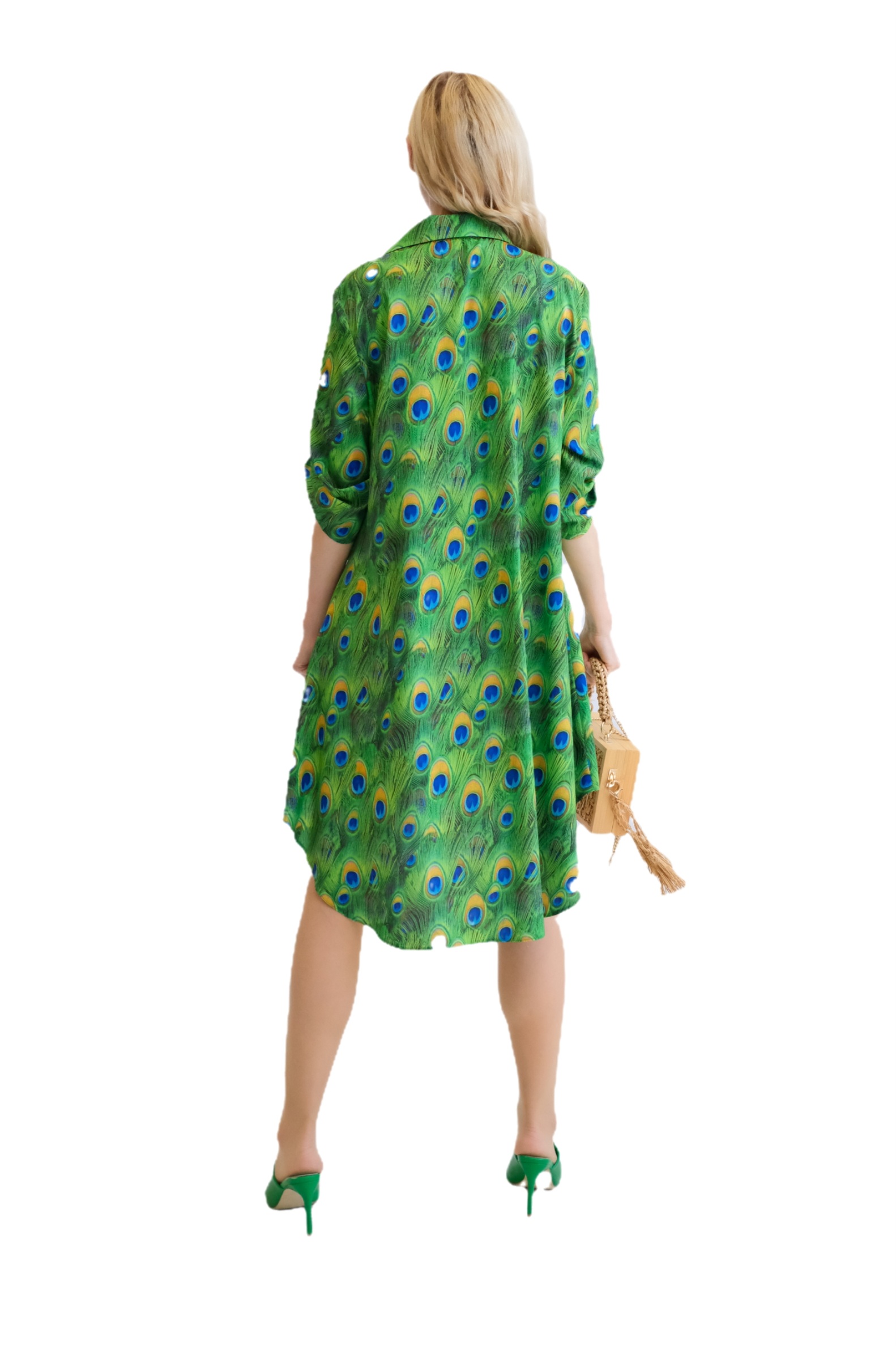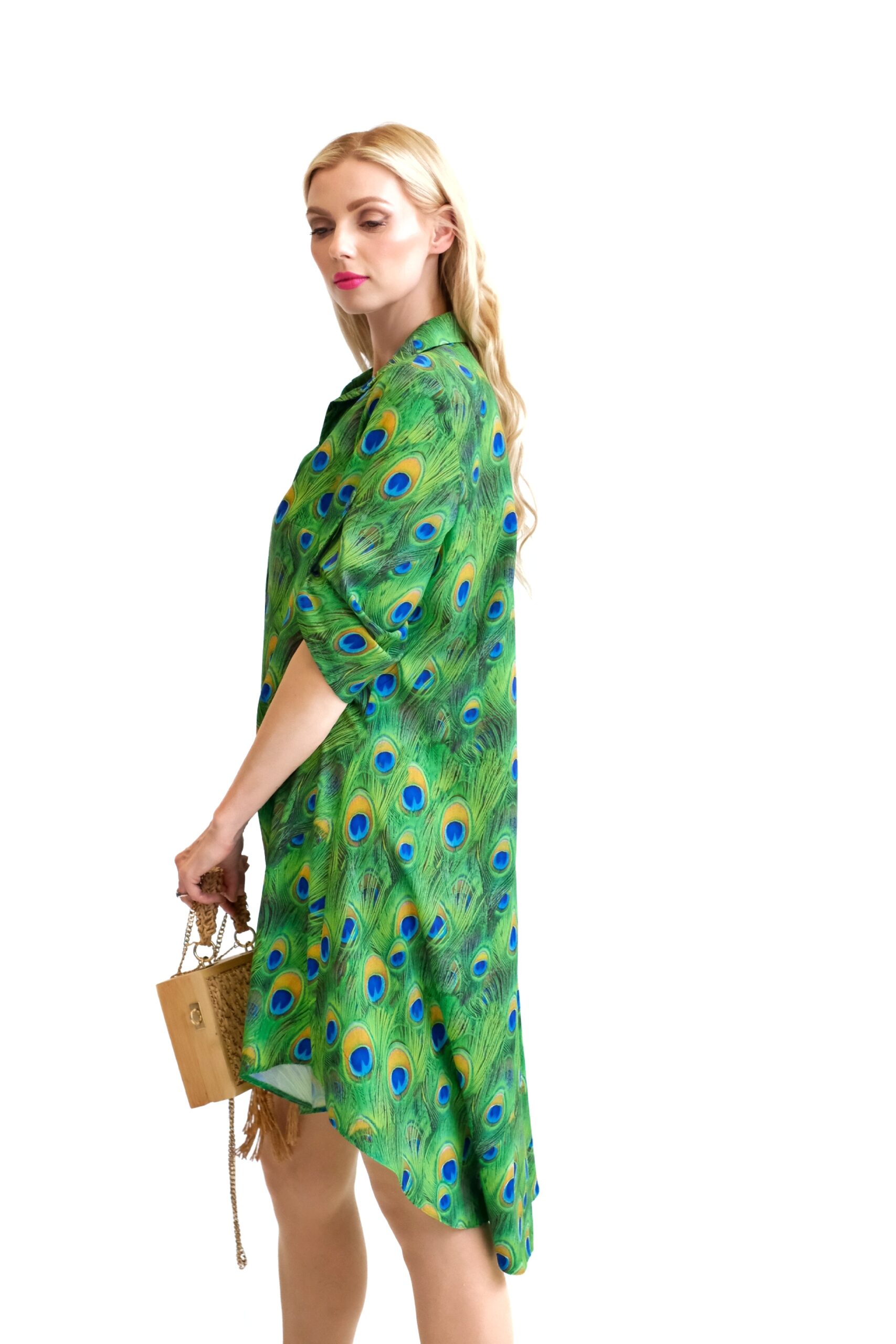 Šaty sú navrhnuté v obľúbenom košeľovom strihu, ktorý skvele sadne na každý typ postavy. Rukávy na šatách sa dajú vyhrnúť. Šaty sú asymetrický strihané, s tým že zadná časť je dlhšia ako predná. Šaty sú ušité z ľahkého, nekrčivého a vzdušného materiálu, v ktorom sa budete cítiť výborne počas horúcich letných dní. Nepriehľadnuteľným prvkom šiat je ich zaujímavý vzor vo forme pávích pier, ktorý hra odtieňmi zelenej, modrej a oranžovej. Tento vzor viete poľahky kombinovať s modrými alebo zelenými doplnkami ako naša aranžérka.