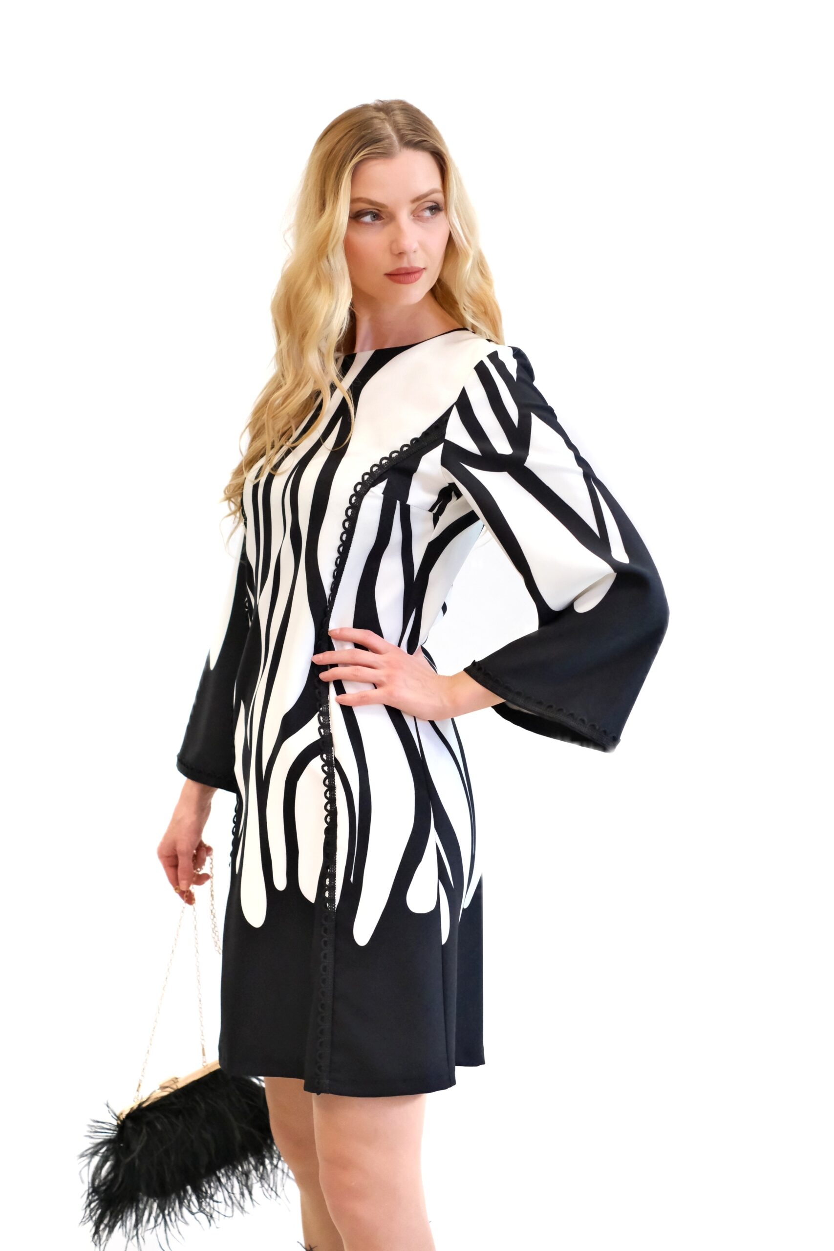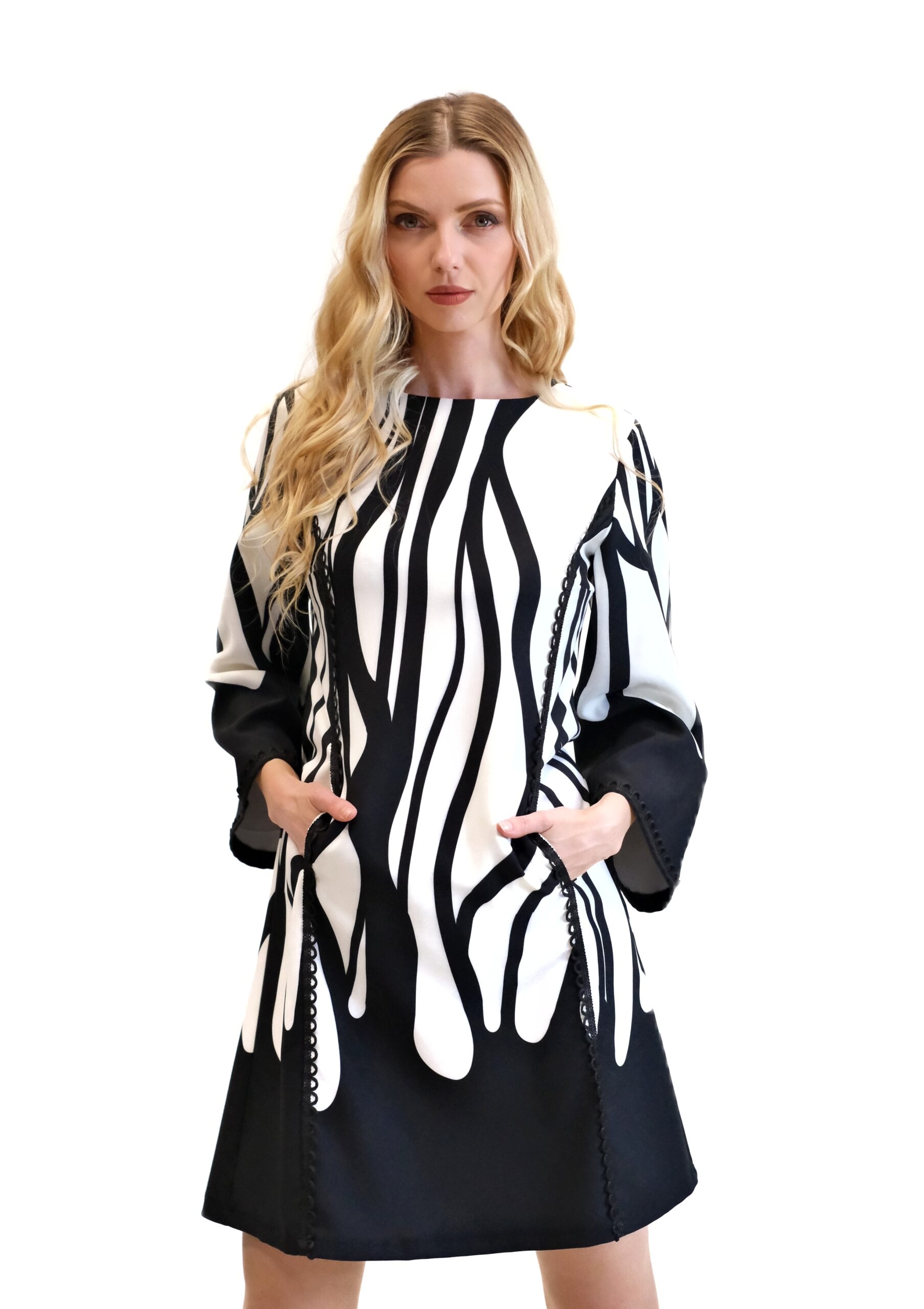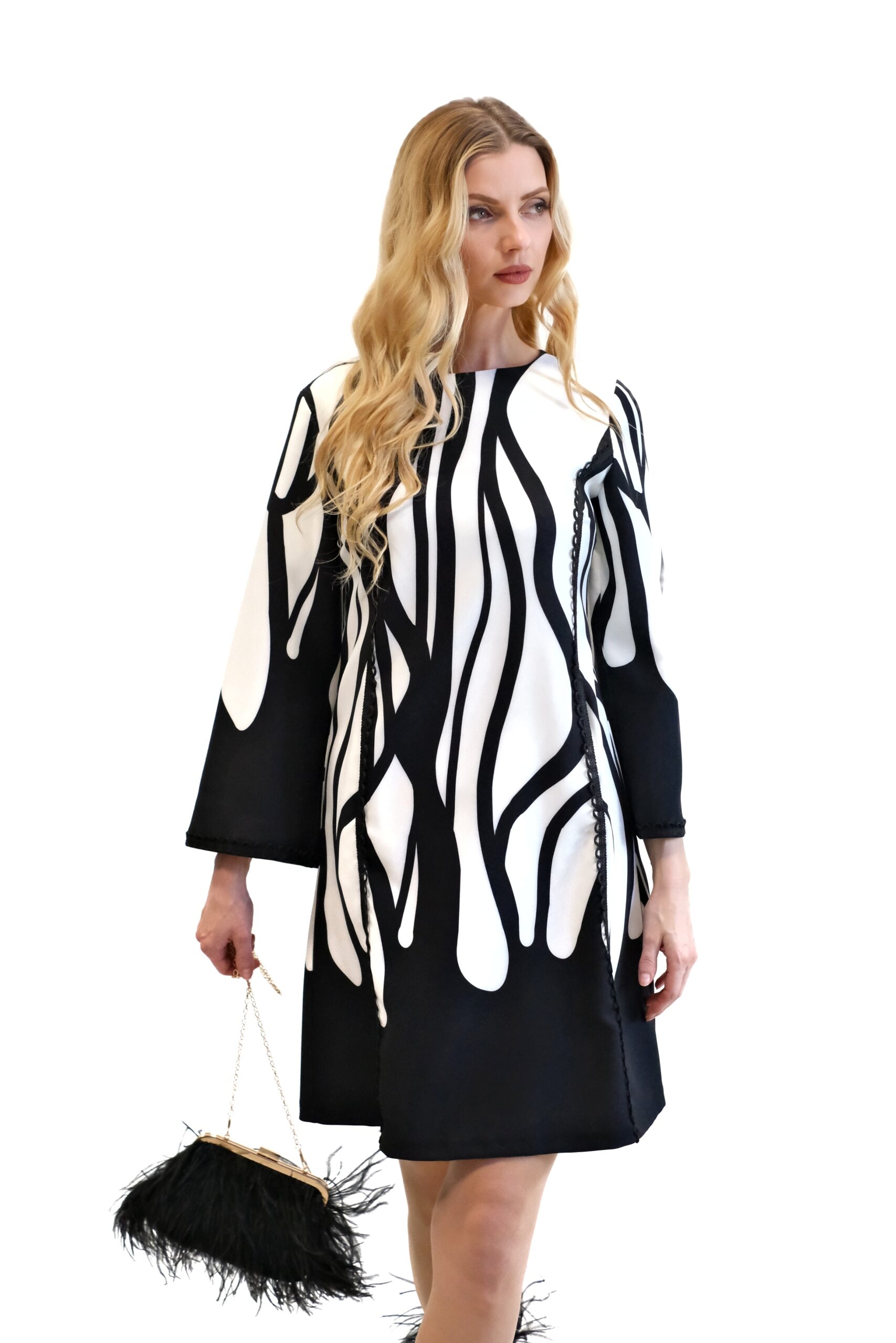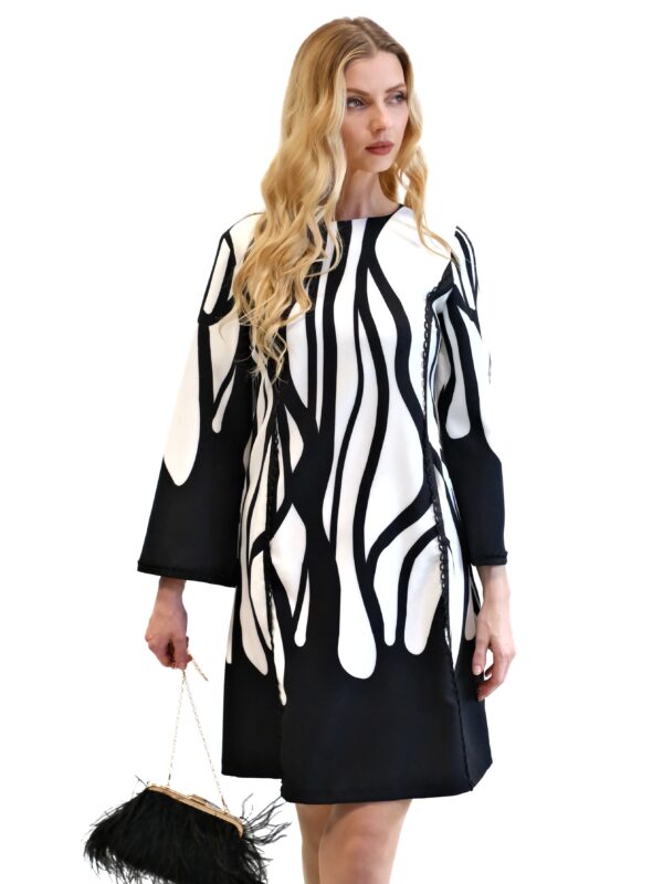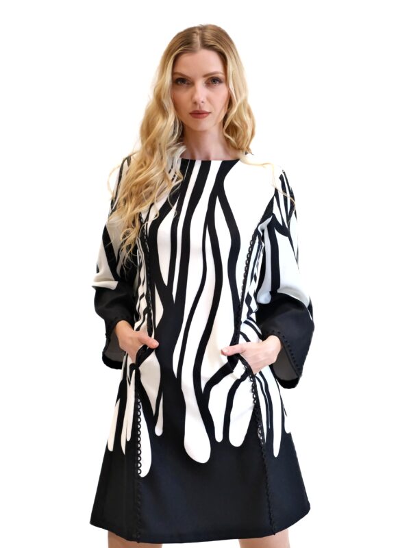 Šaty sú navrhnuté v jednoduchom áčkovom strihu, ktorý nechá výborne vyniknúť zaujímavému vzoru. Šaty sú ušité v nesmrteľnej čierno-bielej kombinácii, ktorá pripomína roztečený atrament. Zaujímavým detailom je našitý ozdobný pás na prednom dieli šiat. Šaty majú široké empirické rukávy, ktoré im dodávajú ležérny nádych. Kombinujte so širokým spektrom farieb.