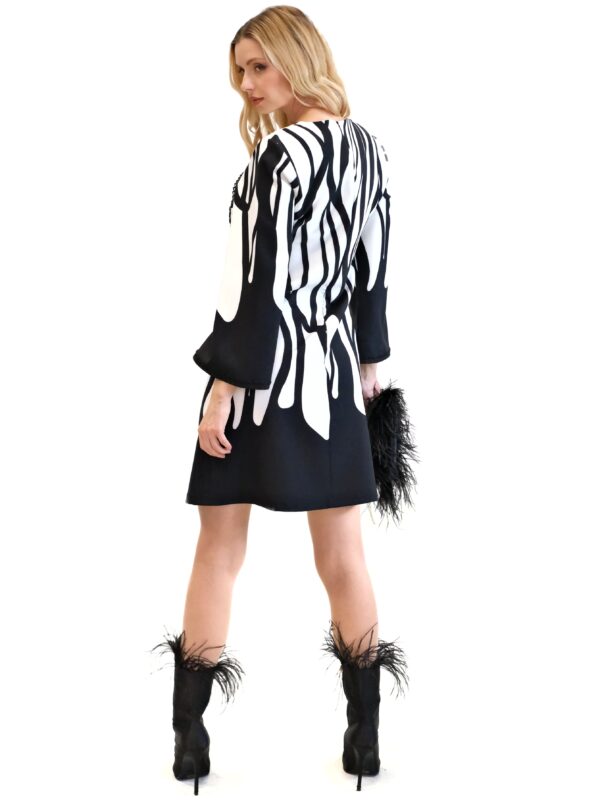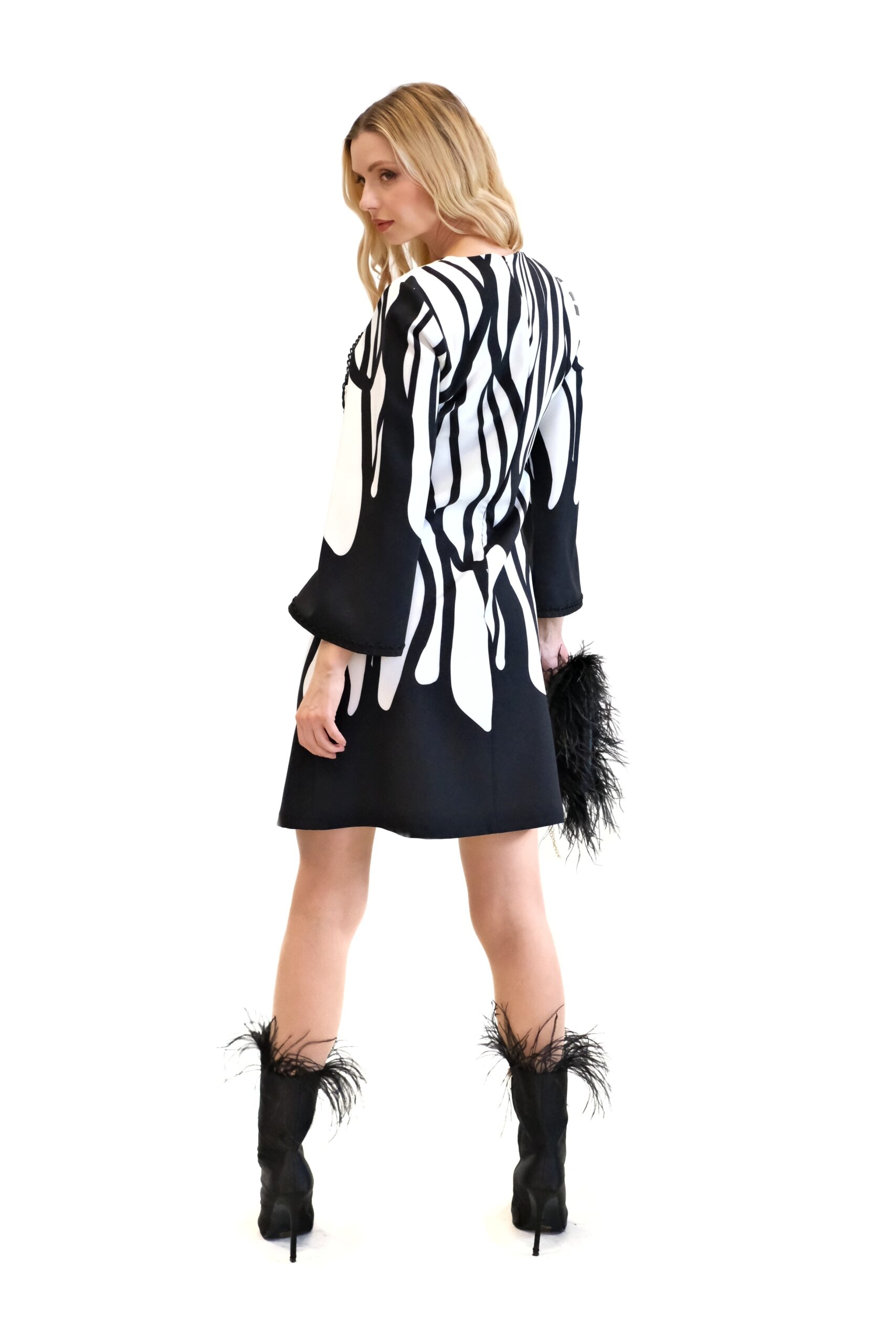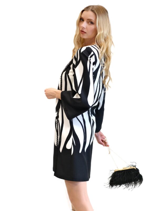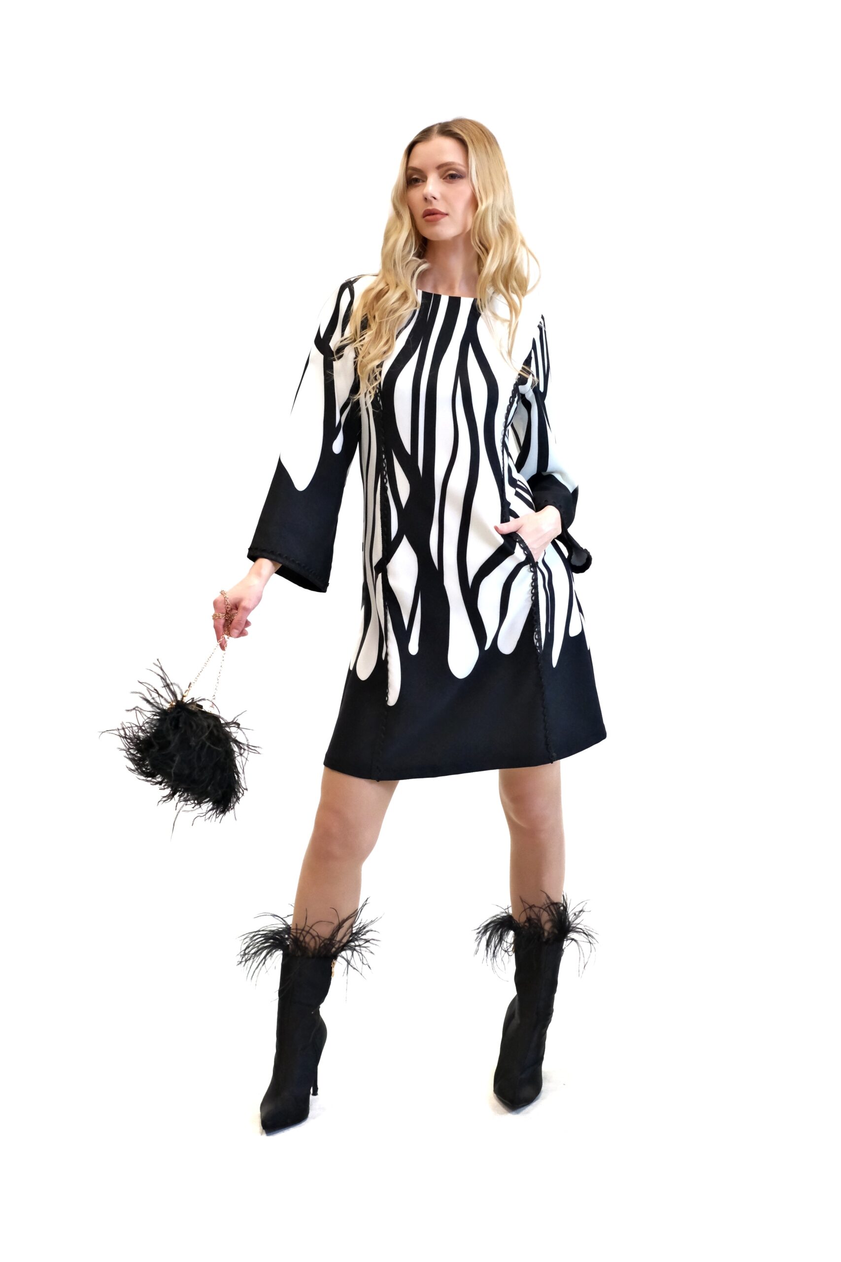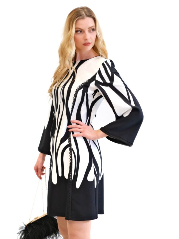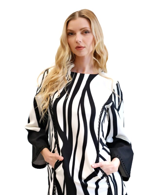 Šaty sú navrhnuté v jednoduchom áčkovom strihu, ktorý nechá výborne vyniknúť zaujímavému vzoru. Šaty sú ušité v nesmrteľnej čierno-bielej kombinácii, ktorá pripomína roztečený atrament. Zaujímavým detailom je našitý ozdobný pás na prednom dieli šiat. Šaty majú široké empirické rukávy, ktoré im dodávajú ležérny nádych. Kombinujte so širokým spektrom farieb.